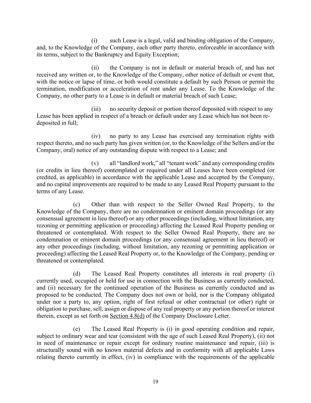 19 (i) such Lease is a legal, valid and binding obligation of the Company, and, to the Knowledge of the Company, each other party thereto, enforceable in accordance with its terms, subject to the Bankruptcy and Equity Exception; (ii) the Company is not in default or material breach of, and has not received any written or, to the Knowledge of the Company, other notice of default or event that, with the notice or lapse of time, or both would constitute a default by such Person or permit the termination, modification or acceleration of rent under any Lease. To the Knowledge of the Company, no other party to a Lease is in default or material breach of such Lease; (iii) no security deposit or portion thereof deposited with respect to any Lease has been applied in respect of a breach or default under any Lease which has not been re- deposited in full; (iv) no party to any Lease has exercised any termination rights with respect thereto, and no such party has given written (or, to the Knowledge of the Sellers and/or the Company, oral) notice of any outstanding dispute with respect to a Lease; and (v) all “landlord work,” all “tenant work” and any corresponding credits (or credits in lieu thereof) contemplated or required under all Leases have been completed (or credited, as applicable) in accordance with the applicable Lease and accepted by the Company, and no capital improvements are required to be made to any Leased Real Property pursuant to the terms of any Lease. (c) Other than with respect to the Seller Owned Real Property, to the Knowledge of the Company, there are no condemnation or eminent domain proceedings (or any consensual agreement in lieu thereof) or any other proceedings (including, without limitation, any rezoning or permitting application or proceeding) affecting the Leased Real Property pending or threatened or contemplated. With respect to the Seller Owned Real Property, there are no condemnation or eminent domain proceedings (or any consensual agreement in lieu thereof) or any other proceedings (including, without limitation, any rezoning or permitting application or proceeding) affecting the Leased Real Property or, to the Knowledge of the Company, pending or threatened or contemplated. (d) The Leased Real Property constitutes all interests in real property (i) currently used, occupied or held for use in connection with the Business as currently conducted, and (ii) necessary for the continued operation of the Business as currently conducted and as proposed to be conducted. The Company does not own or hold, nor is the Company obligated under nor a party to, any option, right of first refusal or other contractual (or other) right or obligation to purchase, sell, assign or dispose of any real property or any portion thereof or interest therein, except as set forth on Section 4.8(d) of the Company Disclosure Letter. (e) The Leased Real Property is (i) in good operating condition and repair, subject to ordinary wear and tear (consistent with the age of such Leased Real Property), (ii) not in need of maintenance or repair except for ordinary routine maintenance and repair, (iii) is structurally sound with no known material defects and in conformity with all applicable Laws relating thereto currently in effect, (iv) in compliance with the requirements of the applicable