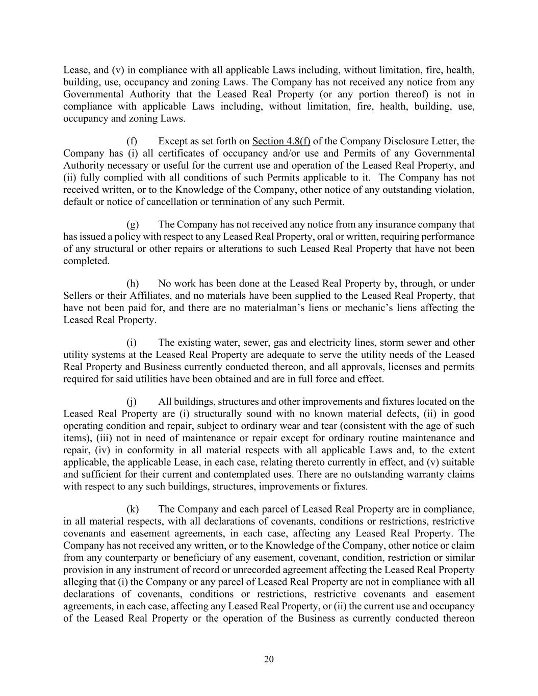 20 Lease, and (v) in compliance with all applicable Laws including, without limitation, fire, health, building, use, occupancy and zoning Laws. The Company has not received any notice from any Governmental Authority that the Leased Real Property (or any portion thereof) is not in compliance with applicable Laws including, without limitation, fire, health, building, use, occupancy and zoning Laws. (f) Except as set forth on Section 4.8(f) of the Company Disclosure Letter, the Company has (i) all certificates of occupancy and/or use and Permits of any Governmental Authority necessary or useful for the current use and operation of the Leased Real Property, and (ii) fully complied with all conditions of such Permits applicable to it. The Company has not received written, or to the Knowledge of the Company, other notice of any outstanding violation, default or notice of cancellation or termination of any such Permit. (g) The Company has not received any notice from any insurance company that has issued a policy with respect to any Leased Real Property, oral or written, requiring performance of any structural or other repairs or alterations to such Leased Real Property that have not been completed. (h) No work has been done at the Leased Real Property by, through, or under Sellers or their Affiliates, and no materials have been supplied to the Leased Real Property, that have not been paid for, and there are no materialman’s liens or mechanic’s liens affecting the Leased Real Property. (i) The existing water, sewer, gas and electricity lines, storm sewer and other utility systems at the Leased Real Property are adequate to serve the utility needs of the Leased Real Property and Business currently conducted thereon, and all approvals, licenses and permits required for said utilities have been obtained and are in full force and effect. (j) All buildings, structures and other improvements and fixtures located on the Leased Real Property are (i) structurally sound with no known material defects, (ii) in good operating condition and repair, subject to ordinary wear and tear (consistent with the age of such items), (iii) not in need of maintenance or repair except for ordinary routine maintenance and repair, (iv) in conformity in all material respects with all applicable Laws and, to the extent applicable, the applicable Lease, in each case, relating thereto currently in effect, and (v) suitable and sufficient for their current and contemplated uses. There are no outstanding warranty claims with respect to any such buildings, structures, improvements or fixtures. (k) The Company and each parcel of Leased Real Property are in compliance, in all material respects, with all declarations of covenants, conditions or restrictions, restrictive covenants and easement agreements, in each case, affecting any Leased Real Property. The Company has not received any written, or to the Knowledge of the Company, other notice or claim from any counterparty or beneficiary of any easement, covenant, condition, restriction or similar provision in any instrument of record or unrecorded agreement affecting the Leased Real Property alleging that (i) the Company or any parcel of Leased Real Property are not in compliance with all declarations of covenants, conditions or restrictions, restrictive covenants and easement agreements, in each case, affecting any Leased Real Property, or (ii) the current use and occupancy of the Leased Real Property or the operation of the Business as currently conducted thereon