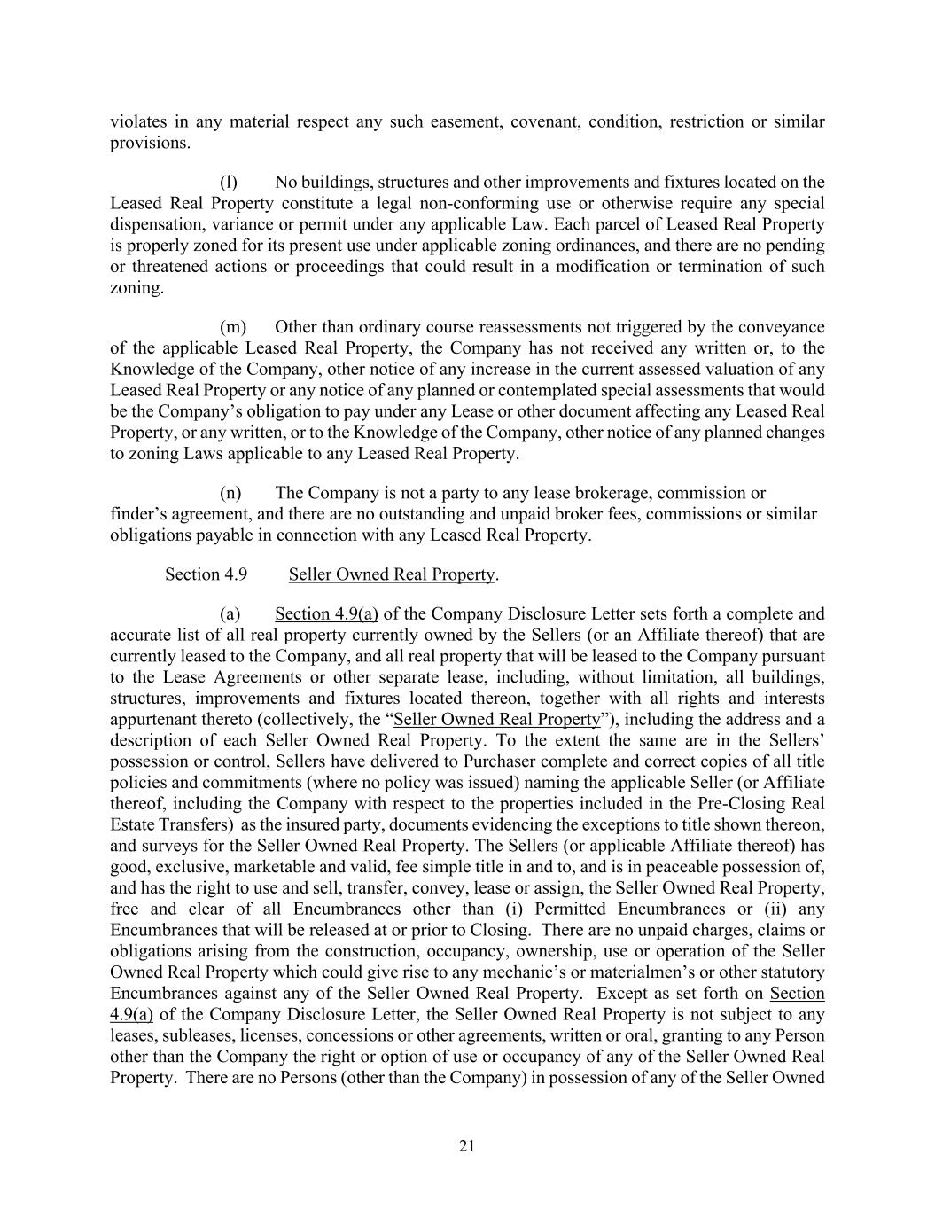 21 violates in any material respect any such easement, covenant, condition, restriction or similar provisions. (l) No buildings, structures and other improvements and fixtures located on the Leased Real Property constitute a legal non-conforming use or otherwise require any special dispensation, variance or permit under any applicable Law. Each parcel of Leased Real Property is properly zoned for its present use under applicable zoning ordinances, and there are no pending or threatened actions or proceedings that could result in a modification or termination of such zoning. (m) Other than ordinary course reassessments not triggered by the conveyance of the applicable Leased Real Property, the Company has not received any written or, to the Knowledge of the Company, other notice of any increase in the current assessed valuation of any Leased Real Property or any notice of any planned or contemplated special assessments that would be the Company’s obligation to pay under any Lease or other document affecting any Leased Real Property, or any written, or to the Knowledge of the Company, other notice of any planned changes to zoning Laws applicable to any Leased Real Property. (n) The Company is not a party to any lease brokerage, commission or finder’s agreement, and there are no outstanding and unpaid broker fees, commissions or similar obligations payable in connection with any Leased Real Property. Section 4.9 Seller Owned Real Property. (a) Section 4.9(a) of the Company Disclosure Letter sets forth a complete and accurate list of all real property currently owned by the Sellers (or an Affiliate thereof) that are currently leased to the Company, and all real property that will be leased to the Company pursuant to the Lease Agreements or other separate lease, including, without limitation, all buildings, structures, improvements and fixtures located thereon, together with all rights and interests appurtenant thereto (collectively, the “Seller Owned Real Property”), including the address and a description of each Seller Owned Real Property. To the extent the same are in the Sellers’ possession or control, Sellers have delivered to Purchaser complete and correct copies of all title policies and commitments (where no policy was issued) naming the applicable Seller (or Affiliate thereof, including the Company with respect to the properties included in the Pre-Closing Real Estate Transfers) as the insured party, documents evidencing the exceptions to title shown thereon, and surveys for the Seller Owned Real Property. The Sellers (or applicable Affiliate thereof) has good, exclusive, marketable and valid, fee simple title in and to, and is in peaceable possession of, and has the right to use and sell, transfer, convey, lease or assign, the Seller Owned Real Property, free and clear of all Encumbrances other than (i) Permitted Encumbrances or (ii) any Encumbrances that will be released at or prior to Closing. There are no unpaid charges, claims or obligations arising from the construction, occupancy, ownership, use or operation of the Seller Owned Real Property which could give rise to any mechanic’s or materialmen’s or other statutory Encumbrances against any of the Seller Owned Real Property. Except as set forth on Section 4.9(a) of the Company Disclosure Letter, the Seller Owned Real Property is not subject to any leases, subleases, licenses, concessions or other agreements, written or oral, granting to any Person other than the Company the right or option of use or occupancy of any of the Seller Owned Real Property. There are no Persons (other than the Company) in possession of any of the Seller Owned