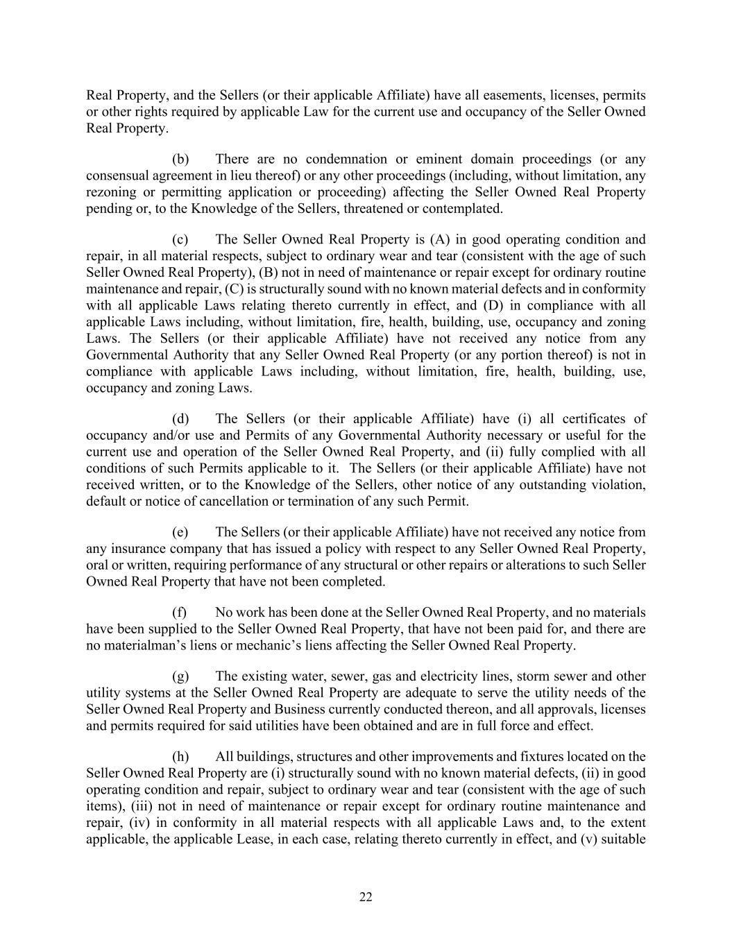 22 Real Property, and the Sellers (or their applicable Affiliate) have all easements, licenses, permits or other rights required by applicable Law for the current use and occupancy of the Seller Owned Real Property. (b) There are no condemnation or eminent domain proceedings (or any consensual agreement in lieu thereof) or any other proceedings (including, without limitation, any rezoning or permitting application or proceeding) affecting the Seller Owned Real Property pending or, to the Knowledge of the Sellers, threatened or contemplated. (c) The Seller Owned Real Property is (A) in good operating condition and repair, in all material respects, subject to ordinary wear and tear (consistent with the age of such Seller Owned Real Property), (B) not in need of maintenance or repair except for ordinary routine maintenance and repair, (C) is structurally sound with no known material defects and in conformity with all applicable Laws relating thereto currently in effect, and (D) in compliance with all applicable Laws including, without limitation, fire, health, building, use, occupancy and zoning Laws. The Sellers (or their applicable Affiliate) have not received any notice from any Governmental Authority that any Seller Owned Real Property (or any portion thereof) is not in compliance with applicable Laws including, without limitation, fire, health, building, use, occupancy and zoning Laws. (d) The Sellers (or their applicable Affiliate) have (i) all certificates of occupancy and/or use and Permits of any Governmental Authority necessary or useful for the current use and operation of the Seller Owned Real Property, and (ii) fully complied with all conditions of such Permits applicable to it. The Sellers (or their applicable Affiliate) have not received written, or to the Knowledge of the Sellers, other notice of any outstanding violation, default or notice of cancellation or termination of any such Permit. (e) The Sellers (or their applicable Affiliate) have not received any notice from any insurance company that has issued a policy with respect to any Seller Owned Real Property, oral or written, requiring performance of any structural or other repairs or alterations to such Seller Owned Real Property that have not been completed. (f) No work has been done at the Seller Owned Real Property, and no materials have been supplied to the Seller Owned Real Property, that have not been paid for, and there are no materialman’s liens or mechanic’s liens affecting the Seller Owned Real Property. (g) The existing water, sewer, gas and electricity lines, storm sewer and other utility systems at the Seller Owned Real Property are adequate to serve the utility needs of the Seller Owned Real Property and Business currently conducted thereon, and all approvals, licenses and permits required for said utilities have been obtained and are in full force and effect. (h) All buildings, structures and other improvements and fixtures located on the Seller Owned Real Property are (i) structurally sound with no known material defects, (ii) in good operating condition and repair, subject to ordinary wear and tear (consistent with the age of such items), (iii) not in need of maintenance or repair except for ordinary routine maintenance and repair, (iv) in conformity in all material respects with all applicable Laws and, to the extent applicable, the applicable Lease, in each case, relating thereto currently in effect, and (v) suitable