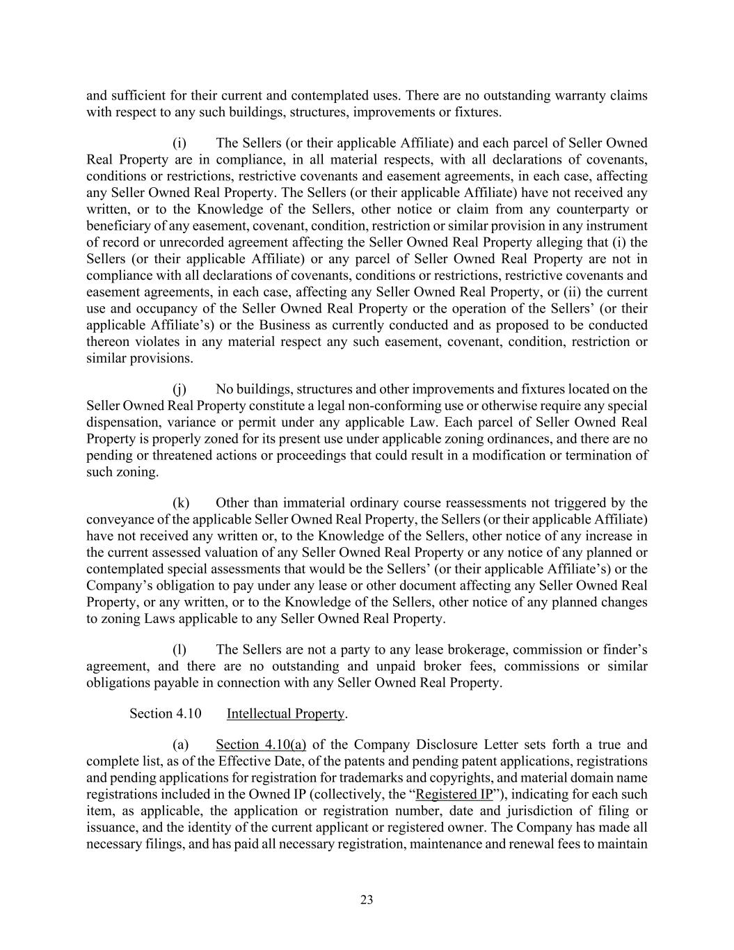 23 and sufficient for their current and contemplated uses. There are no outstanding warranty claims with respect to any such buildings, structures, improvements or fixtures. (i) The Sellers (or their applicable Affiliate) and each parcel of Seller Owned Real Property are in compliance, in all material respects, with all declarations of covenants, conditions or restrictions, restrictive covenants and easement agreements, in each case, affecting any Seller Owned Real Property. The Sellers (or their applicable Affiliate) have not received any written, or to the Knowledge of the Sellers, other notice or claim from any counterparty or beneficiary of any easement, covenant, condition, restriction or similar provision in any instrument of record or unrecorded agreement affecting the Seller Owned Real Property alleging that (i) the Sellers (or their applicable Affiliate) or any parcel of Seller Owned Real Property are not in compliance with all declarations of covenants, conditions or restrictions, restrictive covenants and easement agreements, in each case, affecting any Seller Owned Real Property, or (ii) the current use and occupancy of the Seller Owned Real Property or the operation of the Sellers’ (or their applicable Affiliate’s) or the Business as currently conducted and as proposed to be conducted thereon violates in any material respect any such easement, covenant, condition, restriction or similar provisions. (j) No buildings, structures and other improvements and fixtures located on the Seller Owned Real Property constitute a legal non-conforming use or otherwise require any special dispensation, variance or permit under any applicable Law. Each parcel of Seller Owned Real Property is properly zoned for its present use under applicable zoning ordinances, and there are no pending or threatened actions or proceedings that could result in a modification or termination of such zoning. (k) Other than immaterial ordinary course reassessments not triggered by the conveyance of the applicable Seller Owned Real Property, the Sellers (or their applicable Affiliate) have not received any written or, to the Knowledge of the Sellers, other notice of any increase in the current assessed valuation of any Seller Owned Real Property or any notice of any planned or contemplated special assessments that would be the Sellers’ (or their applicable Affiliate’s) or the Company’s obligation to pay under any lease or other document affecting any Seller Owned Real Property, or any written, or to the Knowledge of the Sellers, other notice of any planned changes to zoning Laws applicable to any Seller Owned Real Property. (l) The Sellers are not a party to any lease brokerage, commission or finder’s agreement, and there are no outstanding and unpaid broker fees, commissions or similar obligations payable in connection with any Seller Owned Real Property. Section 4.10 Intellectual Property. (a) Section 4.10(a) of the Company Disclosure Letter sets forth a true and complete list, as of the Effective Date, of the patents and pending patent applications, registrations and pending applications for registration for trademarks and copyrights, and material domain name registrations included in the Owned IP (collectively, the “Registered IP”), indicating for each such item, as applicable, the application or registration number, date and jurisdiction of filing or issuance, and the identity of the current applicant or registered owner. The Company has made all necessary filings, and has paid all necessary registration, maintenance and renewal fees to maintain