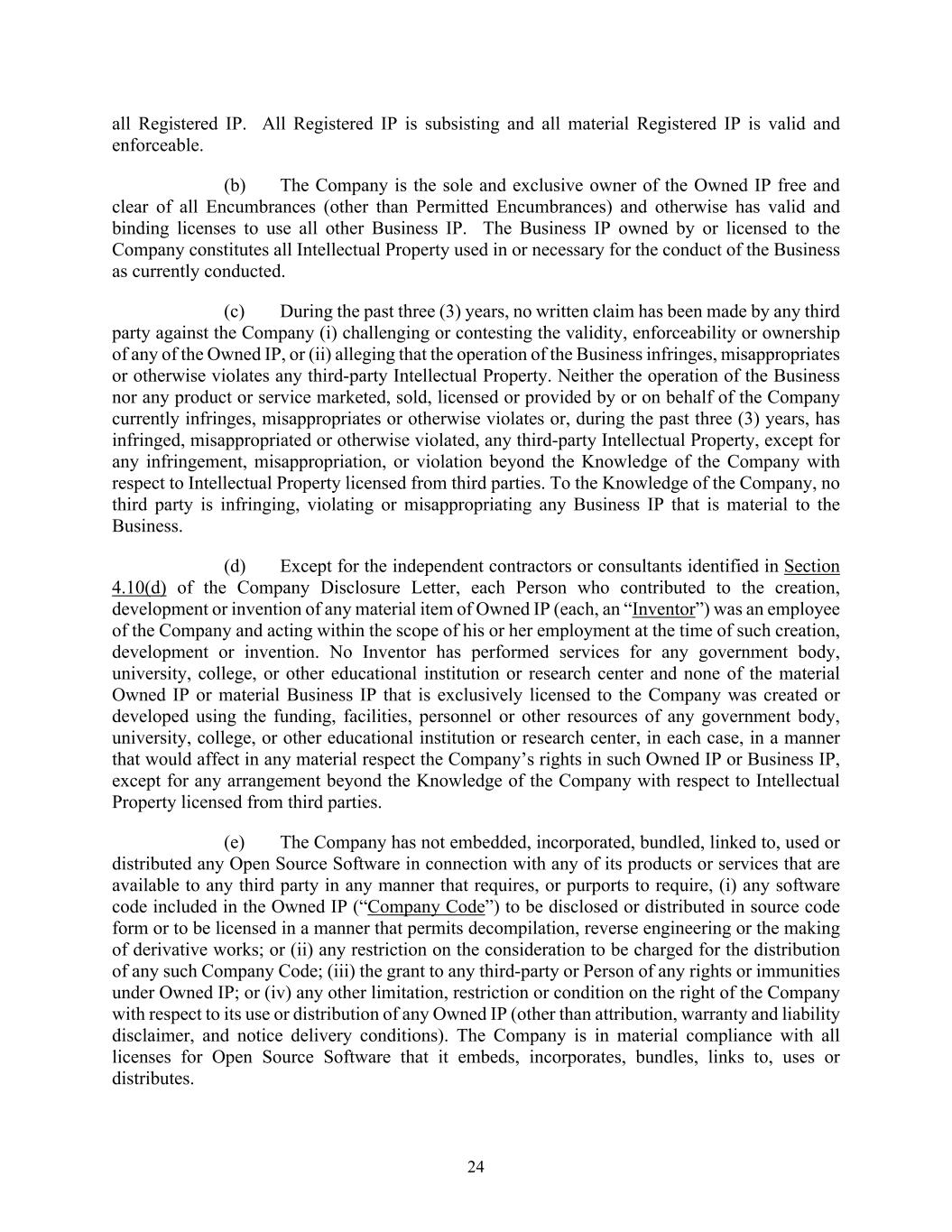 24 all Registered IP. All Registered IP is subsisting and all material Registered IP is valid and enforceable. (b) The Company is the sole and exclusive owner of the Owned IP free and clear of all Encumbrances (other than Permitted Encumbrances) and otherwise has valid and binding licenses to use all other Business IP. The Business IP owned by or licensed to the Company constitutes all Intellectual Property used in or necessary for the conduct of the Business as currently conducted. (c) During the past three (3) years, no written claim has been made by any third party against the Company (i) challenging or contesting the validity, enforceability or ownership of any of the Owned IP, or (ii) alleging that the operation of the Business infringes, misappropriates or otherwise violates any third-party Intellectual Property. Neither the operation of the Business nor any product or service marketed, sold, licensed or provided by or on behalf of the Company currently infringes, misappropriates or otherwise violates or, during the past three (3) years, has infringed, misappropriated or otherwise violated, any third-party Intellectual Property, except for any infringement, misappropriation, or violation beyond the Knowledge of the Company with respect to Intellectual Property licensed from third parties. To the Knowledge of the Company, no third party is infringing, violating or misappropriating any Business IP that is material to the Business. (d) Except for the independent contractors or consultants identified in Section 4.10(d) of the Company Disclosure Letter, each Person who contributed to the creation, development or invention of any material item of Owned IP (each, an “Inventor”) was an employee of the Company and acting within the scope of his or her employment at the time of such creation, development or invention. No Inventor has performed services for any government body, university, college, or other educational institution or research center and none of the material Owned IP or material Business IP that is exclusively licensed to the Company was created or developed using the funding, facilities, personnel or other resources of any government body, university, college, or other educational institution or research center, in each case, in a manner that would affect in any material respect the Company’s rights in such Owned IP or Business IP, except for any arrangement beyond the Knowledge of the Company with respect to Intellectual Property licensed from third parties. (e) The Company has not embedded, incorporated, bundled, linked to, used or distributed any Open Source Software in connection with any of its products or services that are available to any third party in any manner that requires, or purports to require, (i) any software code included in the Owned IP (“Company Code”) to be disclosed or distributed in source code form or to be licensed in a manner that permits decompilation, reverse engineering or the making of derivative works; or (ii) any restriction on the consideration to be charged for the distribution of any such Company Code; (iii) the grant to any third-party or Person of any rights or immunities under Owned IP; or (iv) any other limitation, restriction or condition on the right of the Company with respect to its use or distribution of any Owned IP (other than attribution, warranty and liability disclaimer, and notice delivery conditions). The Company is in material compliance with all licenses for Open Source Software that it embeds, incorporates, bundles, links to, uses or distributes.