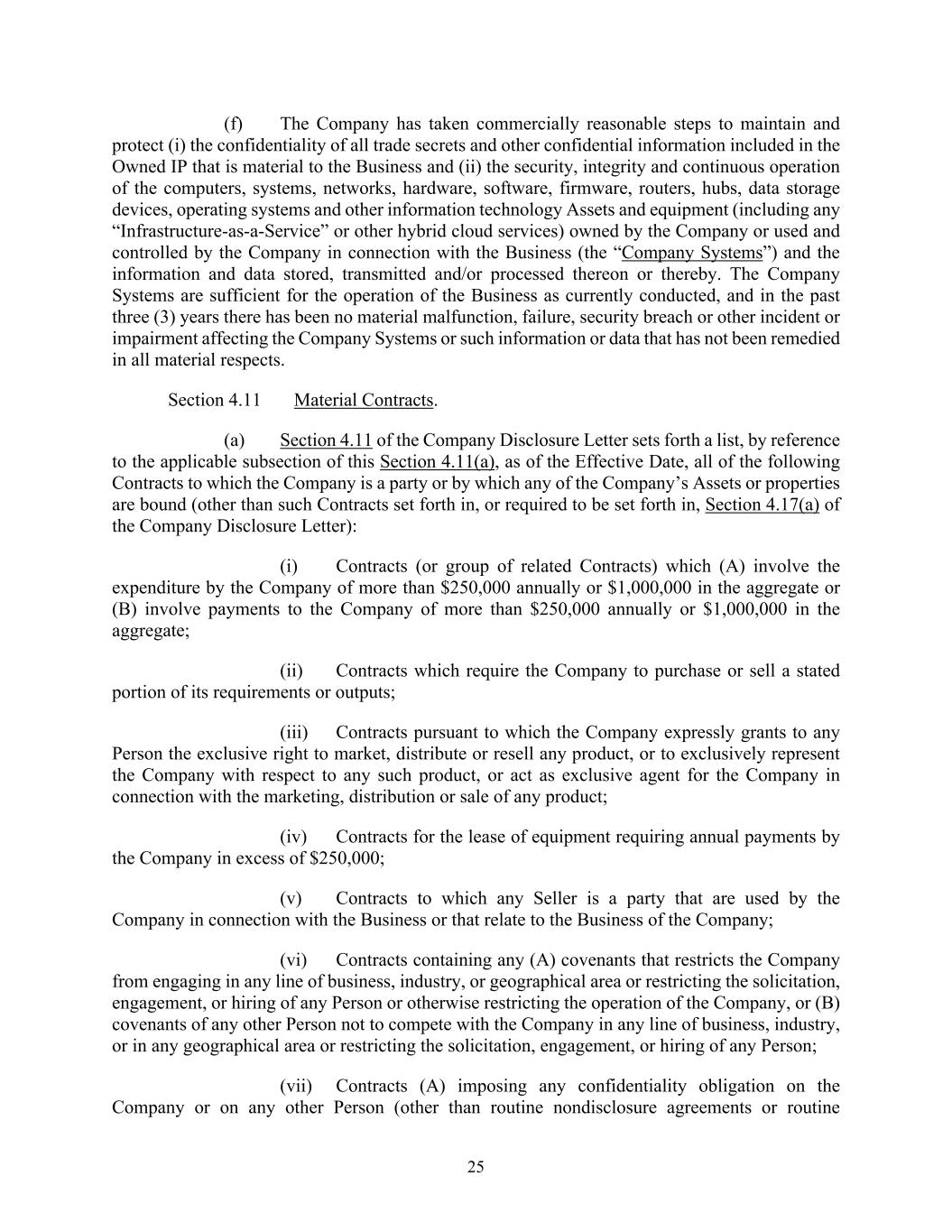 25 (f) The Company has taken commercially reasonable steps to maintain and protect (i) the confidentiality of all trade secrets and other confidential information included in the Owned IP that is material to the Business and (ii) the security, integrity and continuous operation of the computers, systems, networks, hardware, software, firmware, routers, hubs, data storage devices, operating systems and other information technology Assets and equipment (including any “Infrastructure-as-a-Service” or other hybrid cloud services) owned by the Company or used and controlled by the Company in connection with the Business (the “Company Systems”) and the information and data stored, transmitted and/or processed thereon or thereby. The Company Systems are sufficient for the operation of the Business as currently conducted, and in the past three (3) years there has been no material malfunction, failure, security breach or other incident or impairment affecting the Company Systems or such information or data that has not been remedied in all material respects. Section 4.11 Material Contracts. (a) Section 4.11 of the Company Disclosure Letter sets forth a list, by reference to the applicable subsection of this Section 4.11(a), as of the Effective Date, all of the following Contracts to which the Company is a party or by which any of the Company’s Assets or properties are bound (other than such Contracts set forth in, or required to be set forth in, Section 4.17(a) of the Company Disclosure Letter): (i) Contracts (or group of related Contracts) which (A) involve the expenditure by the Company of more than $250,000 annually or $1,000,000 in the aggregate or (B) involve payments to the Company of more than $250,000 annually or $1,000,000 in the aggregate; (ii) Contracts which require the Company to purchase or sell a stated portion of its requirements or outputs; (iii) Contracts pursuant to which the Company expressly grants to any Person the exclusive right to market, distribute or resell any product, or to exclusively represent the Company with respect to any such product, or act as exclusive agent for the Company in connection with the marketing, distribution or sale of any product; (iv) Contracts for the lease of equipment requiring annual payments by the Company in excess of $250,000; (v) Contracts to which any Seller is a party that are used by the Company in connection with the Business or that relate to the Business of the Company; (vi) Contracts containing any (A) covenants that restricts the Company from engaging in any line of business, industry, or geographical area or restricting the solicitation, engagement, or hiring of any Person or otherwise restricting the operation of the Company, or (B) covenants of any other Person not to compete with the Company in any line of business, industry, or in any geographical area or restricting the solicitation, engagement, or hiring of any Person; (vii) Contracts (A) imposing any confidentiality obligation on the Company or on any other Person (other than routine nondisclosure agreements or routine