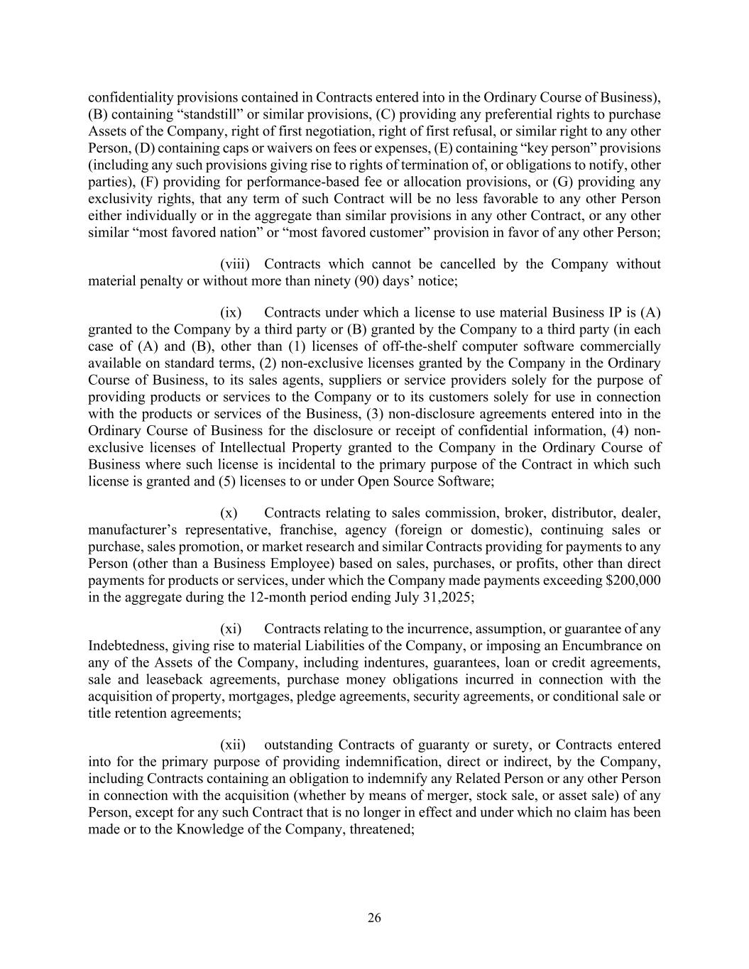 26 confidentiality provisions contained in Contracts entered into in the Ordinary Course of Business), (B) containing “standstill” or similar provisions, (C) providing any preferential rights to purchase Assets of the Company, right of first negotiation, right of first refusal, or similar right to any other Person, (D) containing caps or waivers on fees or expenses, (E) containing “key person” provisions (including any such provisions giving rise to rights of termination of, or obligations to notify, other parties), (F) providing for performance-based fee or allocation provisions, or (G) providing any exclusivity rights, that any term of such Contract will be no less favorable to any other Person either individually or in the aggregate than similar provisions in any other Contract, or any other similar “most favored nation” or “most favored customer” provision in favor of any other Person; (viii) Contracts which cannot be cancelled by the Company without material penalty or without more than ninety (90) days’ notice; (ix) Contracts under which a license to use material Business IP is (A) granted to the Company by a third party or (B) granted by the Company to a third party (in each case of (A) and (B), other than (1) licenses of off-the-shelf computer software commercially available on standard terms, (2) non-exclusive licenses granted by the Company in the Ordinary Course of Business, to its sales agents, suppliers or service providers solely for the purpose of providing products or services to the Company or to its customers solely for use in connection with the products or services of the Business, (3) non-disclosure agreements entered into in the Ordinary Course of Business for the disclosure or receipt of confidential information, (4) non- exclusive licenses of Intellectual Property granted to the Company in the Ordinary Course of Business where such license is incidental to the primary purpose of the Contract in which such license is granted and (5) licenses to or under Open Source Software; (x) Contracts relating to sales commission, broker, distributor, dealer, manufacturer’s representative, franchise, agency (foreign or domestic), continuing sales or purchase, sales promotion, or market research and similar Contracts providing for payments to any Person (other than a Business Employee) based on sales, purchases, or profits, other than direct payments for products or services, under which the Company made payments exceeding $200,000 in the aggregate during the 12-month period ending July 31,2025; (xi) Contracts relating to the incurrence, assumption, or guarantee of any Indebtedness, giving rise to material Liabilities of the Company, or imposing an Encumbrance on any of the Assets of the Company, including indentures, guarantees, loan or credit agreements, sale and leaseback agreements, purchase money obligations incurred in connection with the acquisition of property, mortgages, pledge agreements, security agreements, or conditional sale or title retention agreements; (xii) outstanding Contracts of guaranty or surety, or Contracts entered into for the primary purpose of providing indemnification, direct or indirect, by the Company, including Contracts containing an obligation to indemnify any Related Person or any other Person in connection with the acquisition (whether by means of merger, stock sale, or asset sale) of any Person, except for any such Contract that is no longer in effect and under which no claim has been made or to the Knowledge of the Company, threatened;