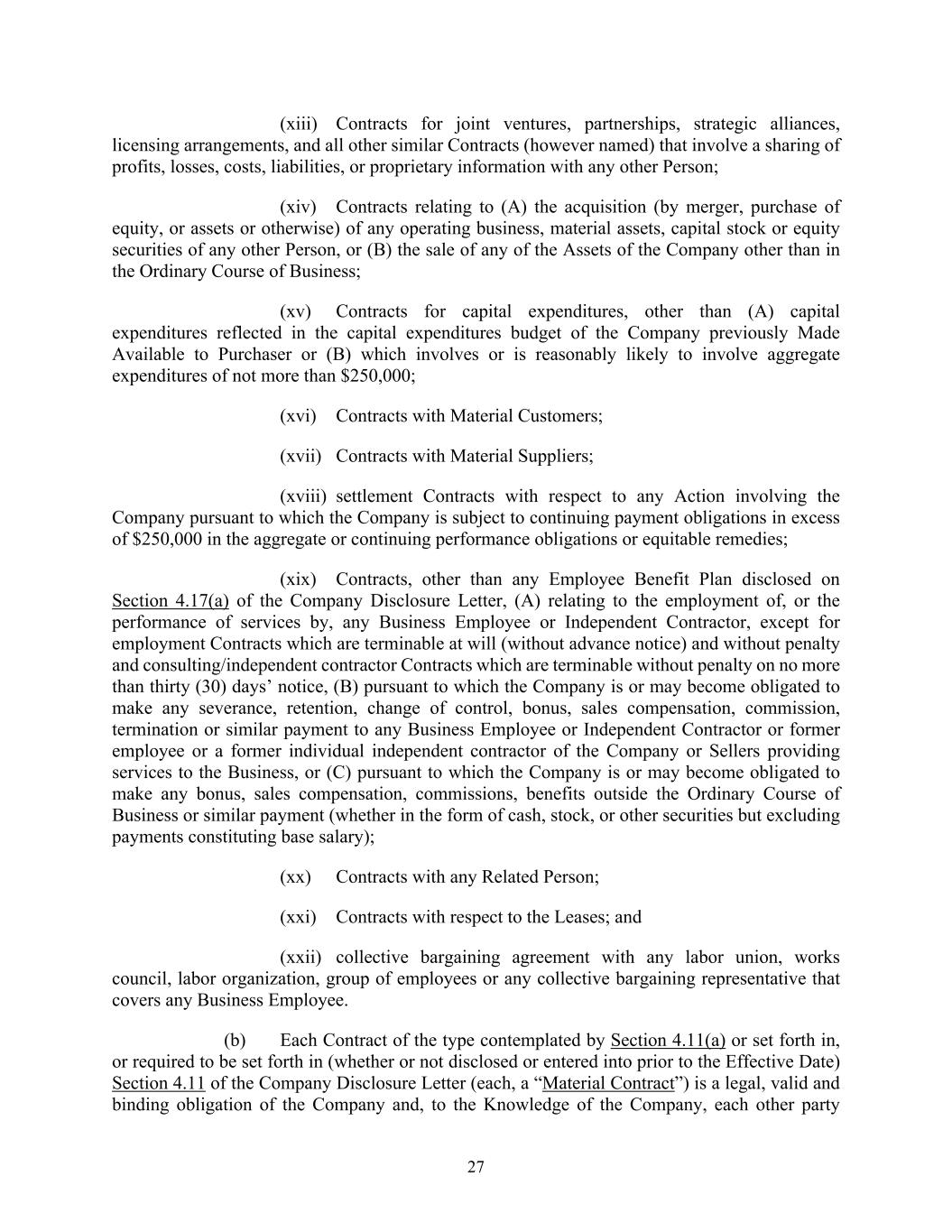 27 (xiii) Contracts for joint ventures, partnerships, strategic alliances, licensing arrangements, and all other similar Contracts (however named) that involve a sharing of profits, losses, costs, liabilities, or proprietary information with any other Person; (xiv) Contracts relating to (A) the acquisition (by merger, purchase of equity, or assets or otherwise) of any operating business, material assets, capital stock or equity securities of any other Person, or (B) the sale of any of the Assets of the Company other than in the Ordinary Course of Business; (xv) Contracts for capital expenditures, other than (A) capital expenditures reflected in the capital expenditures budget of the Company previously Made Available to Purchaser or (B) which involves or is reasonably likely to involve aggregate expenditures of not more than $250,000; (xvi) Contracts with Material Customers; (xvii) Contracts with Material Suppliers; (xviii) settlement Contracts with respect to any Action involving the Company pursuant to which the Company is subject to continuing payment obligations in excess of $250,000 in the aggregate or continuing performance obligations or equitable remedies; (xix) Contracts, other than any Employee Benefit Plan disclosed on Section 4.17(a) of the Company Disclosure Letter, (A) relating to the employment of, or the performance of services by, any Business Employee or Independent Contractor, except for employment Contracts which are terminable at will (without advance notice) and without penalty and consulting/independent contractor Contracts which are terminable without penalty on no more than thirty (30) days’ notice, (B) pursuant to which the Company is or may become obligated to make any severance, retention, change of control, bonus, sales compensation, commission, termination or similar payment to any Business Employee or Independent Contractor or former employee or a former individual independent contractor of the Company or Sellers providing services to the Business, or (C) pursuant to which the Company is or may become obligated to make any bonus, sales compensation, commissions, benefits outside the Ordinary Course of Business or similar payment (whether in the form of cash, stock, or other securities but excluding payments constituting base salary); (xx) Contracts with any Related Person; (xxi) Contracts with respect to the Leases; and (xxii) collective bargaining agreement with any labor union, works council, labor organization, group of employees or any collective bargaining representative that covers any Business Employee. (b) Each Contract of the type contemplated by Section 4.11(a) or set forth in, or required to be set forth in (whether or not disclosed or entered into prior to the Effective Date) Section 4.11 of the Company Disclosure Letter (each, a “Material Contract”) is a legal, valid and binding obligation of the Company and, to the Knowledge of the Company, each other party