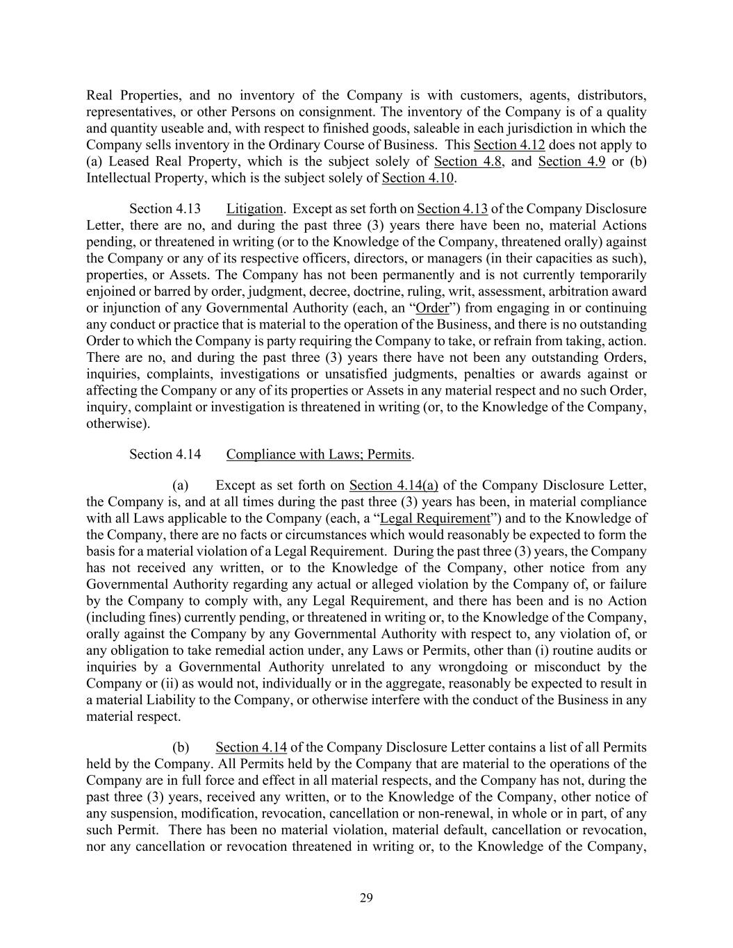 29 Real Properties, and no inventory of the Company is with customers, agents, distributors, representatives, or other Persons on consignment. The inventory of the Company is of a quality and quantity useable and, with respect to finished goods, saleable in each jurisdiction in which the Company sells inventory in the Ordinary Course of Business. This Section 4.12 does not apply to (a) Leased Real Property, which is the subject solely of Section 4.8, and Section 4.9 or (b) Intellectual Property, which is the subject solely of Section 4.10. Section 4.13 Litigation. Except as set forth on Section 4.13 of the Company Disclosure Letter, there are no, and during the past three (3) years there have been no, material Actions pending, or threatened in writing (or to the Knowledge of the Company, threatened orally) against the Company or any of its respective officers, directors, or managers (in their capacities as such), properties, or Assets. The Company has not been permanently and is not currently temporarily enjoined or barred by order, judgment, decree, doctrine, ruling, writ, assessment, arbitration award or injunction of any Governmental Authority (each, an “Order”) from engaging in or continuing any conduct or practice that is material to the operation of the Business, and there is no outstanding Order to which the Company is party requiring the Company to take, or refrain from taking, action. There are no, and during the past three (3) years there have not been any outstanding Orders, inquiries, complaints, investigations or unsatisfied judgments, penalties or awards against or affecting the Company or any of its properties or Assets in any material respect and no such Order, inquiry, complaint or investigation is threatened in writing (or, to the Knowledge of the Company, otherwise). Section 4.14 Compliance with Laws; Permits. (a) Except as set forth on Section 4.14(a) of the Company Disclosure Letter, the Company is, and at all times during the past three (3) years has been, in material compliance with all Laws applicable to the Company (each, a “Legal Requirement”) and to the Knowledge of the Company, there are no facts or circumstances which would reasonably be expected to form the basis for a material violation of a Legal Requirement. During the past three (3) years, the Company has not received any written, or to the Knowledge of the Company, other notice from any Governmental Authority regarding any actual or alleged violation by the Company of, or failure by the Company to comply with, any Legal Requirement, and there has been and is no Action (including fines) currently pending, or threatened in writing or, to the Knowledge of the Company, orally against the Company by any Governmental Authority with respect to, any violation of, or any obligation to take remedial action under, any Laws or Permits, other than (i) routine audits or inquiries by a Governmental Authority unrelated to any wrongdoing or misconduct by the Company or (ii) as would not, individually or in the aggregate, reasonably be expected to result in a material Liability to the Company, or otherwise interfere with the conduct of the Business in any material respect. (b) Section 4.14 of the Company Disclosure Letter contains a list of all Permits held by the Company. All Permits held by the Company that are material to the operations of the Company are in full force and effect in all material respects, and the Company has not, during the past three (3) years, received any written, or to the Knowledge of the Company, other notice of any suspension, modification, revocation, cancellation or non-renewal, in whole or in part, of any such Permit. There has been no material violation, material default, cancellation or revocation, nor any cancellation or revocation threatened in writing or, to the Knowledge of the Company,