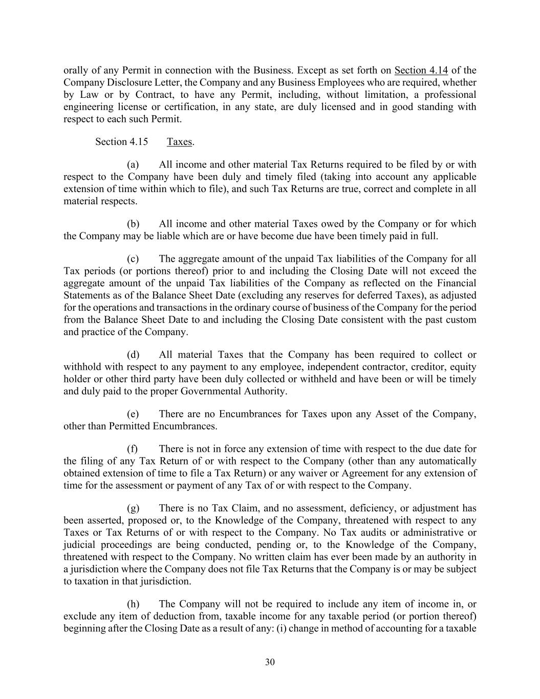 30 orally of any Permit in connection with the Business. Except as set forth on Section 4.14 of the Company Disclosure Letter, the Company and any Business Employees who are required, whether by Law or by Contract, to have any Permit, including, without limitation, a professional engineering license or certification, in any state, are duly licensed and in good standing with respect to each such Permit. Section 4.15 Taxes. (a) All income and other material Tax Returns required to be filed by or with respect to the Company have been duly and timely filed (taking into account any applicable extension of time within which to file), and such Tax Returns are true, correct and complete in all material respects. (b) All income and other material Taxes owed by the Company or for which the Company may be liable which are or have become due have been timely paid in full. (c) The aggregate amount of the unpaid Tax liabilities of the Company for all Tax periods (or portions thereof) prior to and including the Closing Date will not exceed the aggregate amount of the unpaid Tax liabilities of the Company as reflected on the Financial Statements as of the Balance Sheet Date (excluding any reserves for deferred Taxes), as adjusted for the operations and transactions in the ordinary course of business of the Company for the period from the Balance Sheet Date to and including the Closing Date consistent with the past custom and practice of the Company. (d) All material Taxes that the Company has been required to collect or withhold with respect to any payment to any employee, independent contractor, creditor, equity holder or other third party have been duly collected or withheld and have been or will be timely and duly paid to the proper Governmental Authority. (e) There are no Encumbrances for Taxes upon any Asset of the Company, other than Permitted Encumbrances. (f) There is not in force any extension of time with respect to the due date for the filing of any Tax Return of or with respect to the Company (other than any automatically obtained extension of time to file a Tax Return) or any waiver or Agreement for any extension of time for the assessment or payment of any Tax of or with respect to the Company. (g) There is no Tax Claim, and no assessment, deficiency, or adjustment has been asserted, proposed or, to the Knowledge of the Company, threatened with respect to any Taxes or Tax Returns of or with respect to the Company. No Tax audits or administrative or judicial proceedings are being conducted, pending or, to the Knowledge of the Company, threatened with respect to the Company. No written claim has ever been made by an authority in a jurisdiction where the Company does not file Tax Returns that the Company is or may be subject to taxation in that jurisdiction. (h) The Company will not be required to include any item of income in, or exclude any item of deduction from, taxable income for any taxable period (or portion thereof) beginning after the Closing Date as a result of any: (i) change in method of accounting for a taxable