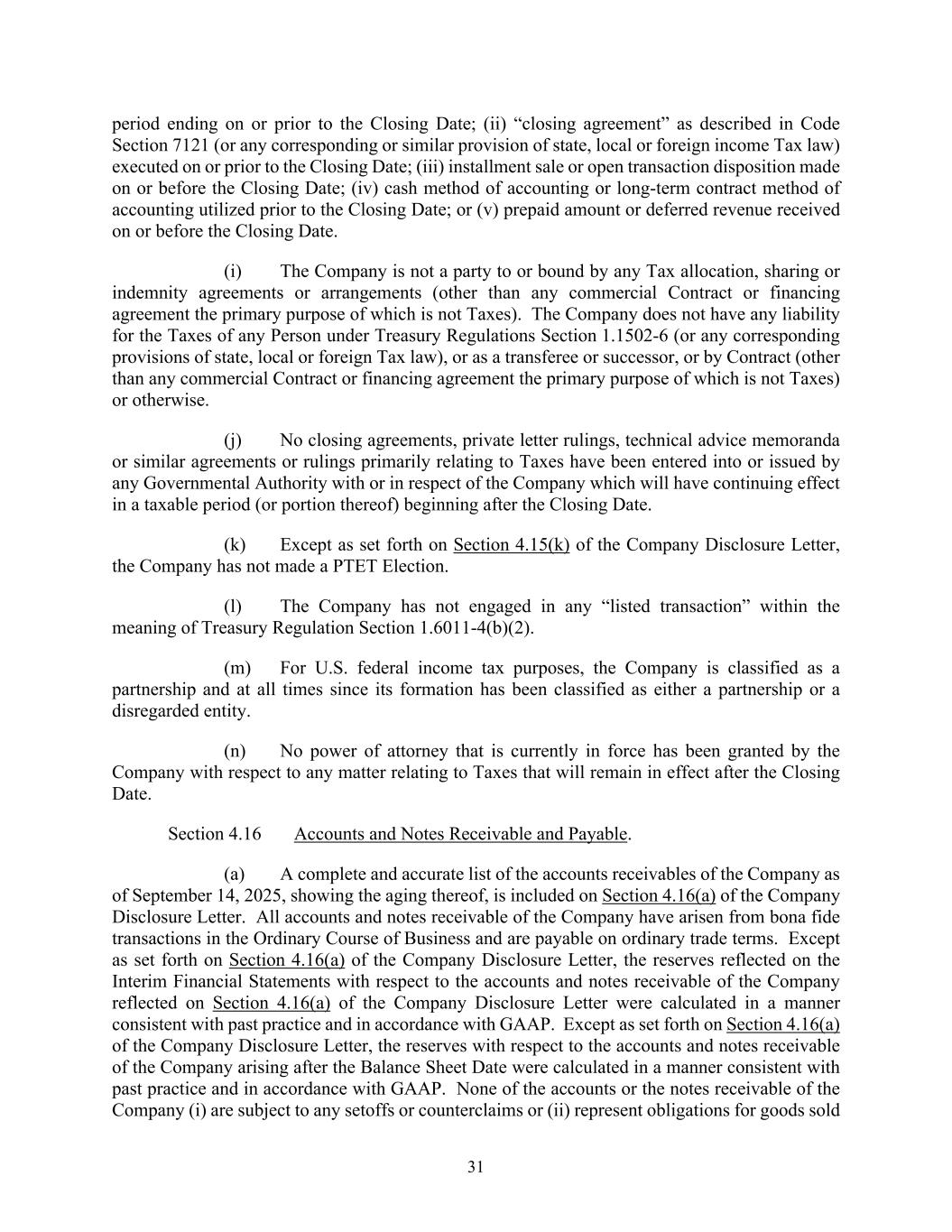 31 period ending on or prior to the Closing Date; (ii) “closing agreement” as described in Code Section 7121 (or any corresponding or similar provision of state, local or foreign income Tax law) executed on or prior to the Closing Date; (iii) installment sale or open transaction disposition made on or before the Closing Date; (iv) cash method of accounting or long-term contract method of accounting utilized prior to the Closing Date; or (v) prepaid amount or deferred revenue received on or before the Closing Date. (i) The Company is not a party to or bound by any Tax allocation, sharing or indemnity agreements or arrangements (other than any commercial Contract or financing agreement the primary purpose of which is not Taxes). The Company does not have any liability for the Taxes of any Person under Treasury Regulations Section 1.1502-6 (or any corresponding provisions of state, local or foreign Tax law), or as a transferee or successor, or by Contract (other than any commercial Contract or financing agreement the primary purpose of which is not Taxes) or otherwise. (j) No closing agreements, private letter rulings, technical advice memoranda or similar agreements or rulings primarily relating to Taxes have been entered into or issued by any Governmental Authority with or in respect of the Company which will have continuing effect in a taxable period (or portion thereof) beginning after the Closing Date. (k) Except as set forth on Section 4.15(k) of the Company Disclosure Letter, the Company has not made a PTET Election. (l) The Company has not engaged in any “listed transaction” within the meaning of Treasury Regulation Section 1.6011-4(b)(2). (m) For U.S. federal income tax purposes, the Company is classified as a partnership and at all times since its formation has been classified as either a partnership or a disregarded entity. (n) No power of attorney that is currently in force has been granted by the Company with respect to any matter relating to Taxes that will remain in effect after the Closing Date. Section 4.16 Accounts and Notes Receivable and Payable. (a) A complete and accurate list of the accounts receivables of the Company as of September 14, 2025, showing the aging thereof, is included on Section 4.16(a) of the Company Disclosure Letter. All accounts and notes receivable of the Company have arisen from bona fide transactions in the Ordinary Course of Business and are payable on ordinary trade terms. Except as set forth on Section 4.16(a) of the Company Disclosure Letter, the reserves reflected on the Interim Financial Statements with respect to the accounts and notes receivable of the Company reflected on Section 4.16(a) of the Company Disclosure Letter were calculated in a manner consistent with past practice and in accordance with GAAP. Except as set forth on Section 4.16(a) of the Company Disclosure Letter, the reserves with respect to the accounts and notes receivable of the Company arising after the Balance Sheet Date were calculated in a manner consistent with past practice and in accordance with GAAP. None of the accounts or the notes receivable of the Company (i) are subject to any setoffs or counterclaims or (ii) represent obligations for goods sold