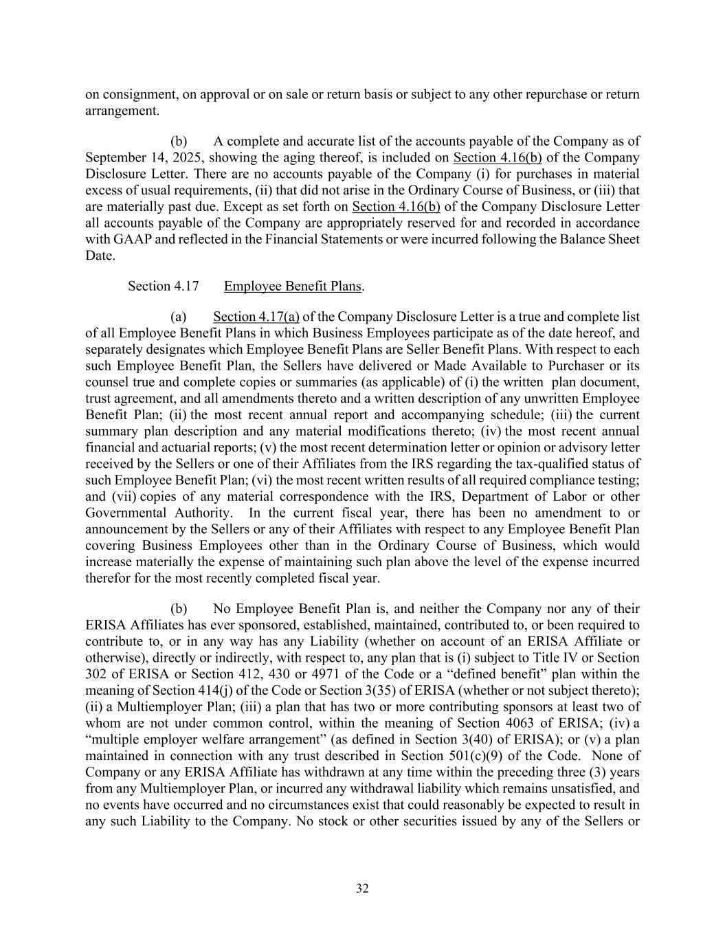 32 on consignment, on approval or on sale or return basis or subject to any other repurchase or return arrangement. (b) A complete and accurate list of the accounts payable of the Company as of September 14, 2025, showing the aging thereof, is included on Section 4.16(b) of the Company Disclosure Letter. There are no accounts payable of the Company (i) for purchases in material excess of usual requirements, (ii) that did not arise in the Ordinary Course of Business, or (iii) that are materially past due. Except as set forth on Section 4.16(b) of the Company Disclosure Letter all accounts payable of the Company are appropriately reserved for and recorded in accordance with GAAP and reflected in the Financial Statements or were incurred following the Balance Sheet Date. Section 4.17 Employee Benefit Plans. (a) Section 4.17(a) of the Company Disclosure Letter is a true and complete list of all Employee Benefit Plans in which Business Employees participate as of the date hereof, and separately designates which Employee Benefit Plans are Seller Benefit Plans. With respect to each such Employee Benefit Plan, the Sellers have delivered or Made Available to Purchaser or its counsel true and complete copies or summaries (as applicable) of (i) the written plan document, trust agreement, and all amendments thereto and a written description of any unwritten Employee Benefit Plan; (ii) the most recent annual report and accompanying schedule; (iii) the current summary plan description and any material modifications thereto; (iv) the most recent annual financial and actuarial reports; (v) the most recent determination letter or opinion or advisory letter received by the Sellers or one of their Affiliates from the IRS regarding the tax-qualified status of such Employee Benefit Plan; (vi) the most recent written results of all required compliance testing; and (vii) copies of any material correspondence with the IRS, Department of Labor or other Governmental Authority. In the current fiscal year, there has been no amendment to or announcement by the Sellers or any of their Affiliates with respect to any Employee Benefit Plan covering Business Employees other than in the Ordinary Course of Business, which would increase materially the expense of maintaining such plan above the level of the expense incurred therefor for the most recently completed fiscal year. (b) No Employee Benefit Plan is, and neither the Company nor any of their ERISA Affiliates has ever sponsored, established, maintained, contributed to, or been required to contribute to, or in any way has any Liability (whether on account of an ERISA Affiliate or otherwise), directly or indirectly, with respect to, any plan that is (i) subject to Title IV or Section 302 of ERISA or Section 412, 430 or 4971 of the Code or a “defined benefit” plan within the meaning of Section 414(j) of the Code or Section 3(35) of ERISA (whether or not subject thereto); (ii) a Multiemployer Plan; (iii) a plan that has two or more contributing sponsors at least two of whom are not under common control, within the meaning of Section 4063 of ERISA; (iv) a “multiple employer welfare arrangement” (as defined in Section 3(40) of ERISA); or (v) a plan maintained in connection with any trust described in Section 501(c)(9) of the Code. None of Company or any ERISA Affiliate has withdrawn at any time within the preceding three (3) years from any Multiemployer Plan, or incurred any withdrawal liability which remains unsatisfied, and no events have occurred and no circumstances exist that could reasonably be expected to result in any such Liability to the Company. No stock or other securities issued by any of the Sellers or