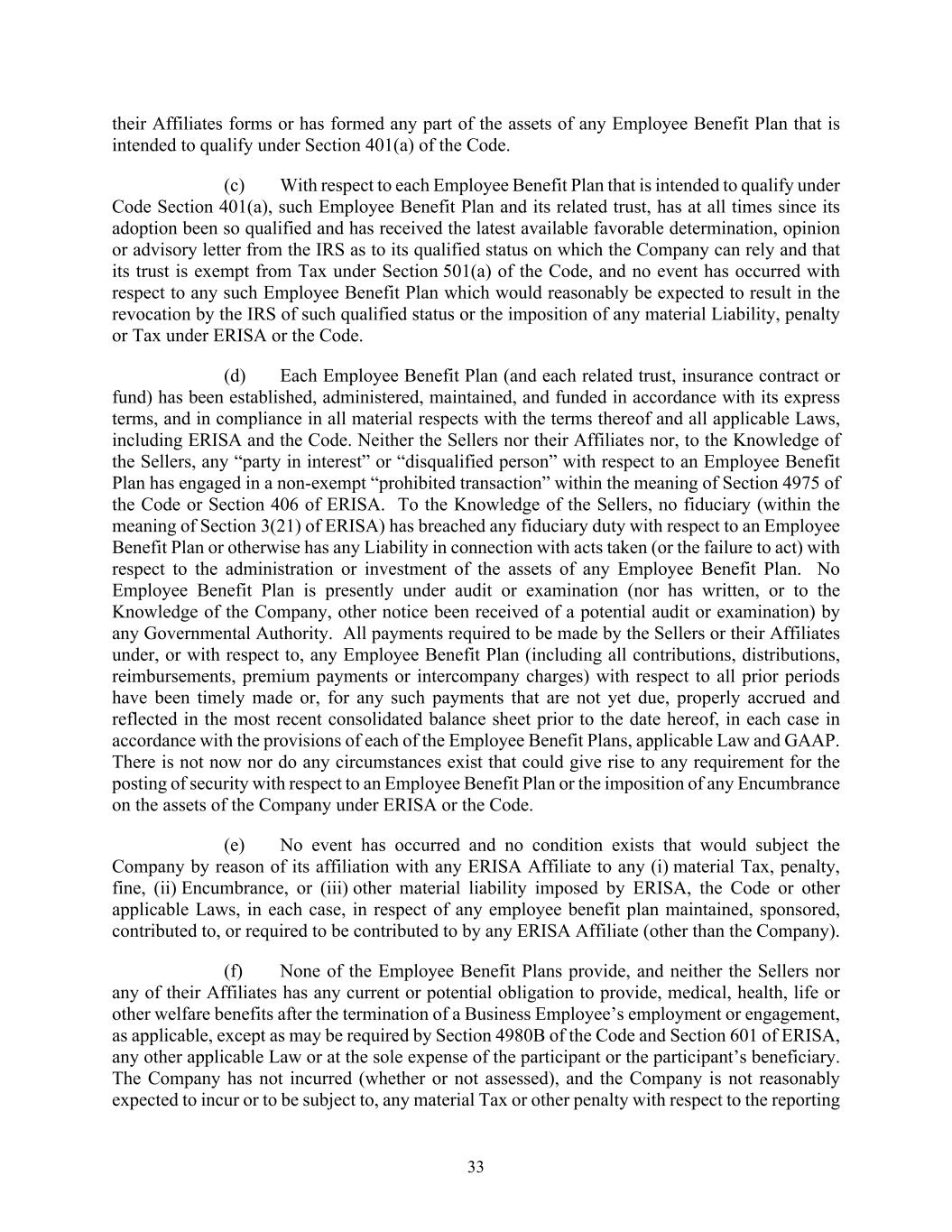 33 their Affiliates forms or has formed any part of the assets of any Employee Benefit Plan that is intended to qualify under Section 401(a) of the Code. (c) With respect to each Employee Benefit Plan that is intended to qualify under Code Section 401(a), such Employee Benefit Plan and its related trust, has at all times since its adoption been so qualified and has received the latest available favorable determination, opinion or advisory letter from the IRS as to its qualified status on which the Company can rely and that its trust is exempt from Tax under Section 501(a) of the Code, and no event has occurred with respect to any such Employee Benefit Plan which would reasonably be expected to result in the revocation by the IRS of such qualified status or the imposition of any material Liability, penalty or Tax under ERISA or the Code. (d) Each Employee Benefit Plan (and each related trust, insurance contract or fund) has been established, administered, maintained, and funded in accordance with its express terms, and in compliance in all material respects with the terms thereof and all applicable Laws, including ERISA and the Code. Neither the Sellers nor their Affiliates nor, to the Knowledge of the Sellers, any “party in interest” or “disqualified person” with respect to an Employee Benefit Plan has engaged in a non-exempt “prohibited transaction” within the meaning of Section 4975 of the Code or Section 406 of ERISA. To the Knowledge of the Sellers, no fiduciary (within the meaning of Section 3(21) of ERISA) has breached any fiduciary duty with respect to an Employee Benefit Plan or otherwise has any Liability in connection with acts taken (or the failure to act) with respect to the administration or investment of the assets of any Employee Benefit Plan. No Employee Benefit Plan is presently under audit or examination (nor has written, or to the Knowledge of the Company, other notice been received of a potential audit or examination) by any Governmental Authority. All payments required to be made by the Sellers or their Affiliates under, or with respect to, any Employee Benefit Plan (including all contributions, distributions, reimbursements, premium payments or intercompany charges) with respect to all prior periods have been timely made or, for any such payments that are not yet due, properly accrued and reflected in the most recent consolidated balance sheet prior to the date hereof, in each case in accordance with the provisions of each of the Employee Benefit Plans, applicable Law and GAAP. There is not now nor do any circumstances exist that could give rise to any requirement for the posting of security with respect to an Employee Benefit Plan or the imposition of any Encumbrance on the assets of the Company under ERISA or the Code. (e) No event has occurred and no condition exists that would subject the Company by reason of its affiliation with any ERISA Affiliate to any (i) material Tax, penalty, fine, (ii) Encumbrance, or (iii) other material liability imposed by ERISA, the Code or other applicable Laws, in each case, in respect of any employee benefit plan maintained, sponsored, contributed to, or required to be contributed to by any ERISA Affiliate (other than the Company). (f) None of the Employee Benefit Plans provide, and neither the Sellers nor any of their Affiliates has any current or potential obligation to provide, medical, health, life or other welfare benefits after the termination of a Business Employee’s employment or engagement, as applicable, except as may be required by Section 4980B of the Code and Section 601 of ERISA, any other applicable Law or at the sole expense of the participant or the participant’s beneficiary. The Company has not incurred (whether or not assessed), and the Company is not reasonably expected to incur or to be subject to, any material Tax or other penalty with respect to the reporting