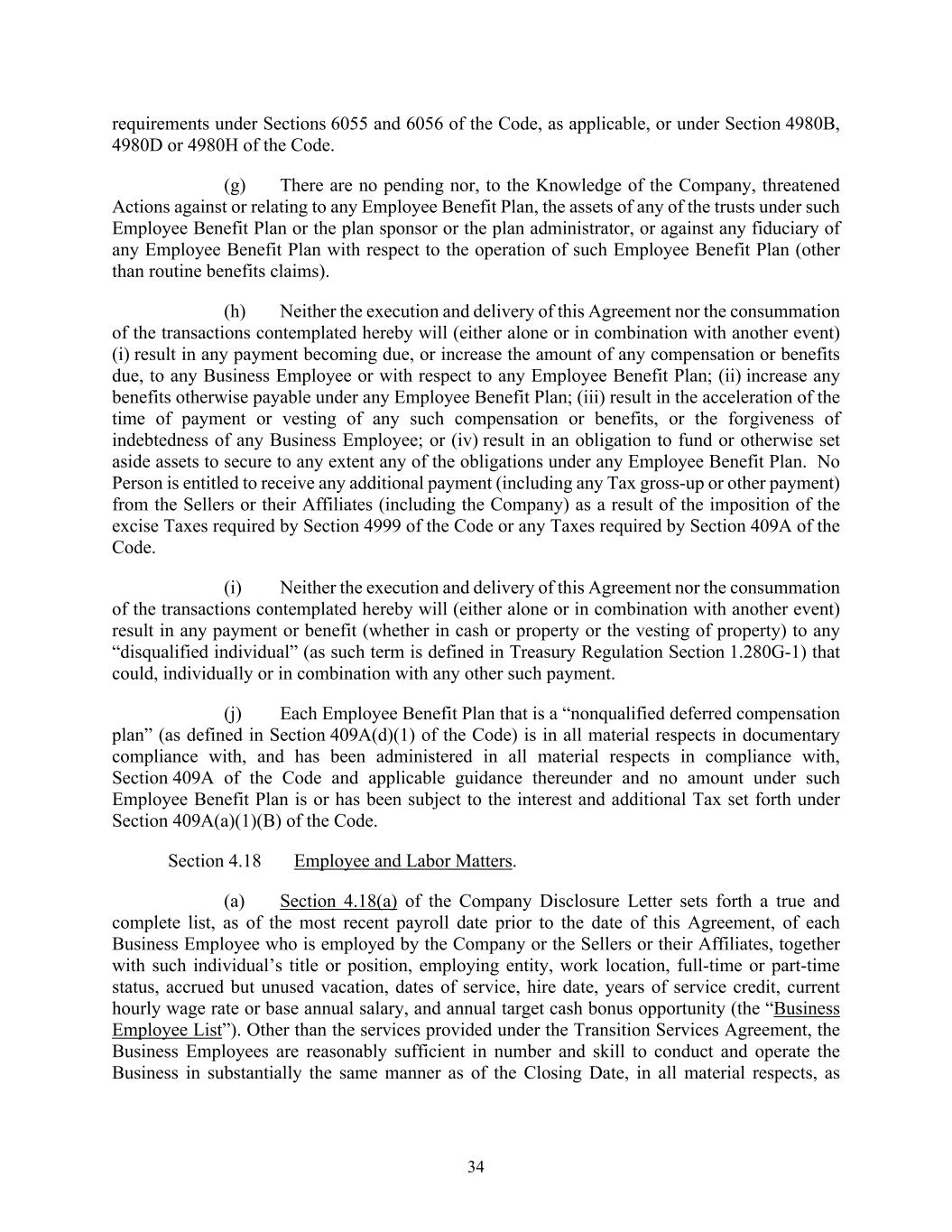 34 requirements under Sections 6055 and 6056 of the Code, as applicable, or under Section 4980B, 4980D or 4980H of the Code. (g) There are no pending nor, to the Knowledge of the Company, threatened Actions against or relating to any Employee Benefit Plan, the assets of any of the trusts under such Employee Benefit Plan or the plan sponsor or the plan administrator, or against any fiduciary of any Employee Benefit Plan with respect to the operation of such Employee Benefit Plan (other than routine benefits claims). (h) Neither the execution and delivery of this Agreement nor the consummation of the transactions contemplated hereby will (either alone or in combination with another event) (i) result in any payment becoming due, or increase the amount of any compensation or benefits due, to any Business Employee or with respect to any Employee Benefit Plan; (ii) increase any benefits otherwise payable under any Employee Benefit Plan; (iii) result in the acceleration of the time of payment or vesting of any such compensation or benefits, or the forgiveness of indebtedness of any Business Employee; or (iv) result in an obligation to fund or otherwise set aside assets to secure to any extent any of the obligations under any Employee Benefit Plan. No Person is entitled to receive any additional payment (including any Tax gross-up or other payment) from the Sellers or their Affiliates (including the Company) as a result of the imposition of the excise Taxes required by Section 4999 of the Code or any Taxes required by Section 409A of the Code. (i) Neither the execution and delivery of this Agreement nor the consummation of the transactions contemplated hereby will (either alone or in combination with another event) result in any payment or benefit (whether in cash or property or the vesting of property) to any “disqualified individual” (as such term is defined in Treasury Regulation Section 1.280G-1) that could, individually or in combination with any other such payment. (j) Each Employee Benefit Plan that is a “nonqualified deferred compensation plan” (as defined in Section 409A(d)(1) of the Code) is in all material respects in documentary compliance with, and has been administered in all material respects in compliance with, Section 409A of the Code and applicable guidance thereunder and no amount under such Employee Benefit Plan is or has been subject to the interest and additional Tax set forth under Section 409A(a)(1)(B) of the Code. Section 4.18 Employee and Labor Matters. (a) Section 4.18(a) of the Company Disclosure Letter sets forth a true and complete list, as of the most recent payroll date prior to the date of this Agreement, of each Business Employee who is employed by the Company or the Sellers or their Affiliates, together with such individual’s title or position, employing entity, work location, full-time or part-time status, accrued but unused vacation, dates of service, hire date, years of service credit, current hourly wage rate or base annual salary, and annual target cash bonus opportunity (the “Business Employee List”). Other than the services provided under the Transition Services Agreement, the Business Employees are reasonably sufficient in number and skill to conduct and operate the Business in substantially the same manner as of the Closing Date, in all material respects, as