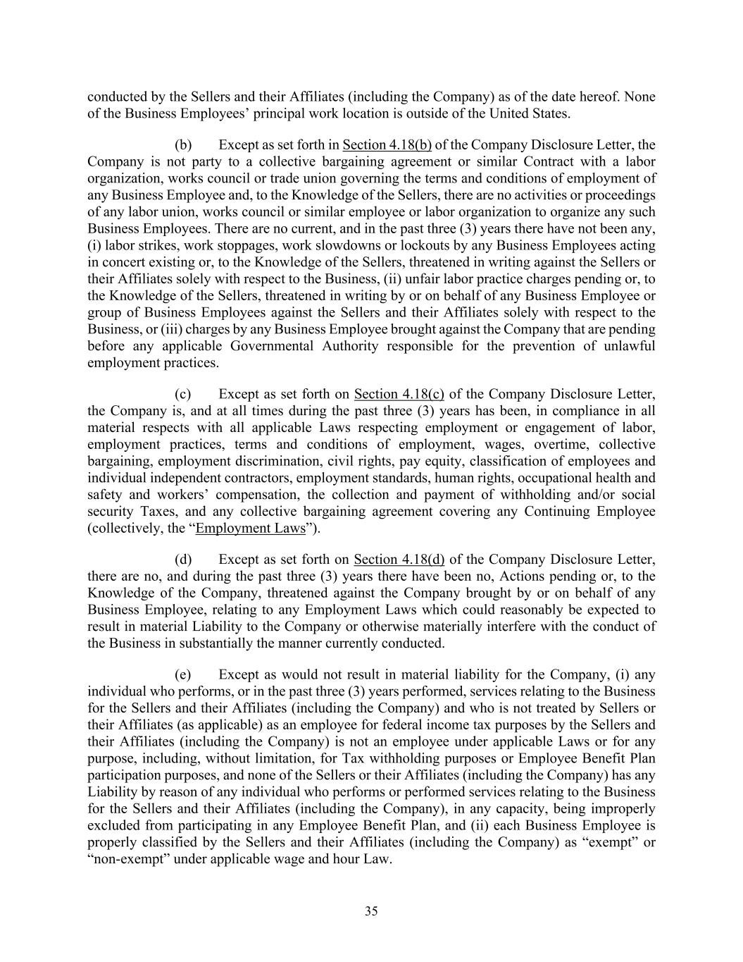35 conducted by the Sellers and their Affiliates (including the Company) as of the date hereof. None of the Business Employees’ principal work location is outside of the United States. (b) Except as set forth in Section 4.18(b) of the Company Disclosure Letter, the Company is not party to a collective bargaining agreement or similar Contract with a labor organization, works council or trade union governing the terms and conditions of employment of any Business Employee and, to the Knowledge of the Sellers, there are no activities or proceedings of any labor union, works council or similar employee or labor organization to organize any such Business Employees. There are no current, and in the past three (3) years there have not been any, (i) labor strikes, work stoppages, work slowdowns or lockouts by any Business Employees acting in concert existing or, to the Knowledge of the Sellers, threatened in writing against the Sellers or their Affiliates solely with respect to the Business, (ii) unfair labor practice charges pending or, to the Knowledge of the Sellers, threatened in writing by or on behalf of any Business Employee or group of Business Employees against the Sellers and their Affiliates solely with respect to the Business, or (iii) charges by any Business Employee brought against the Company that are pending before any applicable Governmental Authority responsible for the prevention of unlawful employment practices. (c) Except as set forth on Section 4.18(c) of the Company Disclosure Letter, the Company is, and at all times during the past three (3) years has been, in compliance in all material respects with all applicable Laws respecting employment or engagement of labor, employment practices, terms and conditions of employment, wages, overtime, collective bargaining, employment discrimination, civil rights, pay equity, classification of employees and individual independent contractors, employment standards, human rights, occupational health and safety and workers’ compensation, the collection and payment of withholding and/or social security Taxes, and any collective bargaining agreement covering any Continuing Employee (collectively, the “Employment Laws”). (d) Except as set forth on Section 4.18(d) of the Company Disclosure Letter, there are no, and during the past three (3) years there have been no, Actions pending or, to the Knowledge of the Company, threatened against the Company brought by or on behalf of any Business Employee, relating to any Employment Laws which could reasonably be expected to result in material Liability to the Company or otherwise materially interfere with the conduct of the Business in substantially the manner currently conducted. (e) Except as would not result in material liability for the Company, (i) any individual who performs, or in the past three (3) years performed, services relating to the Business for the Sellers and their Affiliates (including the Company) and who is not treated by Sellers or their Affiliates (as applicable) as an employee for federal income tax purposes by the Sellers and their Affiliates (including the Company) is not an employee under applicable Laws or for any purpose, including, without limitation, for Tax withholding purposes or Employee Benefit Plan participation purposes, and none of the Sellers or their Affiliates (including the Company) has any Liability by reason of any individual who performs or performed services relating to the Business for the Sellers and their Affiliates (including the Company), in any capacity, being improperly excluded from participating in any Employee Benefit Plan, and (ii) each Business Employee is properly classified by the Sellers and their Affiliates (including the Company) as “exempt” or “non-exempt” under applicable wage and hour Law.