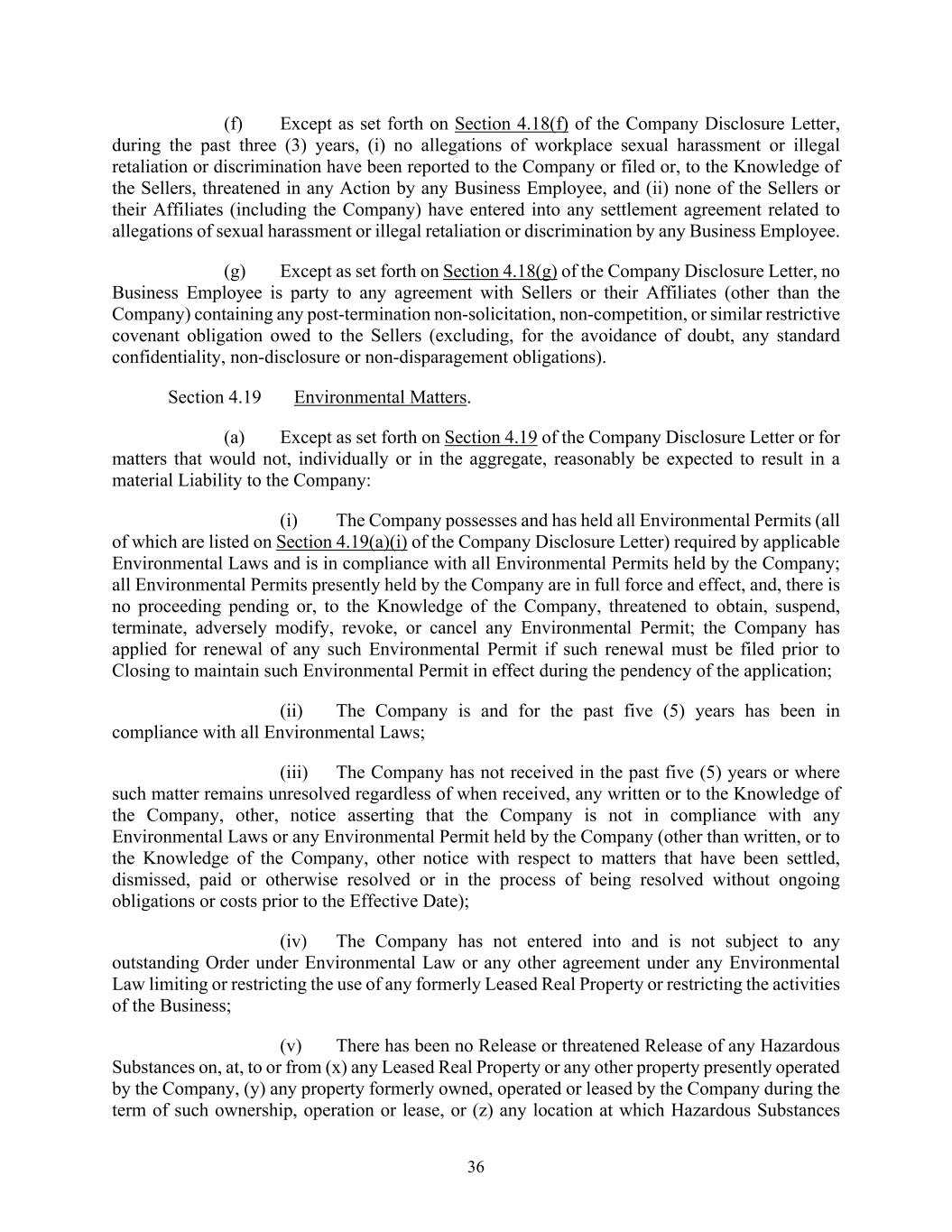 36 (f) Except as set forth on Section 4.18(f) of the Company Disclosure Letter, during the past three (3) years, (i) no allegations of workplace sexual harassment or illegal retaliation or discrimination have been reported to the Company or filed or, to the Knowledge of the Sellers, threatened in any Action by any Business Employee, and (ii) none of the Sellers or their Affiliates (including the Company) have entered into any settlement agreement related to allegations of sexual harassment or illegal retaliation or discrimination by any Business Employee. (g) Except as set forth on Section 4.18(g) of the Company Disclosure Letter, no Business Employee is party to any agreement with Sellers or their Affiliates (other than the Company) containing any post-termination non-solicitation, non-competition, or similar restrictive covenant obligation owed to the Sellers (excluding, for the avoidance of doubt, any standard confidentiality, non-disclosure or non-disparagement obligations). Section 4.19 Environmental Matters. (a) Except as set forth on Section 4.19 of the Company Disclosure Letter or for matters that would not, individually or in the aggregate, reasonably be expected to result in a material Liability to the Company: (i) The Company possesses and has held all Environmental Permits (all of which are listed on Section 4.19(a)(i) of the Company Disclosure Letter) required by applicable Environmental Laws and is in compliance with all Environmental Permits held by the Company; all Environmental Permits presently held by the Company are in full force and effect, and, there is no proceeding pending or, to the Knowledge of the Company, threatened to obtain, suspend, terminate, adversely modify, revoke, or cancel any Environmental Permit; the Company has applied for renewal of any such Environmental Permit if such renewal must be filed prior to Closing to maintain such Environmental Permit in effect during the pendency of the application; (ii) The Company is and for the past five (5) years has been in compliance with all Environmental Laws; (iii) The Company has not received in the past five (5) years or where such matter remains unresolved regardless of when received, any written or to the Knowledge of the Company, other, notice asserting that the Company is not in compliance with any Environmental Laws or any Environmental Permit held by the Company (other than written, or to the Knowledge of the Company, other notice with respect to matters that have been settled, dismissed, paid or otherwise resolved or in the process of being resolved without ongoing obligations or costs prior to the Effective Date); (iv) The Company has not entered into and is not subject to any outstanding Order under Environmental Law or any other agreement under any Environmental Law limiting or restricting the use of any formerly Leased Real Property or restricting the activities of the Business; (v) There has been no Release or threatened Release of any Hazardous Substances on, at, to or from (x) any Leased Real Property or any other property presently operated by the Company, (y) any property formerly owned, operated or leased by the Company during the term of such ownership, operation or lease, or (z) any location at which Hazardous Substances
