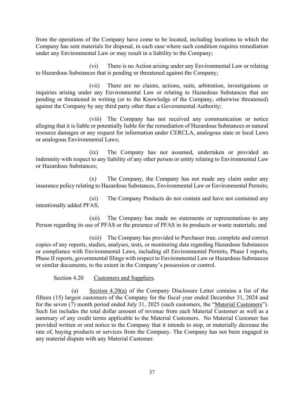37 from the operations of the Company have come to be located, including locations to which the Company has sent materials for disposal, in each case where such condition requires remediation under any Environmental Law or may result in a liability to the Company; (vi) There is no Action arising under any Environmental Law or relating to Hazardous Substances that is pending or threatened against the Company; (vii) There are no claims, actions, suits, arbitration, investigations or inquiries arising under any Environmental Law or relating to Hazardous Substances that are pending or threatened in writing (or to the Knowledge of the Company, otherwise threatened) against the Company by any third party other than a Governmental Authority; (viii) The Company has not received any communication or notice alleging that it is liable or potentially liable for the remediation of Hazardous Substances or natural resource damages or any request for information under CERCLA, analogous state or local Laws or analogous Environmental Laws; (ix) The Company has not assumed, undertaken or provided an indemnity with respect to any liability of any other person or entity relating to Environmental Law or Hazardous Substances; (x) The Company, the Company has not made any claim under any insurance policy relating to Hazardous Substances, Environmental Law or Environmental Permits; (xi) The Company Products do not contain and have not contained any intentionally added PFAS; (xii) The Company has made no statements or representations to any Person regarding its use of PFAS or the presence of PFAS in its products or waste materials; and (xiii) The Company has provided to Purchaser true, complete and correct copies of any reports, studies, analyses, tests, or monitoring data regarding Hazardous Substances or compliance with Environmental Laws, including all Environmental Permits, Phase I reports, Phase II reports, governmental filings with respect to Environmental Law or Hazardous Substances or similar documents, to the extent in the Company’s possession or control. Section 4.20 Customers and Suppliers. (a) Section 4.20(a) of the Company Disclosure Letter contains a list of the fifteen (15) largest customers of the Company for the fiscal year ended December 31, 2024 and for the seven (7) month period ended July 31, 2025 (such customers, the “Material Customers”). Such list includes the total dollar amount of revenue from each Material Customer as well as a summary of any credit terms applicable to the Material Customers. No Material Customer has provided written or oral notice to the Company that it intends to stop, or materially decrease the rate of, buying products or services from the Company. The Company has not been engaged in any material dispute with any Material Customer.