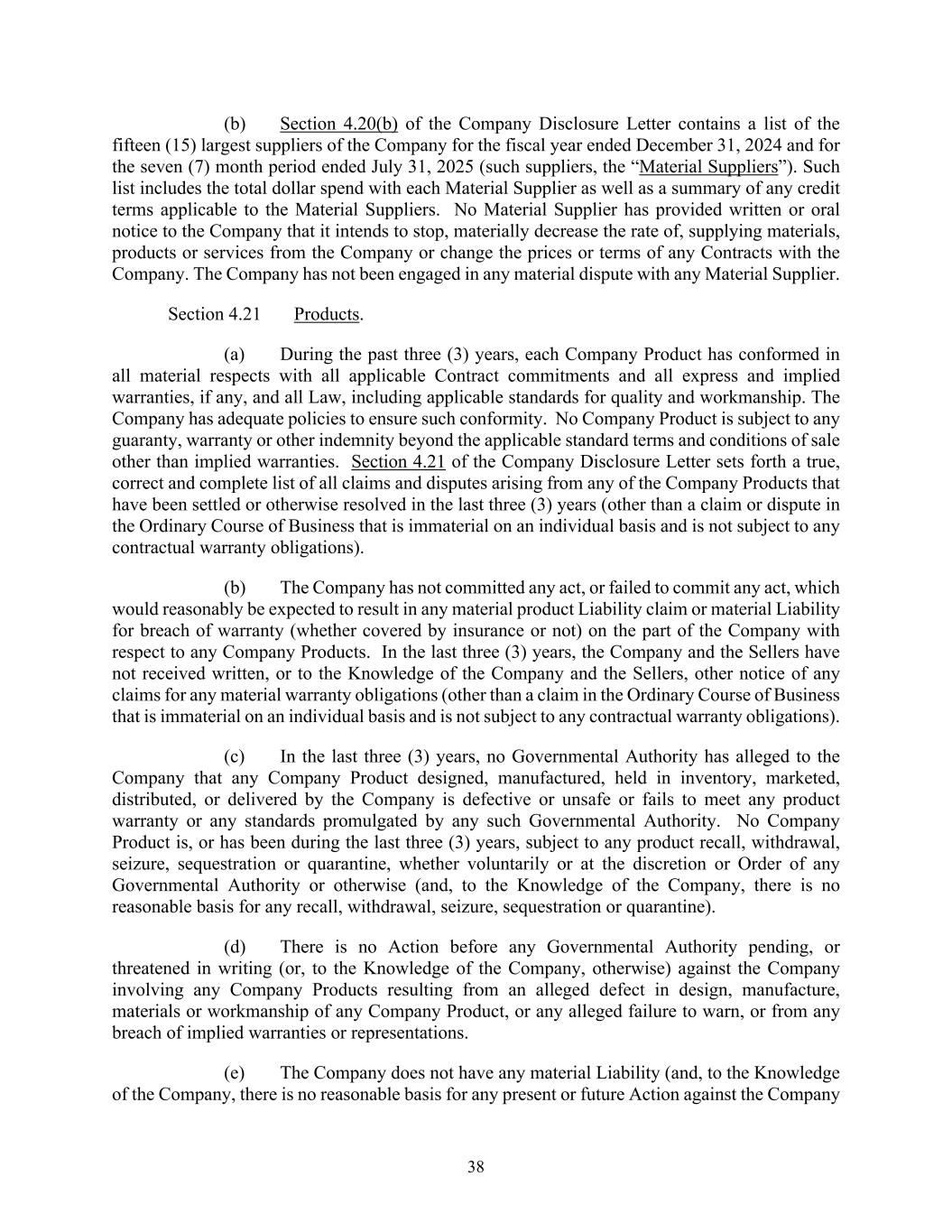 38 (b) Section 4.20(b) of the Company Disclosure Letter contains a list of the fifteen (15) largest suppliers of the Company for the fiscal year ended December 31, 2024 and for the seven (7) month period ended July 31, 2025 (such suppliers, the “Material Suppliers”). Such list includes the total dollar spend with each Material Supplier as well as a summary of any credit terms applicable to the Material Suppliers. No Material Supplier has provided written or oral notice to the Company that it intends to stop, materially decrease the rate of, supplying materials, products or services from the Company or change the prices or terms of any Contracts with the Company. The Company has not been engaged in any material dispute with any Material Supplier. Section 4.21 Products. (a) During the past three (3) years, each Company Product has conformed in all material respects with all applicable Contract commitments and all express and implied warranties, if any, and all Law, including applicable standards for quality and workmanship. The Company has adequate policies to ensure such conformity. No Company Product is subject to any guaranty, warranty or other indemnity beyond the applicable standard terms and conditions of sale other than implied warranties. Section 4.21 of the Company Disclosure Letter sets forth a true, correct and complete list of all claims and disputes arising from any of the Company Products that have been settled or otherwise resolved in the last three (3) years (other than a claim or dispute in the Ordinary Course of Business that is immaterial on an individual basis and is not subject to any contractual warranty obligations). (b) The Company has not committed any act, or failed to commit any act, which would reasonably be expected to result in any material product Liability claim or material Liability for breach of warranty (whether covered by insurance or not) on the part of the Company with respect to any Company Products. In the last three (3) years, the Company and the Sellers have not received written, or to the Knowledge of the Company and the Sellers, other notice of any claims for any material warranty obligations (other than a claim in the Ordinary Course of Business that is immaterial on an individual basis and is not subject to any contractual warranty obligations). (c) In the last three (3) years, no Governmental Authority has alleged to the Company that any Company Product designed, manufactured, held in inventory, marketed, distributed, or delivered by the Company is defective or unsafe or fails to meet any product warranty or any standards promulgated by any such Governmental Authority. No Company Product is, or has been during the last three (3) years, subject to any product recall, withdrawal, seizure, sequestration or quarantine, whether voluntarily or at the discretion or Order of any Governmental Authority or otherwise (and, to the Knowledge of the Company, there is no reasonable basis for any recall, withdrawal, seizure, sequestration or quarantine). (d) There is no Action before any Governmental Authority pending, or threatened in writing (or, to the Knowledge of the Company, otherwise) against the Company involving any Company Products resulting from an alleged defect in design, manufacture, materials or workmanship of any Company Product, or any alleged failure to warn, or from any breach of implied warranties or representations. (e) The Company does not have any material Liability (and, to the Knowledge of the Company, there is no reasonable basis for any present or future Action against the Company