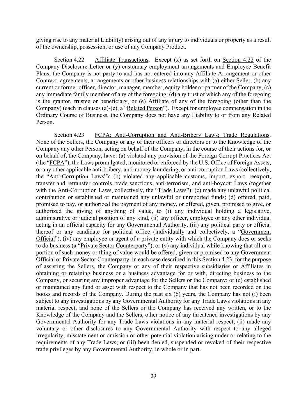 39 giving rise to any material Liability) arising out of any injury to individuals or property as a result of the ownership, possession, or use of any Company Product. Section 4.22 Affiliate Transactions. Except (x) as set forth on Section 4.22 of the Company Disclosure Letter or (y) customary employment arrangements and Employee Benefit Plans, the Company is not party to and has not entered into any Affiliate Arrangement or other Contract, agreements, arrangements or other business relationships with (a) either Seller, (b) any current or former officer, director, manager, member, equity holder or partner of the Company, (c) any immediate family member of any of the foregoing, (d) any trust of which any of the foregoing is the grantor, trustee or beneficiary, or (e) Affiliate of any of the foregoing (other than the Company) (each in clauses (a)-(e), a “Related Person”). Except for employee compensation in the Ordinary Course of Business, the Company does not have any Liability to or from any Related Person. Section 4.23 FCPA; Anti-Corruption and Anti-Bribery Laws; Trade Regulations. None of the Sellers, the Company or any of their officers or directors or to the Knowledge of the Company any other Person, acting on behalf of the Company, in the course of their actions for, or on behalf of, the Company, have: (a) violated any provision of the Foreign Corrupt Practices Act (the “FCPA”), the Laws promulgated, monitored or enforced by the U.S. Office of Foreign Assets, or any other applicable anti-bribery, anti-money laundering, or anti-corruption Laws (collectively, the “Anti-Corruption Laws”); (b) violated any applicable customs, import, export, reexport, transfer and retransfer controls, trade sanctions, anti-terrorism, and anti-boycott Laws (together with the Anti-Corruption Laws, collectively, the “Trade Laws”); (c) made any unlawful political contribution or established or maintained any unlawful or unreported funds; (d) offered, paid, promised to pay, or authorized the payment of any money, or offered, given, promised to give, or authorized the giving of anything of value, to (i) any individual holding a legislative, administrative or judicial position of any kind, (ii) any officer, employee or any other individual acting in an official capacity for any Governmental Authority, (iii) any political party or official thereof or any candidate for political office (individually and collectively, a “Government Official”), (iv) any employee or agent of a private entity with which the Company does or seeks to do business (a “Private Sector Counterparty”), or (v) any individual while knowing that all or a portion of such money or thing of value would be offered, given or promised to any Government Official or Private Sector Counterparty, in each case described in this Section 4.23, for the purpose of assisting the Sellers, the Company or any of their respective subsidiaries or Affiliates in obtaining or retaining business or a business advantage for or with, directing business to the Company, or securing any improper advantage for the Sellers or the Company; or (e) established or maintained any fund or asset with respect to the Company that has not been recorded on the books and records of the Company. During the past six (6) years, the Company has not (i) been subject to any investigations by any Governmental Authority for any Trade Laws violations in any material respect, and none of the Sellers or the Company has received any written, or to the Knowledge of the Company and the Sellers, other notice of any threatened investigations by any Governmental Authority for any Trade Laws violations in any material respect; (ii) made any voluntary or other disclosures to any Governmental Authority with respect to any alleged irregularity, misstatement or omission or other potential violation arising under or relating to the requirements of any Trade Laws; or (iii) been denied, suspended or revoked of their respective trade privileges by any Governmental Authority, in whole or in part.