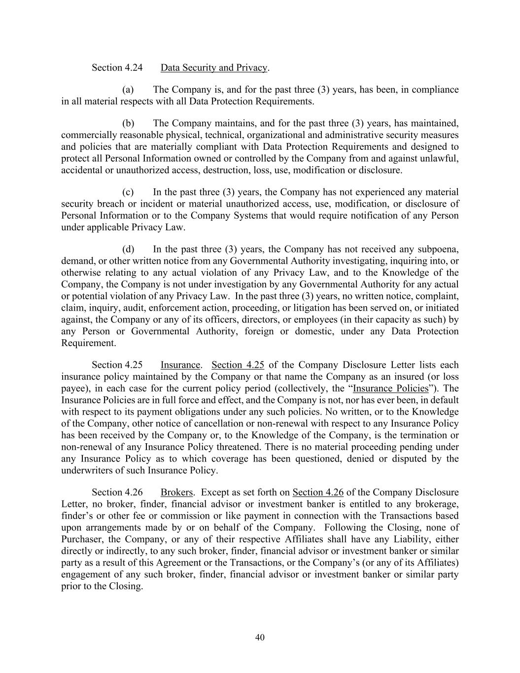 40 Section 4.24 Data Security and Privacy. (a) The Company is, and for the past three (3) years, has been, in compliance in all material respects with all Data Protection Requirements. (b) The Company maintains, and for the past three (3) years, has maintained, commercially reasonable physical, technical, organizational and administrative security measures and policies that are materially compliant with Data Protection Requirements and designed to protect all Personal Information owned or controlled by the Company from and against unlawful, accidental or unauthorized access, destruction, loss, use, modification or disclosure. (c) In the past three (3) years, the Company has not experienced any material security breach or incident or material unauthorized access, use, modification, or disclosure of Personal Information or to the Company Systems that would require notification of any Person under applicable Privacy Law. (d) In the past three (3) years, the Company has not received any subpoena, demand, or other written notice from any Governmental Authority investigating, inquiring into, or otherwise relating to any actual violation of any Privacy Law, and to the Knowledge of the Company, the Company is not under investigation by any Governmental Authority for any actual or potential violation of any Privacy Law. In the past three (3) years, no written notice, complaint, claim, inquiry, audit, enforcement action, proceeding, or litigation has been served on, or initiated against, the Company or any of its officers, directors, or employees (in their capacity as such) by any Person or Governmental Authority, foreign or domestic, under any Data Protection Requirement. Section 4.25 Insurance. Section 4.25 of the Company Disclosure Letter lists each insurance policy maintained by the Company or that name the Company as an insured (or loss payee), in each case for the current policy period (collectively, the “Insurance Policies”). The Insurance Policies are in full force and effect, and the Company is not, nor has ever been, in default with respect to its payment obligations under any such policies. No written, or to the Knowledge of the Company, other notice of cancellation or non-renewal with respect to any Insurance Policy has been received by the Company or, to the Knowledge of the Company, is the termination or non-renewal of any Insurance Policy threatened. There is no material proceeding pending under any Insurance Policy as to which coverage has been questioned, denied or disputed by the underwriters of such Insurance Policy. Section 4.26 Brokers. Except as set forth on Section 4.26 of the Company Disclosure Letter, no broker, finder, financial advisor or investment banker is entitled to any brokerage, finder’s or other fee or commission or like payment in connection with the Transactions based upon arrangements made by or on behalf of the Company. Following the Closing, none of Purchaser, the Company, or any of their respective Affiliates shall have any Liability, either directly or indirectly, to any such broker, finder, financial advisor or investment banker or similar party as a result of this Agreement or the Transactions, or the Company’s (or any of its Affiliates) engagement of any such broker, finder, financial advisor or investment banker or similar party prior to the Closing.