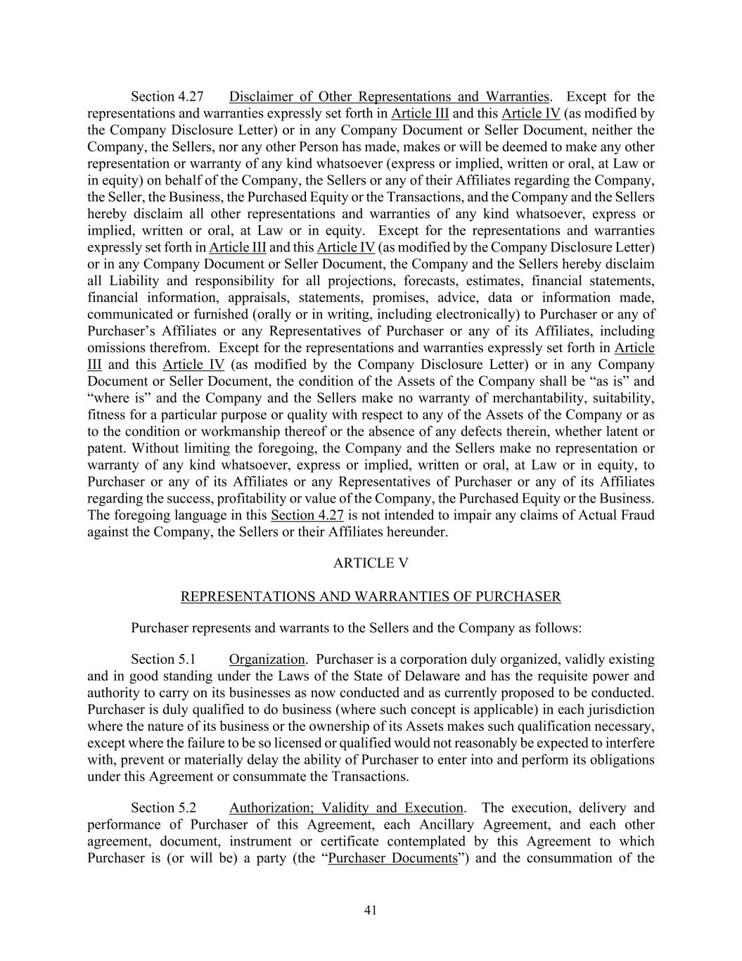 41 Section 4.27 Disclaimer of Other Representations and Warranties. Except for the representations and warranties expressly set forth in Article III and this Article IV (as modified by the Company Disclosure Letter) or in any Company Document or Seller Document, neither the Company, the Sellers, nor any other Person has made, makes or will be deemed to make any other representation or warranty of any kind whatsoever (express or implied, written or oral, at Law or in equity) on behalf of the Company, the Sellers or any of their Affiliates regarding the Company, the Seller, the Business, the Purchased Equity or the Transactions, and the Company and the Sellers hereby disclaim all other representations and warranties of any kind whatsoever, express or implied, written or oral, at Law or in equity. Except for the representations and warranties expressly set forth in Article III and this Article IV (as modified by the Company Disclosure Letter) or in any Company Document or Seller Document, the Company and the Sellers hereby disclaim all Liability and responsibility for all projections, forecasts, estimates, financial statements, financial information, appraisals, statements, promises, advice, data or information made, communicated or furnished (orally or in writing, including electronically) to Purchaser or any of Purchaser’s Affiliates or any Representatives of Purchaser or any of its Affiliates, including omissions therefrom. Except for the representations and warranties expressly set forth in Article III and this Article IV (as modified by the Company Disclosure Letter) or in any Company Document or Seller Document, the condition of the Assets of the Company shall be “as is” and “where is” and the Company and the Sellers make no warranty of merchantability, suitability, fitness for a particular purpose or quality with respect to any of the Assets of the Company or as to the condition or workmanship thereof or the absence of any defects therein, whether latent or patent. Without limiting the foregoing, the Company and the Sellers make no representation or warranty of any kind whatsoever, express or implied, written or oral, at Law or in equity, to Purchaser or any of its Affiliates or any Representatives of Purchaser or any of its Affiliates regarding the success, profitability or value of the Company, the Purchased Equity or the Business. The foregoing language in this Section 4.27 is not intended to impair any claims of Actual Fraud against the Company, the Sellers or their Affiliates hereunder. ARTICLE V REPRESENTATIONS AND WARRANTIES OF PURCHASER Purchaser represents and warrants to the Sellers and the Company as follows: Section 5.1 Organization. Purchaser is a corporation duly organized, validly existing and in good standing under the Laws of the State of Delaware and has the requisite power and authority to carry on its businesses as now conducted and as currently proposed to be conducted. Purchaser is duly qualified to do business (where such concept is applicable) in each jurisdiction where the nature of its business or the ownership of its Assets makes such qualification necessary, except where the failure to be so licensed or qualified would not reasonably be expected to interfere with, prevent or materially delay the ability of Purchaser to enter into and perform its obligations under this Agreement or consummate the Transactions. Section 5.2 Authorization; Validity and Execution. The execution, delivery and performance of Purchaser of this Agreement, each Ancillary Agreement, and each other agreement, document, instrument or certificate contemplated by this Agreement to which Purchaser is (or will be) a party (the “Purchaser Documents”) and the consummation of the