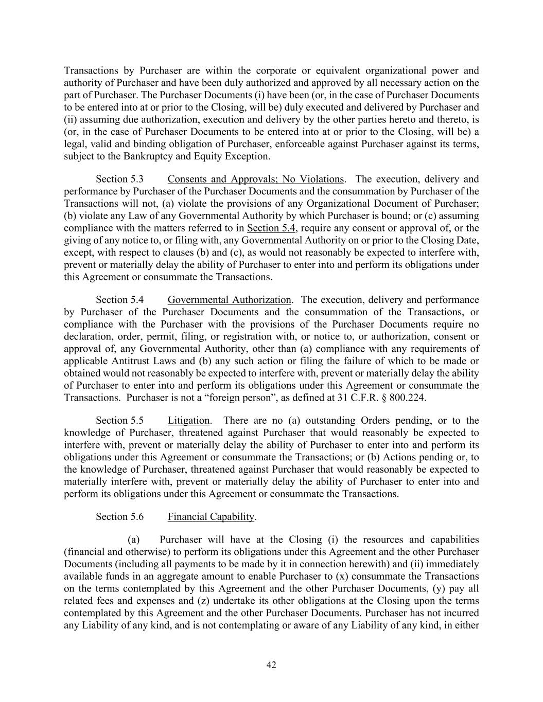 42 Transactions by Purchaser are within the corporate or equivalent organizational power and authority of Purchaser and have been duly authorized and approved by all necessary action on the part of Purchaser. The Purchaser Documents (i) have been (or, in the case of Purchaser Documents to be entered into at or prior to the Closing, will be) duly executed and delivered by Purchaser and (ii) assuming due authorization, execution and delivery by the other parties hereto and thereto, is (or, in the case of Purchaser Documents to be entered into at or prior to the Closing, will be) a legal, valid and binding obligation of Purchaser, enforceable against Purchaser against its terms, subject to the Bankruptcy and Equity Exception. Section 5.3 Consents and Approvals; No Violations. The execution, delivery and performance by Purchaser of the Purchaser Documents and the consummation by Purchaser of the Transactions will not, (a) violate the provisions of any Organizational Document of Purchaser; (b) violate any Law of any Governmental Authority by which Purchaser is bound; or (c) assuming compliance with the matters referred to in Section 5.4, require any consent or approval of, or the giving of any notice to, or filing with, any Governmental Authority on or prior to the Closing Date, except, with respect to clauses (b) and (c), as would not reasonably be expected to interfere with, prevent or materially delay the ability of Purchaser to enter into and perform its obligations under this Agreement or consummate the Transactions. Section 5.4 Governmental Authorization. The execution, delivery and performance by Purchaser of the Purchaser Documents and the consummation of the Transactions, or compliance with the Purchaser with the provisions of the Purchaser Documents require no declaration, order, permit, filing, or registration with, or notice to, or authorization, consent or approval of, any Governmental Authority, other than (a) compliance with any requirements of applicable Antitrust Laws and (b) any such action or filing the failure of which to be made or obtained would not reasonably be expected to interfere with, prevent or materially delay the ability of Purchaser to enter into and perform its obligations under this Agreement or consummate the Transactions. Purchaser is not a “foreign person”, as defined at 31 C.F.R. § 800.224. Section 5.5 Litigation. There are no (a) outstanding Orders pending, or to the knowledge of Purchaser, threatened against Purchaser that would reasonably be expected to interfere with, prevent or materially delay the ability of Purchaser to enter into and perform its obligations under this Agreement or consummate the Transactions; or (b) Actions pending or, to the knowledge of Purchaser, threatened against Purchaser that would reasonably be expected to materially interfere with, prevent or materially delay the ability of Purchaser to enter into and perform its obligations under this Agreement or consummate the Transactions. Section 5.6 Financial Capability. (a) Purchaser will have at the Closing (i) the resources and capabilities (financial and otherwise) to perform its obligations under this Agreement and the other Purchaser Documents (including all payments to be made by it in connection herewith) and (ii) immediately available funds in an aggregate amount to enable Purchaser to (x) consummate the Transactions on the terms contemplated by this Agreement and the other Purchaser Documents, (y) pay all related fees and expenses and (z) undertake its other obligations at the Closing upon the terms contemplated by this Agreement and the other Purchaser Documents. Purchaser has not incurred any Liability of any kind, and is not contemplating or aware of any Liability of any kind, in either