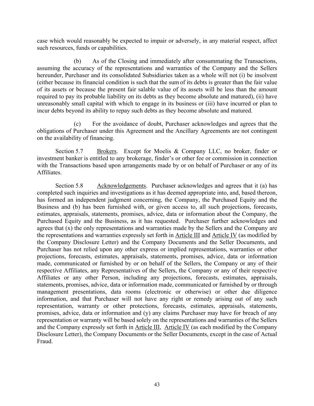 43 case which would reasonably be expected to impair or adversely, in any material respect, affect such resources, funds or capabilities. (b) As of the Closing and immediately after consummating the Transactions, assuming the accuracy of the representations and warranties of the Company and the Sellers hereunder, Purchaser and its consolidated Subsidiaries taken as a whole will not (i) be insolvent (either because its financial condition is such that the sum of its debts is greater than the fair value of its assets or because the present fair salable value of its assets will be less than the amount required to pay its probable liability on its debts as they become absolute and matured), (ii) have unreasonably small capital with which to engage in its business or (iii) have incurred or plan to incur debts beyond its ability to repay such debts as they become absolute and matured. (c) For the avoidance of doubt, Purchaser acknowledges and agrees that the obligations of Purchaser under this Agreement and the Ancillary Agreements are not contingent on the availability of financing. Section 5.7 Brokers. Except for Moelis & Company LLC, no broker, finder or investment banker is entitled to any brokerage, finder’s or other fee or commission in connection with the Transactions based upon arrangements made by or on behalf of Purchaser or any of its Affiliates. Section 5.8 Acknowledgements. Purchaser acknowledges and agrees that it (a) has completed such inquiries and investigations as it has deemed appropriate into, and, based thereon, has formed an independent judgment concerning, the Company, the Purchased Equity and the Business and (b) has been furnished with, or given access to, all such projections, forecasts, estimates, appraisals, statements, promises, advice, data or information about the Company, the Purchased Equity and the Business, as it has requested. Purchaser further acknowledges and agrees that (x) the only representations and warranties made by the Sellers and the Company are the representations and warranties expressly set forth in Article III and Article IV (as modified by the Company Disclosure Letter) and the Company Documents and the Seller Documents, and Purchaser has not relied upon any other express or implied representations, warranties or other projections, forecasts, estimates, appraisals, statements, promises, advice, data or information made, communicated or furnished by or on behalf of the Sellers, the Company or any of their respective Affiliates, any Representatives of the Sellers, the Company or any of their respective Affiliates or any other Person, including any projections, forecasts, estimates, appraisals, statements, promises, advice, data or information made, communicated or furnished by or through management presentations, data rooms (electronic or otherwise) or other due diligence information, and that Purchaser will not have any right or remedy arising out of any such representation, warranty or other protections, forecasts, estimates, appraisals, statements, promises, advice, data or information and (y) any claims Purchaser may have for breach of any representation or warranty will be based solely on the representations and warranties of the Sellers and the Company expressly set forth in Article III, Article IV (as each modified by the Company Disclosure Letter), the Company Documents or the Seller Documents, except in the case of Actual Fraud.