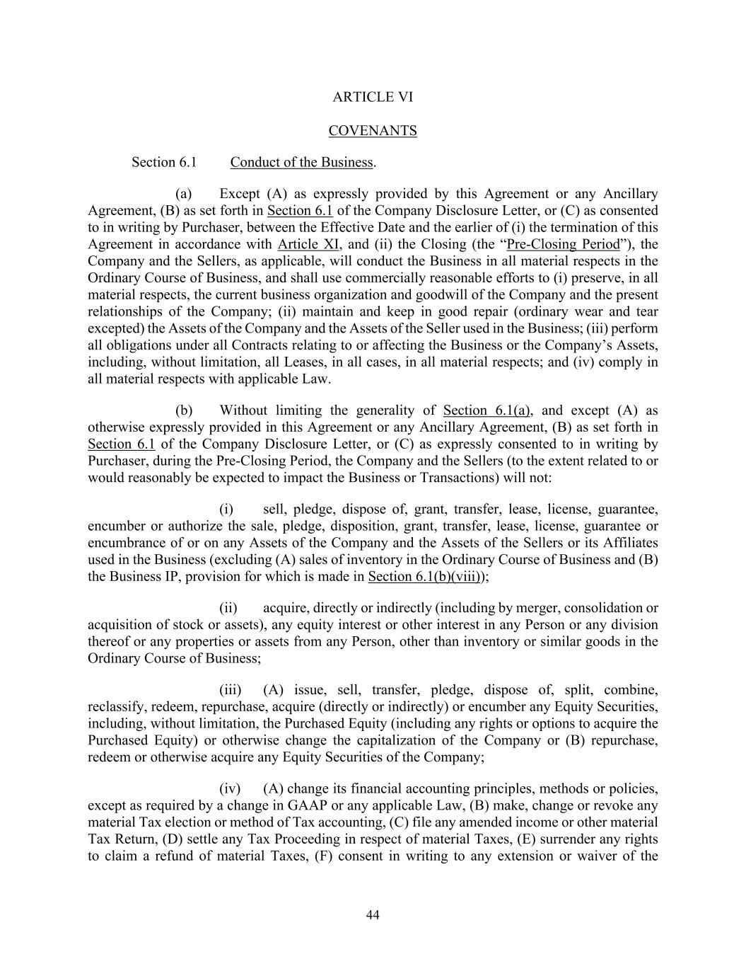 44 ARTICLE VI COVENANTS Section 6.1 Conduct of the Business. (a) Except (A) as expressly provided by this Agreement or any Ancillary Agreement, (B) as set forth in Section 6.1 of the Company Disclosure Letter, or (C) as consented to in writing by Purchaser, between the Effective Date and the earlier of (i) the termination of this Agreement in accordance with Article XI, and (ii) the Closing (the “Pre-Closing Period”), the Company and the Sellers, as applicable, will conduct the Business in all material respects in the Ordinary Course of Business, and shall use commercially reasonable efforts to (i) preserve, in all material respects, the current business organization and goodwill of the Company and the present relationships of the Company; (ii) maintain and keep in good repair (ordinary wear and tear excepted) the Assets of the Company and the Assets of the Seller used in the Business; (iii) perform all obligations under all Contracts relating to or affecting the Business or the Company’s Assets, including, without limitation, all Leases, in all cases, in all material respects; and (iv) comply in all material respects with applicable Law. (b) Without limiting the generality of Section 6.1(a), and except (A) as otherwise expressly provided in this Agreement or any Ancillary Agreement, (B) as set forth in Section 6.1 of the Company Disclosure Letter, or (C) as expressly consented to in writing by Purchaser, during the Pre-Closing Period, the Company and the Sellers (to the extent related to or would reasonably be expected to impact the Business or Transactions) will not: (i) sell, pledge, dispose of, grant, transfer, lease, license, guarantee, encumber or authorize the sale, pledge, disposition, grant, transfer, lease, license, guarantee or encumbrance of or on any Assets of the Company and the Assets of the Sellers or its Affiliates used in the Business (excluding (A) sales of inventory in the Ordinary Course of Business and (B) the Business IP, provision for which is made in Section 6.1(b)(viii)); (ii) acquire, directly or indirectly (including by merger, consolidation or acquisition of stock or assets), any equity interest or other interest in any Person or any division thereof or any properties or assets from any Person, other than inventory or similar goods in the Ordinary Course of Business; (iii) (A) issue, sell, transfer, pledge, dispose of, split, combine, reclassify, redeem, repurchase, acquire (directly or indirectly) or encumber any Equity Securities, including, without limitation, the Purchased Equity (including any rights or options to acquire the Purchased Equity) or otherwise change the capitalization of the Company or (B) repurchase, redeem or otherwise acquire any Equity Securities of the Company; (iv) (A) change its financial accounting principles, methods or policies, except as required by a change in GAAP or any applicable Law, (B) make, change or revoke any material Tax election or method of Tax accounting, (C) file any amended income or other material Tax Return, (D) settle any Tax Proceeding in respect of material Taxes, (E) surrender any rights to claim a refund of material Taxes, (F) consent in writing to any extension or waiver of the