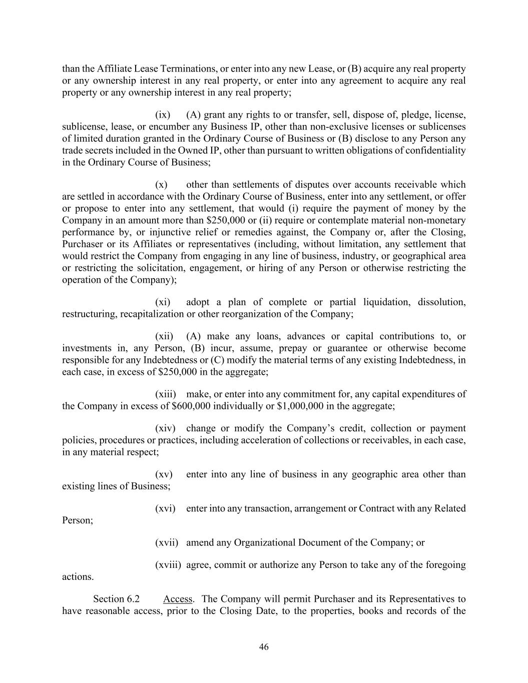 46 than the Affiliate Lease Terminations, or enter into any new Lease, or (B) acquire any real property or any ownership interest in any real property, or enter into any agreement to acquire any real property or any ownership interest in any real property; (ix) (A) grant any rights to or transfer, sell, dispose of, pledge, license, sublicense, lease, or encumber any Business IP, other than non-exclusive licenses or sublicenses of limited duration granted in the Ordinary Course of Business or (B) disclose to any Person any trade secrets included in the Owned IP, other than pursuant to written obligations of confidentiality in the Ordinary Course of Business; (x) other than settlements of disputes over accounts receivable which are settled in accordance with the Ordinary Course of Business, enter into any settlement, or offer or propose to enter into any settlement, that would (i) require the payment of money by the Company in an amount more than $250,000 or (ii) require or contemplate material non-monetary performance by, or injunctive relief or remedies against, the Company or, after the Closing, Purchaser or its Affiliates or representatives (including, without limitation, any settlement that would restrict the Company from engaging in any line of business, industry, or geographical area or restricting the solicitation, engagement, or hiring of any Person or otherwise restricting the operation of the Company); (xi) adopt a plan of complete or partial liquidation, dissolution, restructuring, recapitalization or other reorganization of the Company; (xii) (A) make any loans, advances or capital contributions to, or investments in, any Person, (B) incur, assume, prepay or guarantee or otherwise become responsible for any Indebtedness or (C) modify the material terms of any existing Indebtedness, in each case, in excess of $250,000 in the aggregate; (xiii) make, or enter into any commitment for, any capital expenditures of the Company in excess of $600,000 individually or $1,000,000 in the aggregate; (xiv) change or modify the Company’s credit, collection or payment policies, procedures or practices, including acceleration of collections or receivables, in each case, in any material respect; (xv) enter into any line of business in any geographic area other than existing lines of Business; (xvi) enter into any transaction, arrangement or Contract with any Related Person; (xvii) amend any Organizational Document of the Company; or (xviii) agree, commit or authorize any Person to take any of the foregoing actions. Section 6.2 Access. The Company will permit Purchaser and its Representatives to have reasonable access, prior to the Closing Date, to the properties, books and records of the