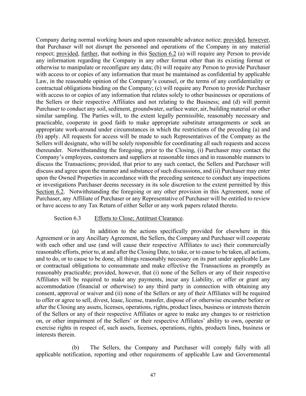 47 Company during normal working hours and upon reasonable advance notice; provided, however, that Purchaser will not disrupt the personnel and operations of the Company in any material respect; provided, further, that nothing in this Section 6.2 (a) will require any Person to provide any information regarding the Company in any other format other than its existing format or otherwise to manipulate or reconfigure any data; (b) will require any Person to provide Purchaser with access to or copies of any information that must be maintained as confidential by applicable Law, in the reasonable opinion of the Company’s counsel, or the terms of any confidentiality or contractual obligations binding on the Company; (c) will require any Person to provide Purchaser with access to or copies of any information that relates solely to other businesses or operations of the Sellers or their respective Affiliates and not relating to the Business; and (d) will permit Purchaser to conduct any soil, sediment, groundwater, surface water, air, building material or other similar sampling. The Parties will, to the extent legally permissible, reasonably necessary and practicable, cooperate in good faith to make appropriate substitute arrangements or seek an appropriate work-around under circumstances in which the restrictions of the preceding (a) and (b) apply. All requests for access will be made to such Representatives of the Company as the Sellers will designate, who will be solely responsible for coordinating all such requests and access thereunder. Notwithstanding the foregoing, prior to the Closing, (i) Purchaser may contact the Company’s employees, customers and suppliers at reasonable times and in reasonable manners to discuss the Transactions; provided, that prior to any such contact, the Sellers and Purchaser will discuss and agree upon the manner and substance of such discussions, and (ii) Purchaser may enter upon the Owned Properties in accordance with the preceding sentence to conduct any inspections or investigations Purchaser deems necessary in its sole discretion to the extent permitted by this Section 6.2. Notwithstanding the foregoing or any other provision in this Agreement, none of Purchaser, any Affiliate of Purchaser or any Representative of Purchaser will be entitled to review or have access to any Tax Return of either Seller or any work papers related thereto. Section 6.3 Efforts to Close; Antitrust Clearance. (a) In addition to the actions specifically provided for elsewhere in this Agreement or in any Ancillary Agreement, the Sellers, the Company and Purchaser will cooperate with each other and use (and will cause their respective Affiliates to use) their commercially reasonable efforts, prior to, at and after the Closing Date, to take, or to cause to be taken, all actions, and to do, or to cause to be done, all things reasonably necessary on its part under applicable Law or contractual obligations to consummate and make effective the Transactions as promptly as reasonably practicable; provided, however, that (i) none of the Sellers or any of their respective Affiliates will be required to make any payments, incur any Liability, or offer or grant any accommodation (financial or otherwise) to any third party in connection with obtaining any consent, approval or waiver and (ii) none of the Sellers or any of their Affiliates will be required to offer or agree to sell, divest, lease, license, transfer, dispose of or otherwise encumber before or after the Closing any assets, licenses, operations, rights, product lines, business or interests therein of the Sellers or any of their respective Affiliates or agree to make any changes to or restriction on, or other impairment of the Sellers’ or their respective Affiliates’ ability to own, operate or exercise rights in respect of, such assets, licenses, operations, rights, products lines, business or interests therein. (b) The Sellers, the Company and Purchaser will comply fully with all applicable notification, reporting and other requirements of applicable Law and Governmental