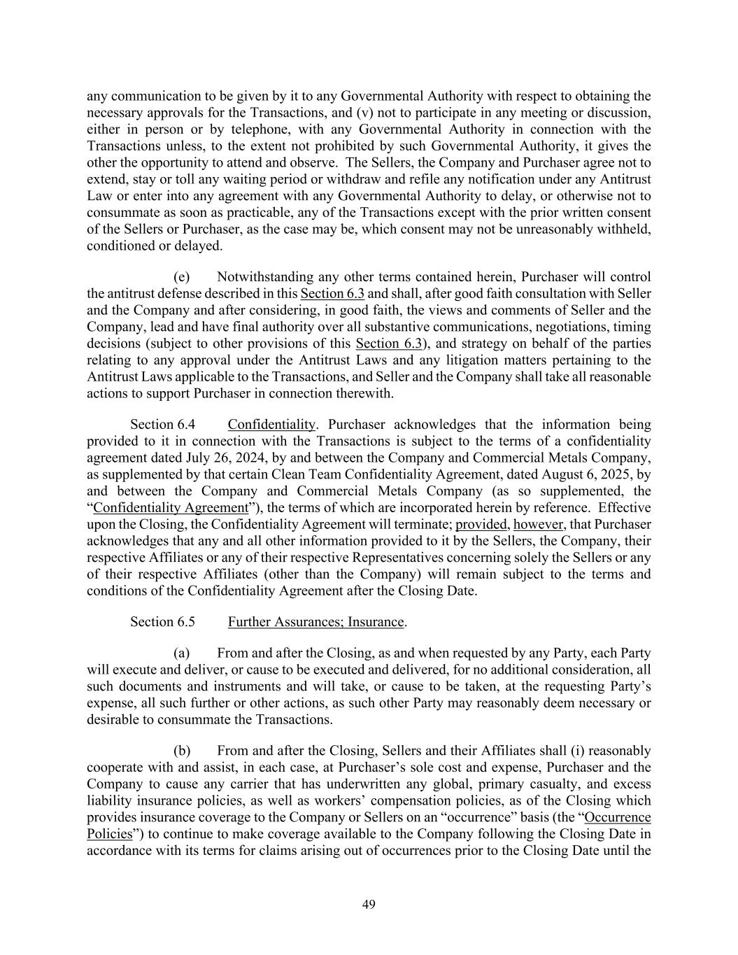 49 any communication to be given by it to any Governmental Authority with respect to obtaining the necessary approvals for the Transactions, and (v) not to participate in any meeting or discussion, either in person or by telephone, with any Governmental Authority in connection with the Transactions unless, to the extent not prohibited by such Governmental Authority, it gives the other the opportunity to attend and observe. The Sellers, the Company and Purchaser agree not to extend, stay or toll any waiting period or withdraw and refile any notification under any Antitrust Law or enter into any agreement with any Governmental Authority to delay, or otherwise not to consummate as soon as practicable, any of the Transactions except with the prior written consent of the Sellers or Purchaser, as the case may be, which consent may not be unreasonably withheld, conditioned or delayed. (e) Notwithstanding any other terms contained herein, Purchaser will control the antitrust defense described in this Section 6.3 and shall, after good faith consultation with Seller and the Company and after considering, in good faith, the views and comments of Seller and the Company, lead and have final authority over all substantive communications, negotiations, timing decisions (subject to other provisions of this Section 6.3), and strategy on behalf of the parties relating to any approval under the Antitrust Laws and any litigation matters pertaining to the Antitrust Laws applicable to the Transactions, and Seller and the Company shall take all reasonable actions to support Purchaser in connection therewith. Section 6.4 Confidentiality. Purchaser acknowledges that the information being provided to it in connection with the Transactions is subject to the terms of a confidentiality agreement dated July 26, 2024, by and between the Company and Commercial Metals Company, as supplemented by that certain Clean Team Confidentiality Agreement, dated August 6, 2025, by and between the Company and Commercial Metals Company (as so supplemented, the “Confidentiality Agreement”), the terms of which are incorporated herein by reference. Effective upon the Closing, the Confidentiality Agreement will terminate; provided, however, that Purchaser acknowledges that any and all other information provided to it by the Sellers, the Company, their respective Affiliates or any of their respective Representatives concerning solely the Sellers or any of their respective Affiliates (other than the Company) will remain subject to the terms and conditions of the Confidentiality Agreement after the Closing Date. Section 6.5 Further Assurances; Insurance. (a) From and after the Closing, as and when requested by any Party, each Party will execute and deliver, or cause to be executed and delivered, for no additional consideration, all such documents and instruments and will take, or cause to be taken, at the requesting Party’s expense, all such further or other actions, as such other Party may reasonably deem necessary or desirable to consummate the Transactions. (b) From and after the Closing, Sellers and their Affiliates shall (i) reasonably cooperate with and assist, in each case, at Purchaser’s sole cost and expense, Purchaser and the Company to cause any carrier that has underwritten any global, primary casualty, and excess liability insurance policies, as well as workers’ compensation policies, as of the Closing which provides insurance coverage to the Company or Sellers on an “occurrence” basis (the “Occurrence Policies”) to continue to make coverage available to the Company following the Closing Date in accordance with its terms for claims arising out of occurrences prior to the Closing Date until the
