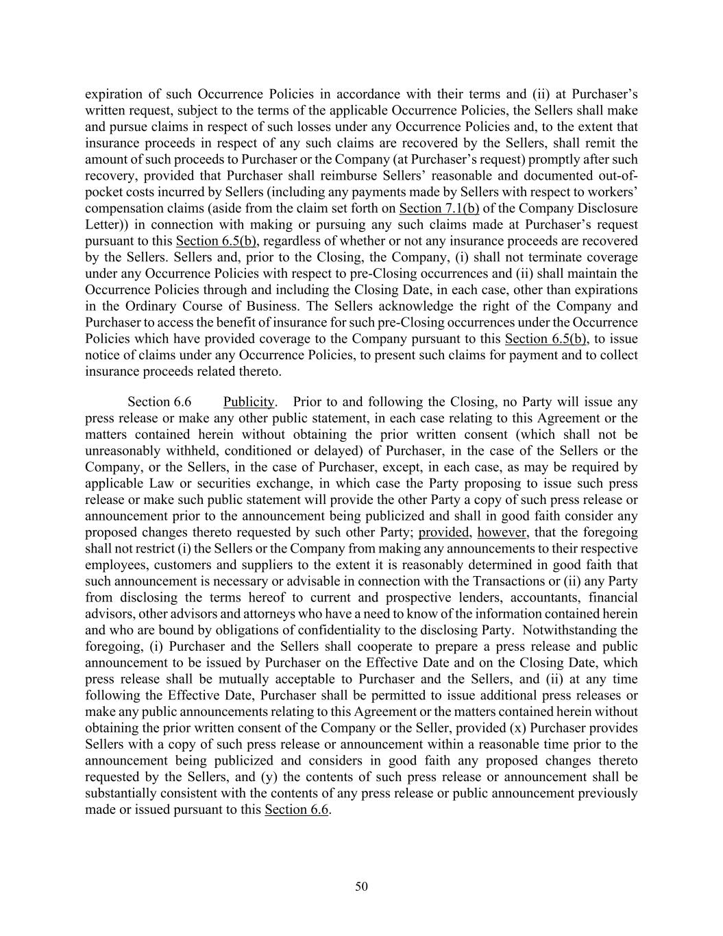 50 expiration of such Occurrence Policies in accordance with their terms and (ii) at Purchaser’s written request, subject to the terms of the applicable Occurrence Policies, the Sellers shall make and pursue claims in respect of such losses under any Occurrence Policies and, to the extent that insurance proceeds in respect of any such claims are recovered by the Sellers, shall remit the amount of such proceeds to Purchaser or the Company (at Purchaser’s request) promptly after such recovery, provided that Purchaser shall reimburse Sellers’ reasonable and documented out-of- pocket costs incurred by Sellers (including any payments made by Sellers with respect to workers’ compensation claims (aside from the claim set forth on Section 7.1(b) of the Company Disclosure Letter)) in connection with making or pursuing any such claims made at Purchaser’s request pursuant to this Section 6.5(b), regardless of whether or not any insurance proceeds are recovered by the Sellers. Sellers and, prior to the Closing, the Company, (i) shall not terminate coverage under any Occurrence Policies with respect to pre-Closing occurrences and (ii) shall maintain the Occurrence Policies through and including the Closing Date, in each case, other than expirations in the Ordinary Course of Business. The Sellers acknowledge the right of the Company and Purchaser to access the benefit of insurance for such pre-Closing occurrences under the Occurrence Policies which have provided coverage to the Company pursuant to this Section 6.5(b), to issue notice of claims under any Occurrence Policies, to present such claims for payment and to collect insurance proceeds related thereto. Section 6.6 Publicity. Prior to and following the Closing, no Party will issue any press release or make any other public statement, in each case relating to this Agreement or the matters contained herein without obtaining the prior written consent (which shall not be unreasonably withheld, conditioned or delayed) of Purchaser, in the case of the Sellers or the Company, or the Sellers, in the case of Purchaser, except, in each case, as may be required by applicable Law or securities exchange, in which case the Party proposing to issue such press release or make such public statement will provide the other Party a copy of such press release or announcement prior to the announcement being publicized and shall in good faith consider any proposed changes thereto requested by such other Party; provided, however, that the foregoing shall not restrict (i) the Sellers or the Company from making any announcements to their respective employees, customers and suppliers to the extent it is reasonably determined in good faith that such announcement is necessary or advisable in connection with the Transactions or (ii) any Party from disclosing the terms hereof to current and prospective lenders, accountants, financial advisors, other advisors and attorneys who have a need to know of the information contained herein and who are bound by obligations of confidentiality to the disclosing Party. Notwithstanding the foregoing, (i) Purchaser and the Sellers shall cooperate to prepare a press release and public announcement to be issued by Purchaser on the Effective Date and on the Closing Date, which press release shall be mutually acceptable to Purchaser and the Sellers, and (ii) at any time following the Effective Date, Purchaser shall be permitted to issue additional press releases or make any public announcements relating to this Agreement or the matters contained herein without obtaining the prior written consent of the Company or the Seller, provided (x) Purchaser provides Sellers with a copy of such press release or announcement within a reasonable time prior to the announcement being publicized and considers in good faith any proposed changes thereto requested by the Sellers, and (y) the contents of such press release or announcement shall be substantially consistent with the contents of any press release or public announcement previously made or issued pursuant to this Section 6.6.