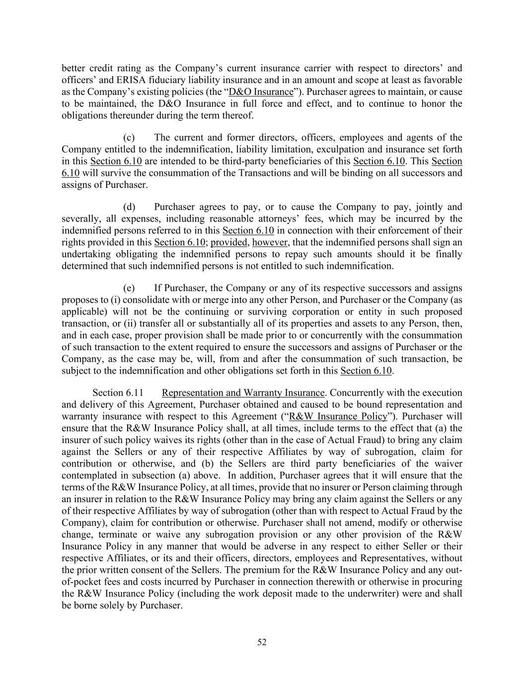 52 better credit rating as the Company’s current insurance carrier with respect to directors’ and officers’ and ERISA fiduciary liability insurance and in an amount and scope at least as favorable as the Company’s existing policies (the “D&O Insurance”). Purchaser agrees to maintain, or cause to be maintained, the D&O Insurance in full force and effect, and to continue to honor the obligations thereunder during the term thereof. (c) The current and former directors, officers, employees and agents of the Company entitled to the indemnification, liability limitation, exculpation and insurance set forth in this Section 6.10 are intended to be third-party beneficiaries of this Section 6.10. This Section 6.10 will survive the consummation of the Transactions and will be binding on all successors and assigns of Purchaser. (d) Purchaser agrees to pay, or to cause the Company to pay, jointly and severally, all expenses, including reasonable attorneys’ fees, which may be incurred by the indemnified persons referred to in this Section 6.10 in connection with their enforcement of their rights provided in this Section 6.10; provided, however, that the indemnified persons shall sign an undertaking obligating the indemnified persons to repay such amounts should it be finally determined that such indemnified persons is not entitled to such indemnification. (e) If Purchaser, the Company or any of its respective successors and assigns proposes to (i) consolidate with or merge into any other Person, and Purchaser or the Company (as applicable) will not be the continuing or surviving corporation or entity in such proposed transaction, or (ii) transfer all or substantially all of its properties and assets to any Person, then, and in each case, proper provision shall be made prior to or concurrently with the consummation of such transaction to the extent required to ensure the successors and assigns of Purchaser or the Company, as the case may be, will, from and after the consummation of such transaction, be subject to the indemnification and other obligations set forth in this Section 6.10. Section 6.11 Representation and Warranty Insurance. Concurrently with the execution and delivery of this Agreement, Purchaser obtained and caused to be bound representation and warranty insurance with respect to this Agreement (“R&W Insurance Policy”). Purchaser will ensure that the R&W Insurance Policy shall, at all times, include terms to the effect that (a) the insurer of such policy waives its rights (other than in the case of Actual Fraud) to bring any claim against the Sellers or any of their respective Affiliates by way of subrogation, claim for contribution or otherwise, and (b) the Sellers are third party beneficiaries of the waiver contemplated in subsection (a) above. In addition, Purchaser agrees that it will ensure that the terms of the R&W Insurance Policy, at all times, provide that no insurer or Person claiming through an insurer in relation to the R&W Insurance Policy may bring any claim against the Sellers or any of their respective Affiliates by way of subrogation (other than with respect to Actual Fraud by the Company), claim for contribution or otherwise. Purchaser shall not amend, modify or otherwise change, terminate or waive any subrogation provision or any other provision of the R&W Insurance Policy in any manner that would be adverse in any respect to either Seller or their respective Affiliates, or its and their officers, directors, employees and Representatives, without the prior written consent of the Sellers. The premium for the R&W Insurance Policy and any out- of-pocket fees and costs incurred by Purchaser in connection therewith or otherwise in procuring the R&W Insurance Policy (including the work deposit made to the underwriter) were and shall be borne solely by Purchaser.