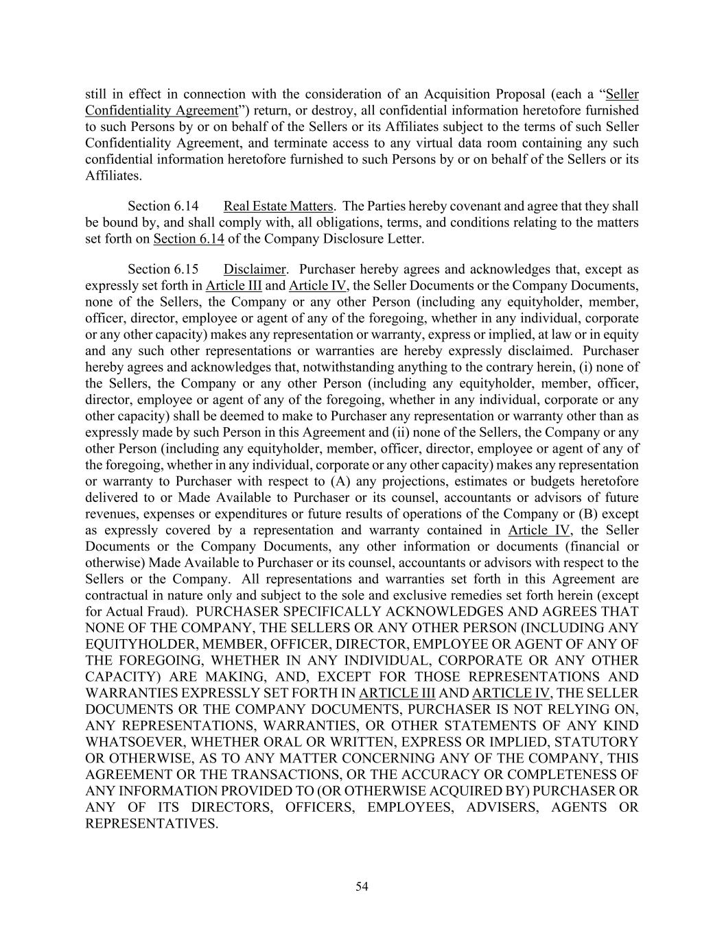 54 still in effect in connection with the consideration of an Acquisition Proposal (each a “Seller Confidentiality Agreement”) return, or destroy, all confidential information heretofore furnished to such Persons by or on behalf of the Sellers or its Affiliates subject to the terms of such Seller Confidentiality Agreement, and terminate access to any virtual data room containing any such confidential information heretofore furnished to such Persons by or on behalf of the Sellers or its Affiliates. Section 6.14 Real Estate Matters. The Parties hereby covenant and agree that they shall be bound by, and shall comply with, all obligations, terms, and conditions relating to the matters set forth on Section 6.14 of the Company Disclosure Letter. Section 6.15 Disclaimer. Purchaser hereby agrees and acknowledges that, except as expressly set forth in Article III and Article IV, the Seller Documents or the Company Documents, none of the Sellers, the Company or any other Person (including any equityholder, member, officer, director, employee or agent of any of the foregoing, whether in any individual, corporate or any other capacity) makes any representation or warranty, express or implied, at law or in equity and any such other representations or warranties are hereby expressly disclaimed. Purchaser hereby agrees and acknowledges that, notwithstanding anything to the contrary herein, (i) none of the Sellers, the Company or any other Person (including any equityholder, member, officer, director, employee or agent of any of the foregoing, whether in any individual, corporate or any other capacity) shall be deemed to make to Purchaser any representation or warranty other than as expressly made by such Person in this Agreement and (ii) none of the Sellers, the Company or any other Person (including any equityholder, member, officer, director, employee or agent of any of the foregoing, whether in any individual, corporate or any other capacity) makes any representation or warranty to Purchaser with respect to (A) any projections, estimates or budgets heretofore delivered to or Made Available to Purchaser or its counsel, accountants or advisors of future revenues, expenses or expenditures or future results of operations of the Company or (B) except as expressly covered by a representation and warranty contained in Article IV, the Seller Documents or the Company Documents, any other information or documents (financial or otherwise) Made Available to Purchaser or its counsel, accountants or advisors with respect to the Sellers or the Company. All representations and warranties set forth in this Agreement are contractual in nature only and subject to the sole and exclusive remedies set forth herein (except for Actual Fraud). PURCHASER SPECIFICALLY ACKNOWLEDGES AND AGREES THAT NONE OF THE COMPANY, THE SELLERS OR ANY OTHER PERSON (INCLUDING ANY EQUITYHOLDER, MEMBER, OFFICER, DIRECTOR, EMPLOYEE OR AGENT OF ANY OF THE FOREGOING, WHETHER IN ANY INDIVIDUAL, CORPORATE OR ANY OTHER CAPACITY) ARE MAKING, AND, EXCEPT FOR THOSE REPRESENTATIONS AND WARRANTIES EXPRESSLY SET FORTH IN ARTICLE III AND ARTICLE IV, THE SELLER DOCUMENTS OR THE COMPANY DOCUMENTS, PURCHASER IS NOT RELYING ON, ANY REPRESENTATIONS, WARRANTIES, OR OTHER STATEMENTS OF ANY KIND WHATSOEVER, WHETHER ORAL OR WRITTEN, EXPRESS OR IMPLIED, STATUTORY OR OTHERWISE, AS TO ANY MATTER CONCERNING ANY OF THE COMPANY, THIS AGREEMENT OR THE TRANSACTIONS, OR THE ACCURACY OR COMPLETENESS OF ANY INFORMATION PROVIDED TO (OR OTHERWISE ACQUIRED BY) PURCHASER OR ANY OF ITS DIRECTORS, OFFICERS, EMPLOYEES, ADVISERS, AGENTS OR REPRESENTATIVES.
