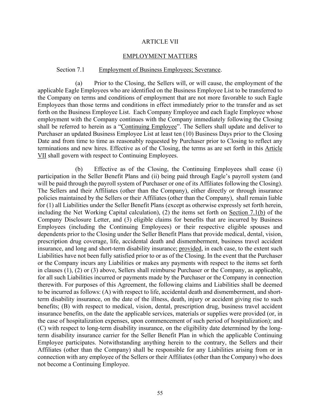 55 ARTICLE VII EMPLOYMENT MATTERS Section 7.1 Employment of Business Employees; Severance. (a) Prior to the Closing, the Sellers will, or will cause, the employment of the applicable Eagle Employees who are identified on the Business Employee List to be transferred to the Company on terms and conditions of employment that are not more favorable to such Eagle Employees than those terms and conditions in effect immediately prior to the transfer and as set forth on the Business Employee List. Each Company Employee and each Eagle Employee whose employment with the Company continues with the Company immediately following the Closing shall be referred to herein as a “Continuing Employee”. The Sellers shall update and deliver to Purchaser an updated Business Employee List at least ten (10) Business Days prior to the Closing Date and from time to time as reasonably requested by Purchaser prior to Closing to reflect any terminations and new hires. Effective as of the Closing, the terms as are set forth in this Article VII shall govern with respect to Continuing Employees. (b) Effective as of the Closing, the Continuing Employees shall cease (i) participation in the Seller Benefit Plans and (ii) being paid through Eagle’s payroll system (and will be paid through the payroll system of Purchaser or one of its Affiliates following the Closing). The Sellers and their Affiliates (other than the Company), either directly or through insurance policies maintained by the Sellers or their Affiliates (other than the Company), shall remain liable for (1) all Liabilities under the Seller Benefit Plans (except as otherwise expressly set forth herein, including the Net Working Capital calculation), (2) the items set forth on Section 7.1(b) of the Company Disclosure Letter, and (3) eligible claims for benefits that are incurred by Business Employees (including the Continuing Employees) or their respective eligible spouses and dependents prior to the Closing under the Seller Benefit Plans that provide medical, dental, vision, prescription drug coverage, life, accidental death and dismemberment, business travel accident insurance, and long and short-term disability insurance; provided, in each case, to the extent such Liabilities have not been fully satisfied prior to or as of the Closing. In the event that the Purchaser or the Company incurs any Liabilities or makes any payments with respect to the items set forth in clauses (1), (2) or (3) above, Sellers shall reimburse Purchaser or the Company, as applicable, for all such Liabilities incurred or payments made by the Purchaser or the Company in connection therewith. For purposes of this Agreement, the following claims and Liabilities shall be deemed to be incurred as follows: (A) with respect to life, accidental death and dismemberment, and short- term disability insurance, on the date of the illness, death, injury or accident giving rise to such benefits; (B) with respect to medical, vision, dental, prescription drug, business travel accident insurance benefits, on the date the applicable services, materials or supplies were provided (or, in the case of hospitalization expenses, upon commencement of such period of hospitalization); and (C) with respect to long-term disability insurance, on the eligibility date determined by the long- term disability insurance carrier for the Seller Benefit Plan in which the applicable Continuing Employee participates. Notwithstanding anything herein to the contrary, the Sellers and their Affiliates (other than the Company) shall be responsible for any Liabilities arising from or in connection with any employee of the Sellers or their Affiliates (other than the Company) who does not become a Continuing Employee.