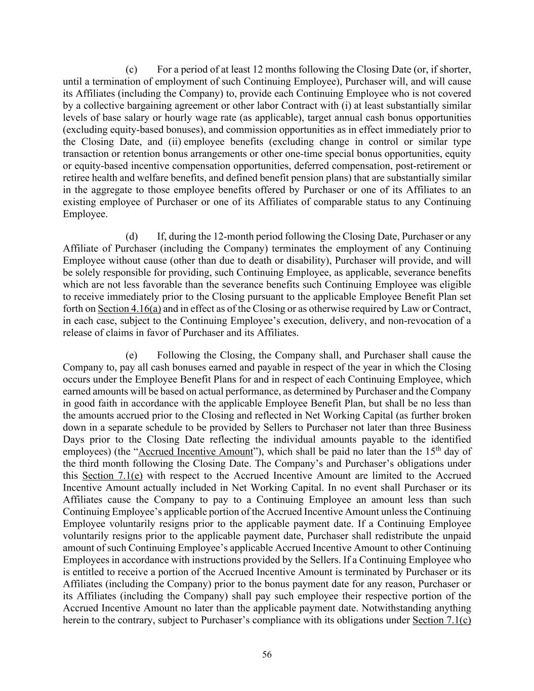 56 (c) For a period of at least 12 months following the Closing Date (or, if shorter, until a termination of employment of such Continuing Employee), Purchaser will, and will cause its Affiliates (including the Company) to, provide each Continuing Employee who is not covered by a collective bargaining agreement or other labor Contract with (i) at least substantially similar levels of base salary or hourly wage rate (as applicable), target annual cash bonus opportunities (excluding equity-based bonuses), and commission opportunities as in effect immediately prior to the Closing Date, and (ii) employee benefits (excluding change in control or similar type transaction or retention bonus arrangements or other one-time special bonus opportunities, equity or equity-based incentive compensation opportunities, deferred compensation, post-retirement or retiree health and welfare benefits, and defined benefit pension plans) that are substantially similar in the aggregate to those employee benefits offered by Purchaser or one of its Affiliates to an existing employee of Purchaser or one of its Affiliates of comparable status to any Continuing Employee. (d) If, during the 12-month period following the Closing Date, Purchaser or any Affiliate of Purchaser (including the Company) terminates the employment of any Continuing Employee without cause (other than due to death or disability), Purchaser will provide, and will be solely responsible for providing, such Continuing Employee, as applicable, severance benefits which are not less favorable than the severance benefits such Continuing Employee was eligible to receive immediately prior to the Closing pursuant to the applicable Employee Benefit Plan set forth on Section 4.16(a) and in effect as of the Closing or as otherwise required by Law or Contract, in each case, subject to the Continuing Employee’s execution, delivery, and non-revocation of a release of claims in favor of Purchaser and its Affiliates. (e) Following the Closing, the Company shall, and Purchaser shall cause the Company to, pay all cash bonuses earned and payable in respect of the year in which the Closing occurs under the Employee Benefit Plans for and in respect of each Continuing Employee, which earned amounts will be based on actual performance, as determined by Purchaser and the Company in good faith in accordance with the applicable Employee Benefit Plan, but shall be no less than the amounts accrued prior to the Closing and reflected in Net Working Capital (as further broken down in a separate schedule to be provided by Sellers to Purchaser not later than three Business Days prior to the Closing Date reflecting the individual amounts payable to the identified employees) (the “Accrued Incentive Amount”), which shall be paid no later than the 15th day of the third month following the Closing Date. The Company’s and Purchaser’s obligations under this Section 7.1(e) with respect to the Accrued Incentive Amount are limited to the Accrued Incentive Amount actually included in Net Working Capital. In no event shall Purchaser or its Affiliates cause the Company to pay to a Continuing Employee an amount less than such Continuing Employee’s applicable portion of the Accrued Incentive Amount unless the Continuing Employee voluntarily resigns prior to the applicable payment date. If a Continuing Employee voluntarily resigns prior to the applicable payment date, Purchaser shall redistribute the unpaid amount of such Continuing Employee’s applicable Accrued Incentive Amount to other Continuing Employees in accordance with instructions provided by the Sellers. If a Continuing Employee who is entitled to receive a portion of the Accrued Incentive Amount is terminated by Purchaser or its Affiliates (including the Company) prior to the bonus payment date for any reason, Purchaser or its Affiliates (including the Company) shall pay such employee their respective portion of the Accrued Incentive Amount no later than the applicable payment date. Notwithstanding anything herein to the contrary, subject to Purchaser’s compliance with its obligations under Section 7.1(c)