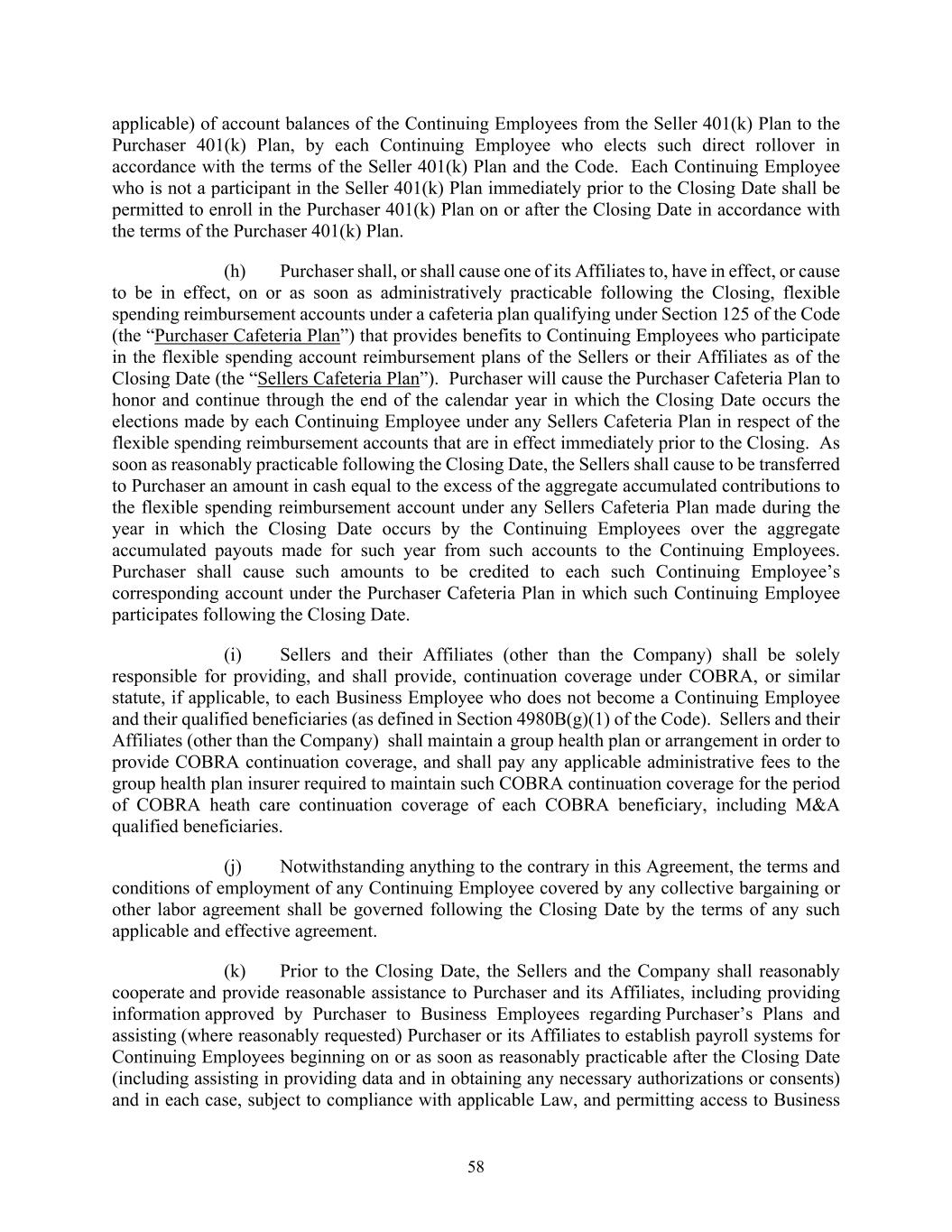 58 applicable) of account balances of the Continuing Employees from the Seller 401(k) Plan to the Purchaser 401(k) Plan, by each Continuing Employee who elects such direct rollover in accordance with the terms of the Seller 401(k) Plan and the Code. Each Continuing Employee who is not a participant in the Seller 401(k) Plan immediately prior to the Closing Date shall be permitted to enroll in the Purchaser 401(k) Plan on or after the Closing Date in accordance with the terms of the Purchaser 401(k) Plan. (h) Purchaser shall, or shall cause one of its Affiliates to, have in effect, or cause to be in effect, on or as soon as administratively practicable following the Closing, flexible spending reimbursement accounts under a cafeteria plan qualifying under Section 125 of the Code (the “Purchaser Cafeteria Plan”) that provides benefits to Continuing Employees who participate in the flexible spending account reimbursement plans of the Sellers or their Affiliates as of the Closing Date (the “Sellers Cafeteria Plan”). Purchaser will cause the Purchaser Cafeteria Plan to honor and continue through the end of the calendar year in which the Closing Date occurs the elections made by each Continuing Employee under any Sellers Cafeteria Plan in respect of the flexible spending reimbursement accounts that are in effect immediately prior to the Closing. As soon as reasonably practicable following the Closing Date, the Sellers shall cause to be transferred to Purchaser an amount in cash equal to the excess of the aggregate accumulated contributions to the flexible spending reimbursement account under any Sellers Cafeteria Plan made during the year in which the Closing Date occurs by the Continuing Employees over the aggregate accumulated payouts made for such year from such accounts to the Continuing Employees. Purchaser shall cause such amounts to be credited to each such Continuing Employee’s corresponding account under the Purchaser Cafeteria Plan in which such Continuing Employee participates following the Closing Date. (i) Sellers and their Affiliates (other than the Company) shall be solely responsible for providing, and shall provide, continuation coverage under COBRA, or similar statute, if applicable, to each Business Employee who does not become a Continuing Employee and their qualified beneficiaries (as defined in Section 4980B(g)(1) of the Code). Sellers and their Affiliates (other than the Company) shall maintain a group health plan or arrangement in order to provide COBRA continuation coverage, and shall pay any applicable administrative fees to the group health plan insurer required to maintain such COBRA continuation coverage for the period of COBRA heath care continuation coverage of each COBRA beneficiary, including M&A qualified beneficiaries. (j) Notwithstanding anything to the contrary in this Agreement, the terms and conditions of employment of any Continuing Employee covered by any collective bargaining or other labor agreement shall be governed following the Closing Date by the terms of any such applicable and effective agreement. (k) Prior to the Closing Date, the Sellers and the Company shall reasonably cooperate and provide reasonable assistance to Purchaser and its Affiliates, including providing information approved by Purchaser to Business Employees regarding Purchaser’s Plans and assisting (where reasonably requested) Purchaser or its Affiliates to establish payroll systems for Continuing Employees beginning on or as soon as reasonably practicable after the Closing Date (including assisting in providing data and in obtaining any necessary authorizations or consents) and in each case, subject to compliance with applicable Law, and permitting access to Business