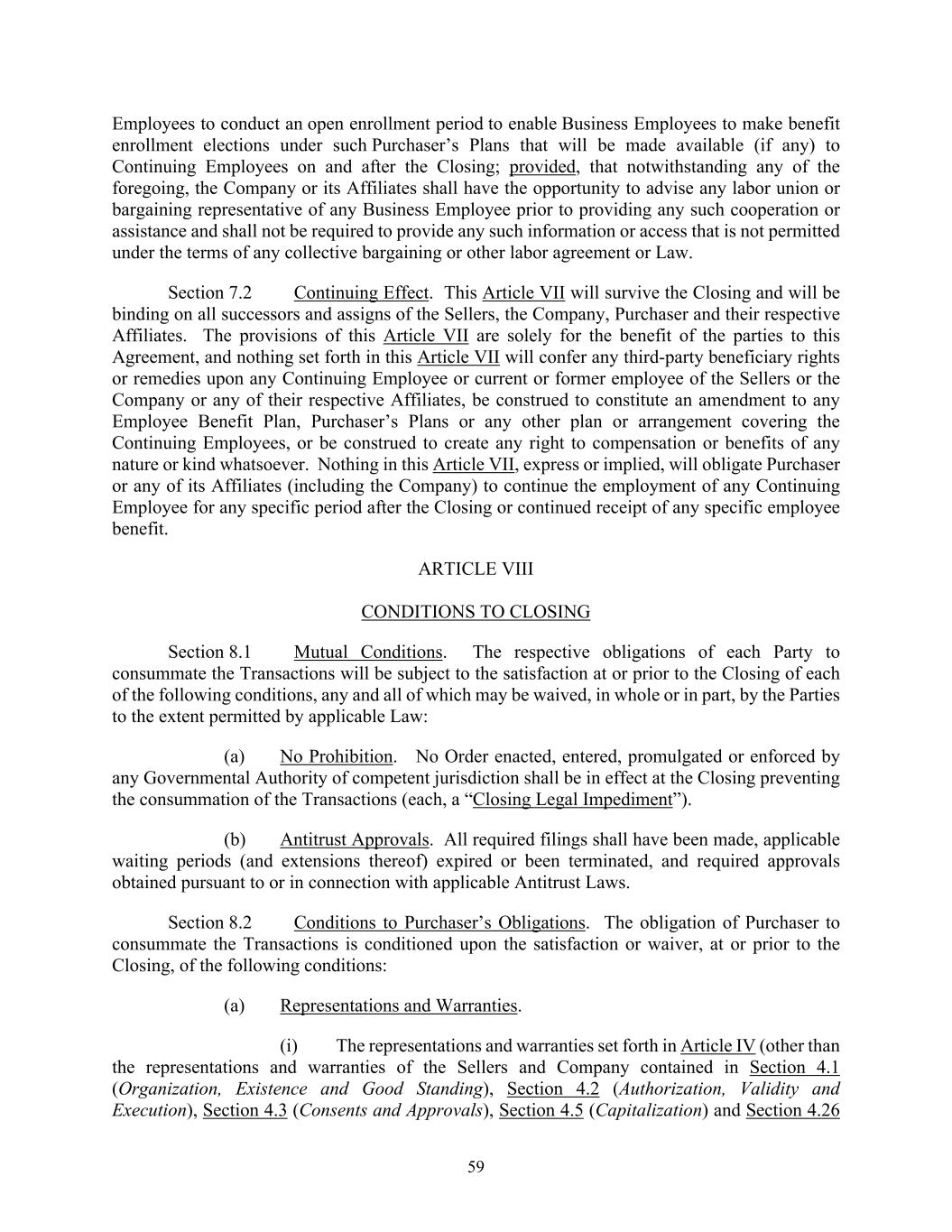59 Employees to conduct an open enrollment period to enable Business Employees to make benefit enrollment elections under such Purchaser’s Plans that will be made available (if any) to Continuing Employees on and after the Closing; provided, that notwithstanding any of the foregoing, the Company or its Affiliates shall have the opportunity to advise any labor union or bargaining representative of any Business Employee prior to providing any such cooperation or assistance and shall not be required to provide any such information or access that is not permitted under the terms of any collective bargaining or other labor agreement or Law. Section 7.2 Continuing Effect. This Article VII will survive the Closing and will be binding on all successors and assigns of the Sellers, the Company, Purchaser and their respective Affiliates. The provisions of this Article VII are solely for the benefit of the parties to this Agreement, and nothing set forth in this Article VII will confer any third-party beneficiary rights or remedies upon any Continuing Employee or current or former employee of the Sellers or the Company or any of their respective Affiliates, be construed to constitute an amendment to any Employee Benefit Plan, Purchaser’s Plans or any other plan or arrangement covering the Continuing Employees, or be construed to create any right to compensation or benefits of any nature or kind whatsoever. Nothing in this Article VII, express or implied, will obligate Purchaser or any of its Affiliates (including the Company) to continue the employment of any Continuing Employee for any specific period after the Closing or continued receipt of any specific employee benefit. ARTICLE VIII CONDITIONS TO CLOSING Section 8.1 Mutual Conditions. The respective obligations of each Party to consummate the Transactions will be subject to the satisfaction at or prior to the Closing of each of the following conditions, any and all of which may be waived, in whole or in part, by the Parties to the extent permitted by applicable Law: (a) No Prohibition. No Order enacted, entered, promulgated or enforced by any Governmental Authority of competent jurisdiction shall be in effect at the Closing preventing the consummation of the Transactions (each, a “Closing Legal Impediment”). (b) Antitrust Approvals. All required filings shall have been made, applicable waiting periods (and extensions thereof) expired or been terminated, and required approvals obtained pursuant to or in connection with applicable Antitrust Laws. Section 8.2 Conditions to Purchaser’s Obligations. The obligation of Purchaser to consummate the Transactions is conditioned upon the satisfaction or waiver, at or prior to the Closing, of the following conditions: (a) Representations and Warranties. (i) The representations and warranties set forth in Article IV (other than the representations and warranties of the Sellers and Company contained in Section 4.1 (Organization, Existence and Good Standing), Section 4.2 (Authorization, Validity and Execution), Section 4.3 (Consents and Approvals), Section 4.5 (Capitalization) and Section 4.26