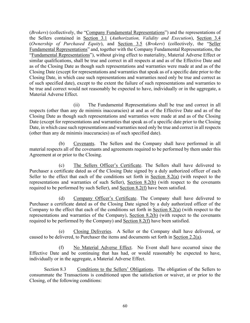 60 (Brokers) (collectively, the “Company Fundamental Representations”) and the representations of the Sellers contained in Section 3.1 (Authorization, Validity and Execution), Section 3.4 (Ownership of Purchased Equity), and Section 3.5 (Brokers) (collectively, the “Seller Fundamental Representations” and, together with the Company Fundamental Representations, the “Fundamental Representations”), without giving effect to materiality, Material Adverse Effect or similar qualifications, shall be true and correct in all respects at and as of the Effective Date and as of the Closing Date as though such representations and warranties were made at and as of the Closing Date (except for representations and warranties that speak as of a specific date prior to the Closing Date, in which case such representations and warranties need only be true and correct as of such specified date), except to the extent the failure of such representations and warranties to be true and correct would not reasonably be expected to have, individually or in the aggregate, a Material Adverse Effect. (ii) The Fundamental Representations shall be true and correct in all respects (other than any de minimis inaccuracies) at and as of the Effective Date and as of the Closing Date as though such representations and warranties were made at and as of the Closing Date (except for representations and warranties that speak as of a specific date prior to the Closing Date, in which case such representations and warranties need only be true and correct in all respects (other than any de minimis inaccuracies) as of such specified date). (b) Covenants. The Sellers and the Company shall have performed in all material respects all of the covenants and agreements required to be performed by them under this Agreement at or prior to the Closing. (c) The Sellers Officer’s Certificate. The Sellers shall have delivered to Purchaser a certificate dated as of the Closing Date signed by a duly authorized officer of each Seller to the effect that each of the conditions set forth in Section 8.2(a) (with respect to the representations and warranties of such Seller), Section 8.2(b) (with respect to the covenants required to be performed by such Seller), and Section 8.2(f) have been satisfied. (d) Company Officer’s Certificate. The Company shall have delivered to Purchaser a certificate dated as of the Closing Date signed by a duly authorized officer of the Company to the effect that each of the conditions set forth in Section 8.2(a) (with respect to the representations and warranties of the Company), Section 8.2(b) (with respect to the covenants required to be performed by the Company) and Section 8.2(f) have been satisfied. (e) Closing Deliveries. A Seller or the Company shall have delivered, or caused to be delivered, to Purchaser the items and documents set forth in Section 2.2(a). (f) No Material Adverse Effect. No Event shall have occurred since the Effective Date and be continuing that has had, or would reasonably be expected to have, individually or in the aggregate, a Material Adverse Effect. Section 8.3 Conditions to the Sellers’ Obligations. The obligation of the Sellers to consummate the Transactions is conditioned upon the satisfaction or waiver, at or prior to the Closing, of the following conditions: