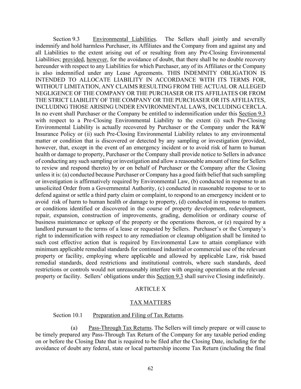 62 Section 9.3 Environmental Liabilities. The Sellers shall jointly and severally indemnify and hold harmless Purchaser, its Affiliates and the Company from and against any and all Liabilities to the extent arising out of or resulting from any Pre-Closing Environmental Liabilities; provided, however, for the avoidance of doubt, that there shall be no double recovery hereunder with respect to any Liabilities for which Purchaser, any of its Affiliates or the Company is also indemnified under any Lease Agreements. THIS INDEMNITY OBLIGATION IS INTENDED TO ALLOCATE LIABILITY IN ACCORDANCE WITH ITS TERMS FOR, WITHOUT LIMITATION, ANY CLAIMS RESULTING FROM THE ACTUAL OR ALLEGED NEGLIGENCE OF THE COMPANY OR THE PURCHASER OR ITS AFFILIATES OR FROM THE STRICT LIABILITY OF THE COMPANY OR THE PURCHASER OR ITS AFFILIATES, INCLUDING THOSE ARISING UNDER ENVIRONMENTAL LAWS, INCLUDING CERCLA. In no event shall Purchaser or the Company be entitled to indemnification under this Section 9.3 with respect to a Pre-Closing Environmental Liability to the extent (i) such Pre-Closing Environmental Liability is actually recovered by Purchaser or the Company under the R&W Insurance Policy or (ii) such Pre-Closing Environmental Liability relates to any environmental matter or condition that is discovered or detected by any sampling or investigation (provided, however, that, except in the event of an emergency incident or to avoid risk of harm to human health or damage to property, Purchaser or the Company shall provide notice to Sellers in advance of conducting any such sampling or investigation and allow a reasonable amount of time for Sellers to review and respond thereto) by or on behalf of Purchaser or the Company after the Closing unless it is: (a) conducted because Purchaser or Company has a good faith belief that such sampling or investigation is affirmatively required by Environmental Law, (b) conducted in response to an unsolicited Order from a Governmental Authority, (c) conducted in reasonable response to or to defend against or settle a third party claim or complaint, to respond to an emergency incident or to avoid risk of harm to human health or damage to property, (d) conducted in response to matters or conditions identified or discovered in the course of property development, redevelopment, repair, expansion, construction of improvements, grading, demolition or ordinary course of business maintenance or upkeep of the property or the operations thereon, or (e) required by a landlord pursuant to the terms of a lease or requested by Sellers. Purchaser’s or the Company’s right to indemnification with respect to any remediation or cleanup obligation shall be limited to such cost effective action that is required by Environmental Law to attain compliance with minimum applicable remedial standards for continued industrial or commercial use of the relevant property or facility, employing where applicable and allowed by applicable Law, risk based remedial standards, deed restrictions and institutional controls, where such standards, deed restrictions or controls would not unreasonably interfere with ongoing operations at the relevant property or facility. Sellers’ obligations under this Section 9.3 shall survive Closing indefinitely. ARTICLE X TAX MATTERS Section 10.1 Preparation and Filing of Tax Returns. (a) Pass-Through Tax Returns. The Sellers will timely prepare or will cause to be timely prepared any Pass-Through Tax Return of the Company for any taxable period ending on or before the Closing Date that is required to be filed after the Closing Date, including for the avoidance of doubt any federal, state or local partnership income Tax Return (including the final