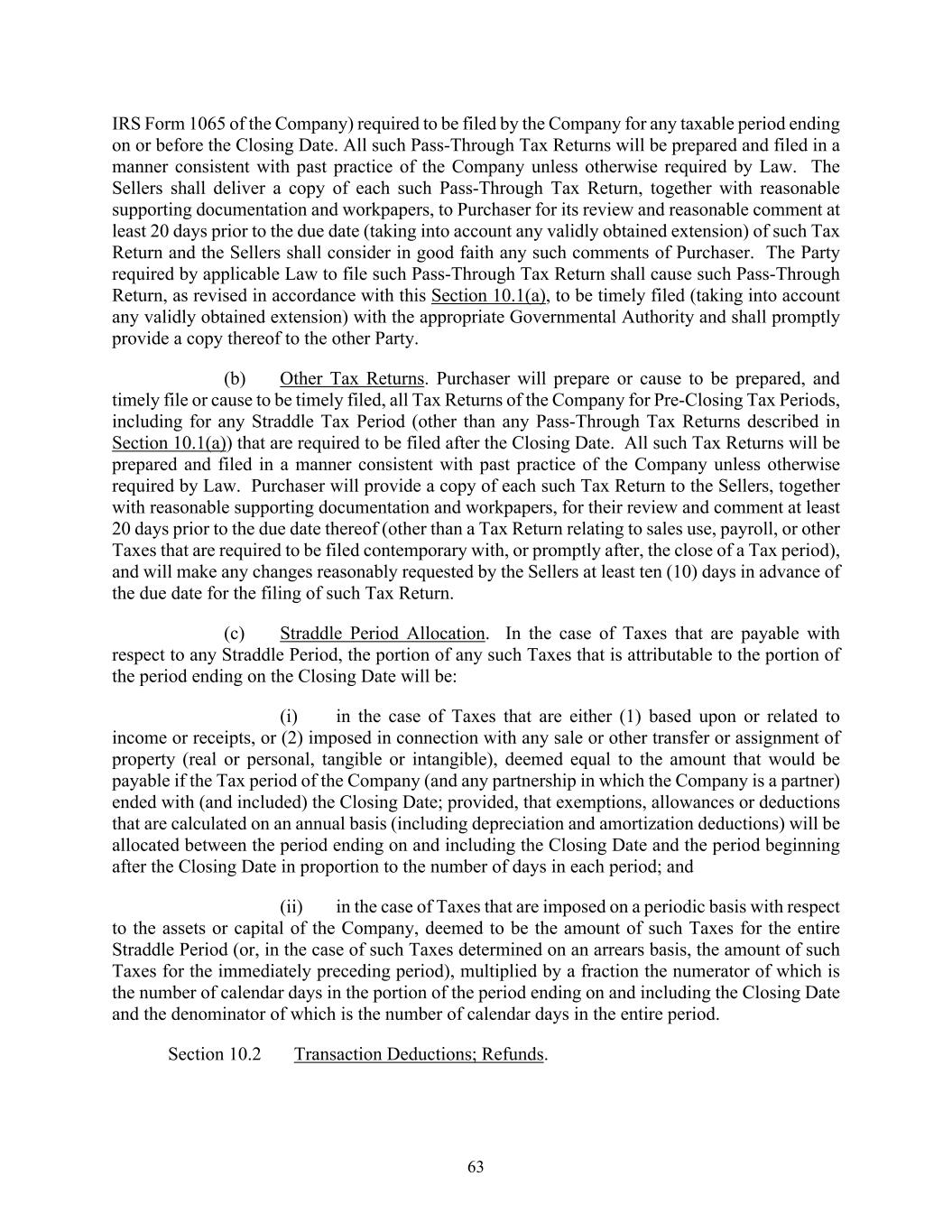 63 IRS Form 1065 of the Company) required to be filed by the Company for any taxable period ending on or before the Closing Date. All such Pass-Through Tax Returns will be prepared and filed in a manner consistent with past practice of the Company unless otherwise required by Law. The Sellers shall deliver a copy of each such Pass-Through Tax Return, together with reasonable supporting documentation and workpapers, to Purchaser for its review and reasonable comment at least 20 days prior to the due date (taking into account any validly obtained extension) of such Tax Return and the Sellers shall consider in good faith any such comments of Purchaser. The Party required by applicable Law to file such Pass-Through Tax Return shall cause such Pass-Through Return, as revised in accordance with this Section 10.1(a), to be timely filed (taking into account any validly obtained extension) with the appropriate Governmental Authority and shall promptly provide a copy thereof to the other Party. (b) Other Tax Returns. Purchaser will prepare or cause to be prepared, and timely file or cause to be timely filed, all Tax Returns of the Company for Pre-Closing Tax Periods, including for any Straddle Tax Period (other than any Pass-Through Tax Returns described in Section 10.1(a)) that are required to be filed after the Closing Date. All such Tax Returns will be prepared and filed in a manner consistent with past practice of the Company unless otherwise required by Law. Purchaser will provide a copy of each such Tax Return to the Sellers, together with reasonable supporting documentation and workpapers, for their review and comment at least 20 days prior to the due date thereof (other than a Tax Return relating to sales use, payroll, or other Taxes that are required to be filed contemporary with, or promptly after, the close of a Tax period), and will make any changes reasonably requested by the Sellers at least ten (10) days in advance of the due date for the filing of such Tax Return. (c) Straddle Period Allocation. In the case of Taxes that are payable with respect to any Straddle Period, the portion of any such Taxes that is attributable to the portion of the period ending on the Closing Date will be: (i) in the case of Taxes that are either (1) based upon or related to income or receipts, or (2) imposed in connection with any sale or other transfer or assignment of property (real or personal, tangible or intangible), deemed equal to the amount that would be payable if the Tax period of the Company (and any partnership in which the Company is a partner) ended with (and included) the Closing Date; provided, that exemptions, allowances or deductions that are calculated on an annual basis (including depreciation and amortization deductions) will be allocated between the period ending on and including the Closing Date and the period beginning after the Closing Date in proportion to the number of days in each period; and (ii) in the case of Taxes that are imposed on a periodic basis with respect to the assets or capital of the Company, deemed to be the amount of such Taxes for the entire Straddle Period (or, in the case of such Taxes determined on an arrears basis, the amount of such Taxes for the immediately preceding period), multiplied by a fraction the numerator of which is the number of calendar days in the portion of the period ending on and including the Closing Date and the denominator of which is the number of calendar days in the entire period. Section 10.2 Transaction Deductions; Refunds.