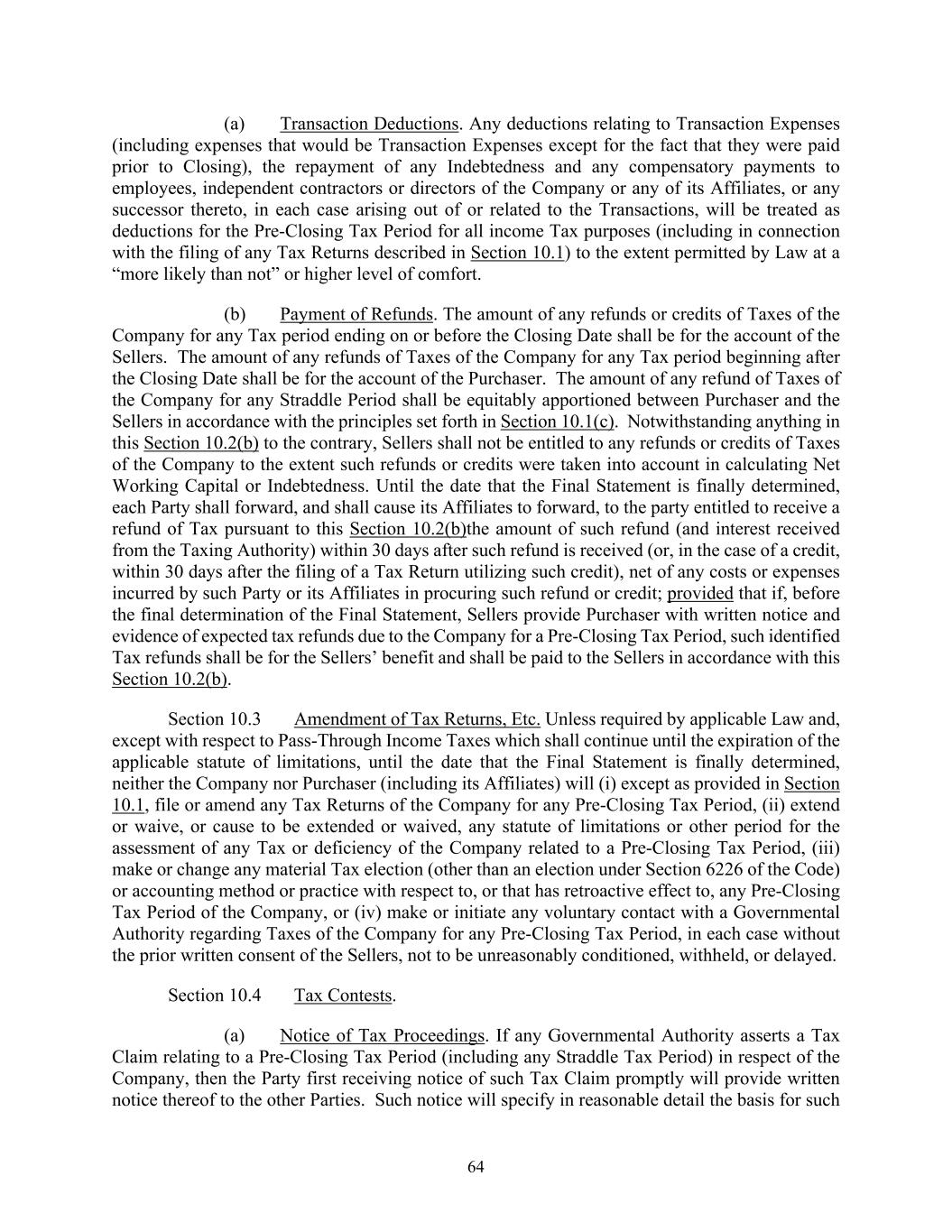 64 (a) Transaction Deductions. Any deductions relating to Transaction Expenses (including expenses that would be Transaction Expenses except for the fact that they were paid prior to Closing), the repayment of any Indebtedness and any compensatory payments to employees, independent contractors or directors of the Company or any of its Affiliates, or any successor thereto, in each case arising out of or related to the Transactions, will be treated as deductions for the Pre-Closing Tax Period for all income Tax purposes (including in connection with the filing of any Tax Returns described in Section 10.1) to the extent permitted by Law at a “more likely than not” or higher level of comfort. (b) Payment of Refunds. The amount of any refunds or credits of Taxes of the Company for any Tax period ending on or before the Closing Date shall be for the account of the Sellers. The amount of any refunds of Taxes of the Company for any Tax period beginning after the Closing Date shall be for the account of the Purchaser. The amount of any refund of Taxes of the Company for any Straddle Period shall be equitably apportioned between Purchaser and the Sellers in accordance with the principles set forth in Section 10.1(c). Notwithstanding anything in this Section 10.2(b) to the contrary, Sellers shall not be entitled to any refunds or credits of Taxes of the Company to the extent such refunds or credits were taken into account in calculating Net Working Capital or Indebtedness. Until the date that the Final Statement is finally determined, each Party shall forward, and shall cause its Affiliates to forward, to the party entitled to receive a refund of Tax pursuant to this Section 10.2(b)the amount of such refund (and interest received from the Taxing Authority) within 30 days after such refund is received (or, in the case of a credit, within 30 days after the filing of a Tax Return utilizing such credit), net of any costs or expenses incurred by such Party or its Affiliates in procuring such refund or credit; provided that if, before the final determination of the Final Statement, Sellers provide Purchaser with written notice and evidence of expected tax refunds due to the Company for a Pre-Closing Tax Period, such identified Tax refunds shall be for the Sellers’ benefit and shall be paid to the Sellers in accordance with this Section 10.2(b). Section 10.3 Amendment of Tax Returns, Etc. Unless required by applicable Law and, except with respect to Pass-Through Income Taxes which shall continue until the expiration of the applicable statute of limitations, until the date that the Final Statement is finally determined, neither the Company nor Purchaser (including its Affiliates) will (i) except as provided in Section 10.1, file or amend any Tax Returns of the Company for any Pre-Closing Tax Period, (ii) extend or waive, or cause to be extended or waived, any statute of limitations or other period for the assessment of any Tax or deficiency of the Company related to a Pre-Closing Tax Period, (iii) make or change any material Tax election (other than an election under Section 6226 of the Code) or accounting method or practice with respect to, or that has retroactive effect to, any Pre-Closing Tax Period of the Company, or (iv) make or initiate any voluntary contact with a Governmental Authority regarding Taxes of the Company for any Pre-Closing Tax Period, in each case without the prior written consent of the Sellers, not to be unreasonably conditioned, withheld, or delayed. Section 10.4 Tax Contests. (a) Notice of Tax Proceedings. If any Governmental Authority asserts a Tax Claim relating to a Pre-Closing Tax Period (including any Straddle Tax Period) in respect of the Company, then the Party first receiving notice of such Tax Claim promptly will provide written notice thereof to the other Parties. Such notice will specify in reasonable detail the basis for such