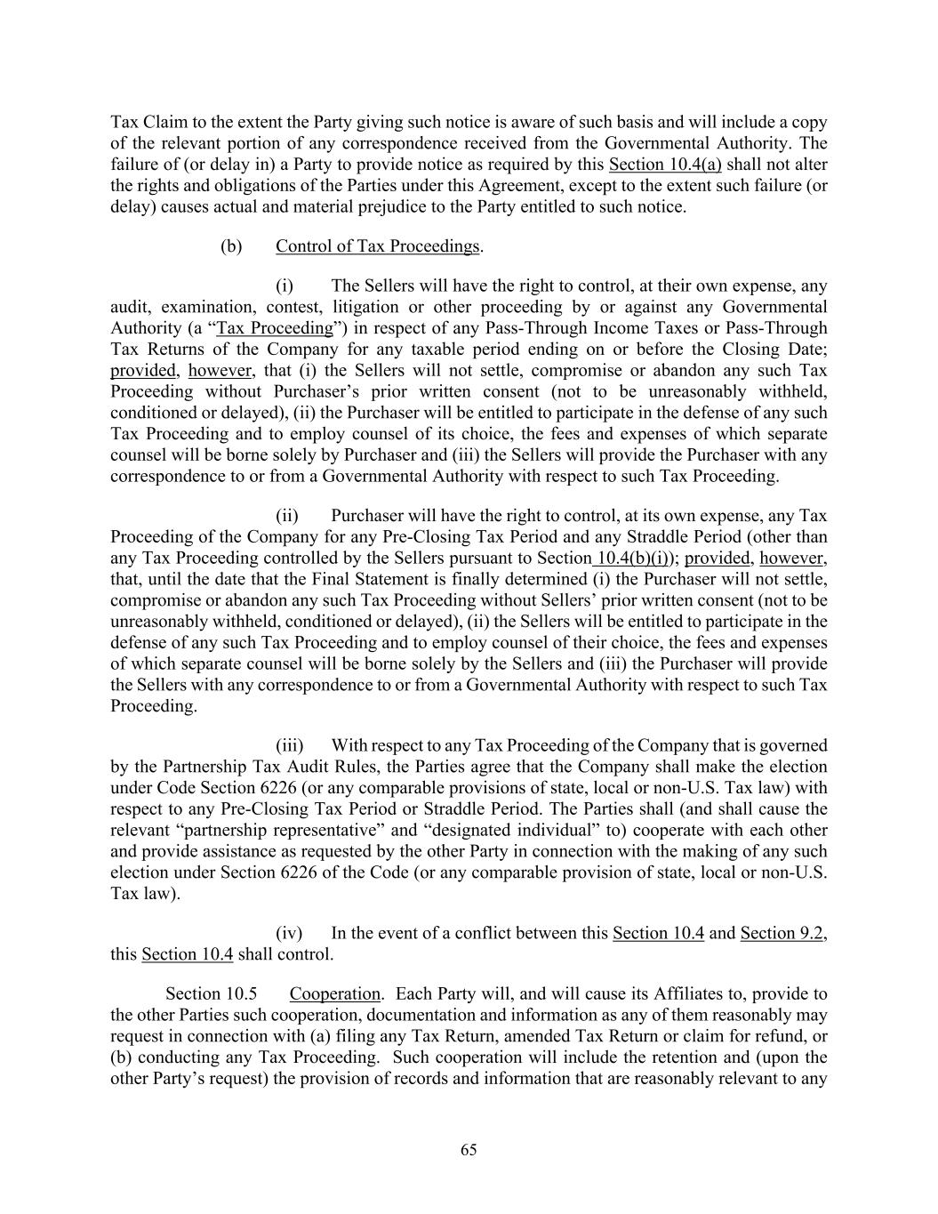 65 Tax Claim to the extent the Party giving such notice is aware of such basis and will include a copy of the relevant portion of any correspondence received from the Governmental Authority. The failure of (or delay in) a Party to provide notice as required by this Section 10.4(a) shall not alter the rights and obligations of the Parties under this Agreement, except to the extent such failure (or delay) causes actual and material prejudice to the Party entitled to such notice. (b) Control of Tax Proceedings. (i) The Sellers will have the right to control, at their own expense, any audit, examination, contest, litigation or other proceeding by or against any Governmental Authority (a “Tax Proceeding”) in respect of any Pass-Through Income Taxes or Pass-Through Tax Returns of the Company for any taxable period ending on or before the Closing Date; provided, however, that (i) the Sellers will not settle, compromise or abandon any such Tax Proceeding without Purchaser’s prior written consent (not to be unreasonably withheld, conditioned or delayed), (ii) the Purchaser will be entitled to participate in the defense of any such Tax Proceeding and to employ counsel of its choice, the fees and expenses of which separate counsel will be borne solely by Purchaser and (iii) the Sellers will provide the Purchaser with any correspondence to or from a Governmental Authority with respect to such Tax Proceeding. (ii) Purchaser will have the right to control, at its own expense, any Tax Proceeding of the Company for any Pre-Closing Tax Period and any Straddle Period (other than any Tax Proceeding controlled by the Sellers pursuant to Section 10.4(b)(i)); provided, however, that, until the date that the Final Statement is finally determined (i) the Purchaser will not settle, compromise or abandon any such Tax Proceeding without Sellers’ prior written consent (not to be unreasonably withheld, conditioned or delayed), (ii) the Sellers will be entitled to participate in the defense of any such Tax Proceeding and to employ counsel of their choice, the fees and expenses of which separate counsel will be borne solely by the Sellers and (iii) the Purchaser will provide the Sellers with any correspondence to or from a Governmental Authority with respect to such Tax Proceeding. (iii) With respect to any Tax Proceeding of the Company that is governed by the Partnership Tax Audit Rules, the Parties agree that the Company shall make the election under Code Section 6226 (or any comparable provisions of state, local or non-U.S. Tax law) with respect to any Pre-Closing Tax Period or Straddle Period. The Parties shall (and shall cause the relevant “partnership representative” and “designated individual” to) cooperate with each other and provide assistance as requested by the other Party in connection with the making of any such election under Section 6226 of the Code (or any comparable provision of state, local or non-U.S. Tax law). (iv) In the event of a conflict between this Section 10.4 and Section 9.2, this Section 10.4 shall control. Section 10.5 Cooperation. Each Party will, and will cause its Affiliates to, provide to the other Parties such cooperation, documentation and information as any of them reasonably may request in connection with (a) filing any Tax Return, amended Tax Return or claim for refund, or (b) conducting any Tax Proceeding. Such cooperation will include the retention and (upon the other Party’s request) the provision of records and information that are reasonably relevant to any