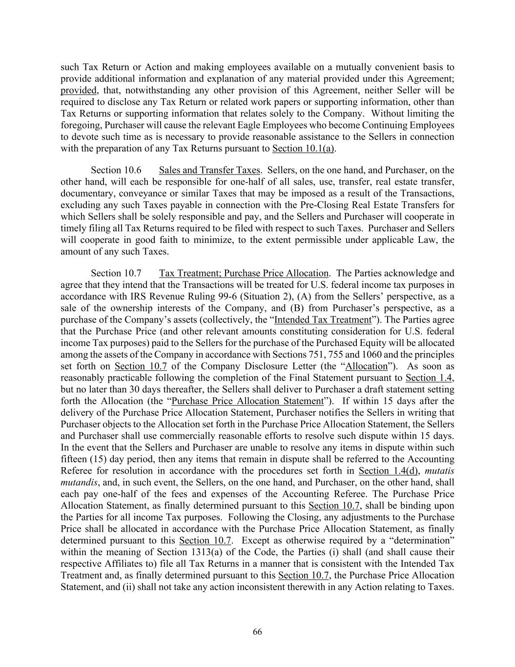 66 such Tax Return or Action and making employees available on a mutually convenient basis to provide additional information and explanation of any material provided under this Agreement; provided, that, notwithstanding any other provision of this Agreement, neither Seller will be required to disclose any Tax Return or related work papers or supporting information, other than Tax Returns or supporting information that relates solely to the Company. Without limiting the foregoing, Purchaser will cause the relevant Eagle Employees who become Continuing Employees to devote such time as is necessary to provide reasonable assistance to the Sellers in connection with the preparation of any Tax Returns pursuant to Section 10.1(a). Section 10.6 Sales and Transfer Taxes. Sellers, on the one hand, and Purchaser, on the other hand, will each be responsible for one-half of all sales, use, transfer, real estate transfer, documentary, conveyance or similar Taxes that may be imposed as a result of the Transactions, excluding any such Taxes payable in connection with the Pre-Closing Real Estate Transfers for which Sellers shall be solely responsible and pay, and the Sellers and Purchaser will cooperate in timely filing all Tax Returns required to be filed with respect to such Taxes. Purchaser and Sellers will cooperate in good faith to minimize, to the extent permissible under applicable Law, the amount of any such Taxes. Section 10.7 Tax Treatment; Purchase Price Allocation. The Parties acknowledge and agree that they intend that the Transactions will be treated for U.S. federal income tax purposes in accordance with IRS Revenue Ruling 99-6 (Situation 2), (A) from the Sellers’ perspective, as a sale of the ownership interests of the Company, and (B) from Purchaser’s perspective, as a purchase of the Company’s assets (collectively, the “Intended Tax Treatment”). The Parties agree that the Purchase Price (and other relevant amounts constituting consideration for U.S. federal income Tax purposes) paid to the Sellers for the purchase of the Purchased Equity will be allocated among the assets of the Company in accordance with Sections 751, 755 and 1060 and the principles set forth on Section 10.7 of the Company Disclosure Letter (the “Allocation”). As soon as reasonably practicable following the completion of the Final Statement pursuant to Section 1.4, but no later than 30 days thereafter, the Sellers shall deliver to Purchaser a draft statement setting forth the Allocation (the “Purchase Price Allocation Statement”). If within 15 days after the delivery of the Purchase Price Allocation Statement, Purchaser notifies the Sellers in writing that Purchaser objects to the Allocation set forth in the Purchase Price Allocation Statement, the Sellers and Purchaser shall use commercially reasonable efforts to resolve such dispute within 15 days. In the event that the Sellers and Purchaser are unable to resolve any items in dispute within such fifteen (15) day period, then any items that remain in dispute shall be referred to the Accounting Referee for resolution in accordance with the procedures set forth in Section 1.4(d), mutatis mutandis, and, in such event, the Sellers, on the one hand, and Purchaser, on the other hand, shall each pay one-half of the fees and expenses of the Accounting Referee. The Purchase Price Allocation Statement, as finally determined pursuant to this Section 10.7, shall be binding upon the Parties for all income Tax purposes. Following the Closing, any adjustments to the Purchase Price shall be allocated in accordance with the Purchase Price Allocation Statement, as finally determined pursuant to this Section 10.7. Except as otherwise required by a “determination” within the meaning of Section 1313(a) of the Code, the Parties (i) shall (and shall cause their respective Affiliates to) file all Tax Returns in a manner that is consistent with the Intended Tax Treatment and, as finally determined pursuant to this Section 10.7, the Purchase Price Allocation Statement, and (ii) shall not take any action inconsistent therewith in any Action relating to Taxes.