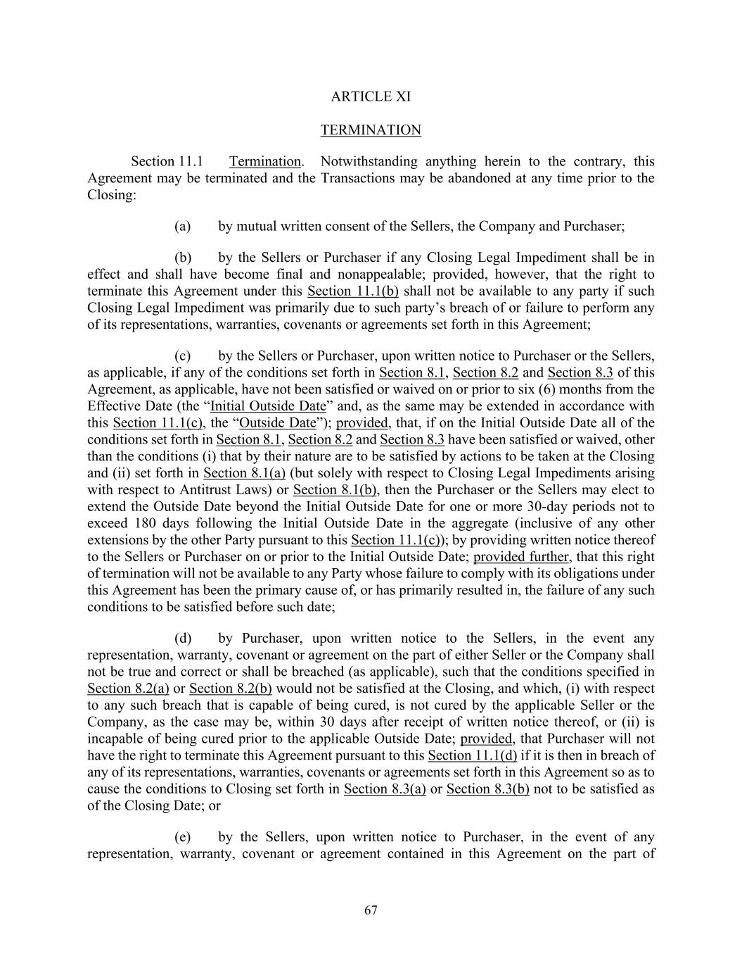 67 ARTICLE XI TERMINATION Section 11.1 Termination. Notwithstanding anything herein to the contrary, this Agreement may be terminated and the Transactions may be abandoned at any time prior to the Closing: (a) by mutual written consent of the Sellers, the Company and Purchaser; (b) by the Sellers or Purchaser if any Closing Legal Impediment shall be in effect and shall have become final and nonappealable; provided, however, that the right to terminate this Agreement under this Section 11.1(b) shall not be available to any party if such Closing Legal Impediment was primarily due to such party’s breach of or failure to perform any of its representations, warranties, covenants or agreements set forth in this Agreement; (c) by the Sellers or Purchaser, upon written notice to Purchaser or the Sellers, as applicable, if any of the conditions set forth in Section 8.1, Section 8.2 and Section 8.3 of this Agreement, as applicable, have not been satisfied or waived on or prior to six (6) months from the Effective Date (the “Initial Outside Date” and, as the same may be extended in accordance with this Section 11.1(c), the “Outside Date”); provided, that, if on the Initial Outside Date all of the conditions set forth in Section 8.1, Section 8.2 and Section 8.3 have been satisfied or waived, other than the conditions (i) that by their nature are to be satisfied by actions to be taken at the Closing and (ii) set forth in Section 8.1(a) (but solely with respect to Closing Legal Impediments arising with respect to Antitrust Laws) or Section 8.1(b), then the Purchaser or the Sellers may elect to extend the Outside Date beyond the Initial Outside Date for one or more 30-day periods not to exceed 180 days following the Initial Outside Date in the aggregate (inclusive of any other extensions by the other Party pursuant to this Section 11.1(c)); by providing written notice thereof to the Sellers or Purchaser on or prior to the Initial Outside Date; provided further, that this right of termination will not be available to any Party whose failure to comply with its obligations under this Agreement has been the primary cause of, or has primarily resulted in, the failure of any such conditions to be satisfied before such date; (d) by Purchaser, upon written notice to the Sellers, in the event any representation, warranty, covenant or agreement on the part of either Seller or the Company shall not be true and correct or shall be breached (as applicable), such that the conditions specified in Section 8.2(a) or Section 8.2(b) would not be satisfied at the Closing, and which, (i) with respect to any such breach that is capable of being cured, is not cured by the applicable Seller or the Company, as the case may be, within 30 days after receipt of written notice thereof, or (ii) is incapable of being cured prior to the applicable Outside Date; provided, that Purchaser will not have the right to terminate this Agreement pursuant to this Section 11.1(d) if it is then in breach of any of its representations, warranties, covenants or agreements set forth in this Agreement so as to cause the conditions to Closing set forth in Section 8.3(a) or Section 8.3(b) not to be satisfied as of the Closing Date; or (e) by the Sellers, upon written notice to Purchaser, in the event of any representation, warranty, covenant or agreement contained in this Agreement on the part of