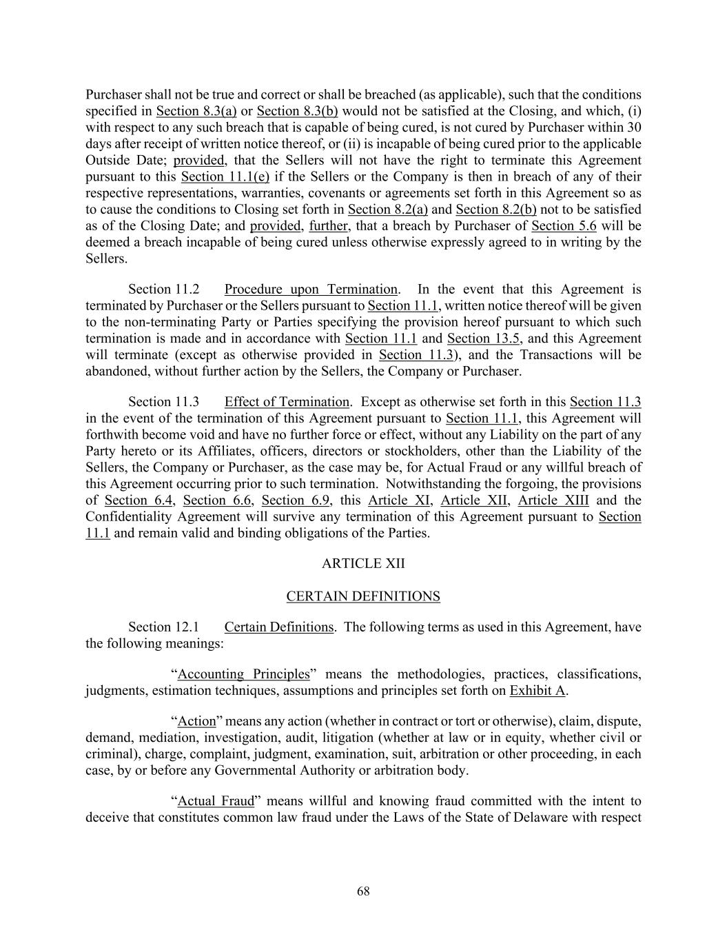 68 Purchaser shall not be true and correct or shall be breached (as applicable), such that the conditions specified in Section 8.3(a) or Section 8.3(b) would not be satisfied at the Closing, and which, (i) with respect to any such breach that is capable of being cured, is not cured by Purchaser within 30 days after receipt of written notice thereof, or (ii) is incapable of being cured prior to the applicable Outside Date; provided, that the Sellers will not have the right to terminate this Agreement pursuant to this Section 11.1(e) if the Sellers or the Company is then in breach of any of their respective representations, warranties, covenants or agreements set forth in this Agreement so as to cause the conditions to Closing set forth in Section 8.2(a) and Section 8.2(b) not to be satisfied as of the Closing Date; and provided, further, that a breach by Purchaser of Section 5.6 will be deemed a breach incapable of being cured unless otherwise expressly agreed to in writing by the Sellers. Section 11.2 Procedure upon Termination. In the event that this Agreement is terminated by Purchaser or the Sellers pursuant to Section 11.1, written notice thereof will be given to the non-terminating Party or Parties specifying the provision hereof pursuant to which such termination is made and in accordance with Section 11.1 and Section 13.5, and this Agreement will terminate (except as otherwise provided in Section 11.3), and the Transactions will be abandoned, without further action by the Sellers, the Company or Purchaser. Section 11.3 Effect of Termination. Except as otherwise set forth in this Section 11.3 in the event of the termination of this Agreement pursuant to Section 11.1, this Agreement will forthwith become void and have no further force or effect, without any Liability on the part of any Party hereto or its Affiliates, officers, directors or stockholders, other than the Liability of the Sellers, the Company or Purchaser, as the case may be, for Actual Fraud or any willful breach of this Agreement occurring prior to such termination. Notwithstanding the forgoing, the provisions of Section 6.4, Section 6.6, Section 6.9, this Article XI, Article XII, Article XIII and the Confidentiality Agreement will survive any termination of this Agreement pursuant to Section 11.1 and remain valid and binding obligations of the Parties. ARTICLE XII CERTAIN DEFINITIONS Section 12.1 Certain Definitions. The following terms as used in this Agreement, have the following meanings: “Accounting Principles” means the methodologies, practices, classifications, judgments, estimation techniques, assumptions and principles set forth on Exhibit A. “Action” means any action (whether in contract or tort or otherwise), claim, dispute, demand, mediation, investigation, audit, litigation (whether at law or in equity, whether civil or criminal), charge, complaint, judgment, examination, suit, arbitration or other proceeding, in each case, by or before any Governmental Authority or arbitration body. “Actual Fraud” means willful and knowing fraud committed with the intent to deceive that constitutes common law fraud under the Laws of the State of Delaware with respect