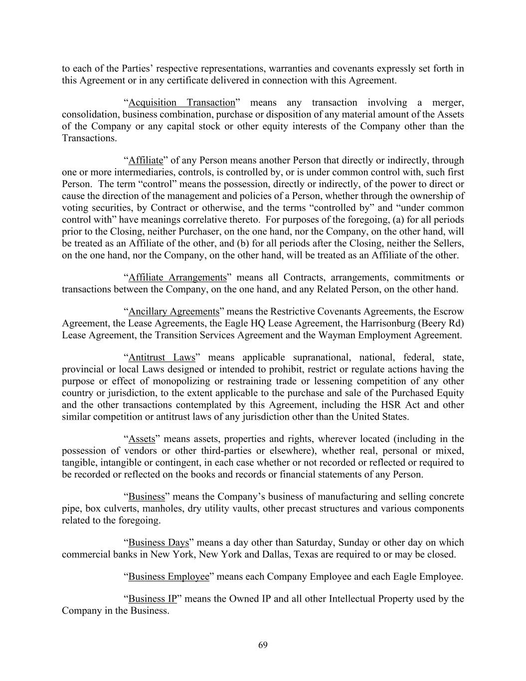 69 to each of the Parties’ respective representations, warranties and covenants expressly set forth in this Agreement or in any certificate delivered in connection with this Agreement. “Acquisition Transaction” means any transaction involving a merger, consolidation, business combination, purchase or disposition of any material amount of the Assets of the Company or any capital stock or other equity interests of the Company other than the Transactions. “Affiliate” of any Person means another Person that directly or indirectly, through one or more intermediaries, controls, is controlled by, or is under common control with, such first Person. The term “control” means the possession, directly or indirectly, of the power to direct or cause the direction of the management and policies of a Person, whether through the ownership of voting securities, by Contract or otherwise, and the terms “controlled by” and “under common control with” have meanings correlative thereto. For purposes of the foregoing, (a) for all periods prior to the Closing, neither Purchaser, on the one hand, nor the Company, on the other hand, will be treated as an Affiliate of the other, and (b) for all periods after the Closing, neither the Sellers, on the one hand, nor the Company, on the other hand, will be treated as an Affiliate of the other. “Affiliate Arrangements” means all Contracts, arrangements, commitments or transactions between the Company, on the one hand, and any Related Person, on the other hand. “Ancillary Agreements” means the Restrictive Covenants Agreements, the Escrow Agreement, the Lease Agreements, the Eagle HQ Lease Agreement, the Harrisonburg (Beery Rd) Lease Agreement, the Transition Services Agreement and the Wayman Employment Agreement. “Antitrust Laws” means applicable supranational, national, federal, state, provincial or local Laws designed or intended to prohibit, restrict or regulate actions having the purpose or effect of monopolizing or restraining trade or lessening competition of any other country or jurisdiction, to the extent applicable to the purchase and sale of the Purchased Equity and the other transactions contemplated by this Agreement, including the HSR Act and other similar competition or antitrust laws of any jurisdiction other than the United States. “Assets” means assets, properties and rights, wherever located (including in the possession of vendors or other third-parties or elsewhere), whether real, personal or mixed, tangible, intangible or contingent, in each case whether or not recorded or reflected or required to be recorded or reflected on the books and records or financial statements of any Person. “Business” means the Company’s business of manufacturing and selling concrete pipe, box culverts, manholes, dry utility vaults, other precast structures and various components related to the foregoing. “Business Days” means a day other than Saturday, Sunday or other day on which commercial banks in New York, New York and Dallas, Texas are required to or may be closed. “Business Employee” means each Company Employee and each Eagle Employee. “Business IP” means the Owned IP and all other Intellectual Property used by the Company in the Business.