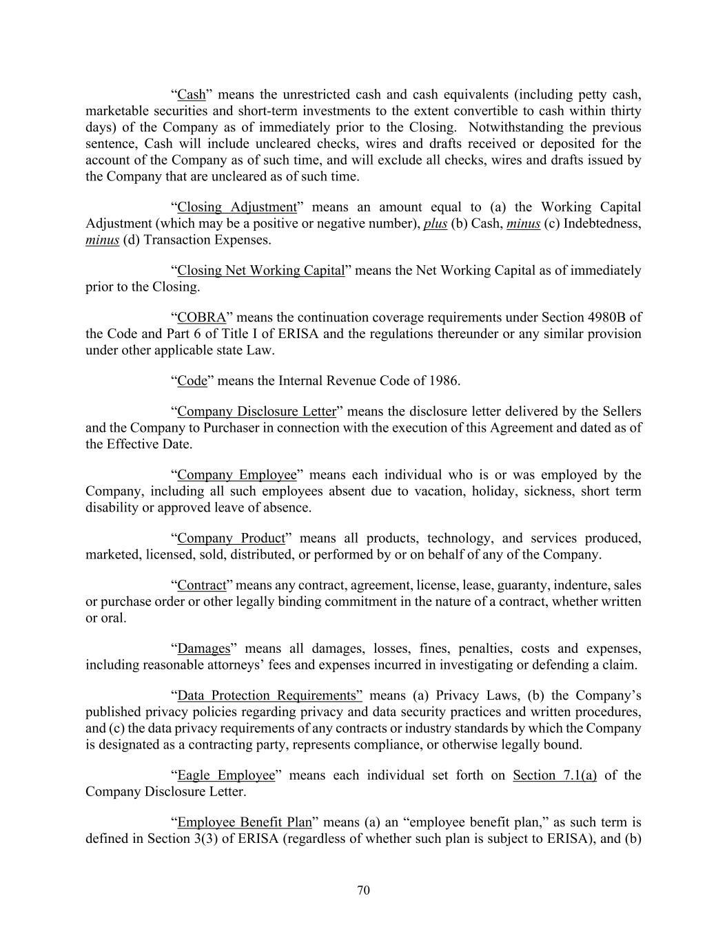 70 “Cash” means the unrestricted cash and cash equivalents (including petty cash, marketable securities and short-term investments to the extent convertible to cash within thirty days) of the Company as of immediately prior to the Closing. Notwithstanding the previous sentence, Cash will include uncleared checks, wires and drafts received or deposited for the account of the Company as of such time, and will exclude all checks, wires and drafts issued by the Company that are uncleared as of such time. “Closing Adjustment” means an amount equal to (a) the Working Capital Adjustment (which may be a positive or negative number), plus (b) Cash, minus (c) Indebtedness, minus (d) Transaction Expenses. “Closing Net Working Capital” means the Net Working Capital as of immediately prior to the Closing. “COBRA” means the continuation coverage requirements under Section 4980B of the Code and Part 6 of Title I of ERISA and the regulations thereunder or any similar provision under other applicable state Law. “Code” means the Internal Revenue Code of 1986. “Company Disclosure Letter” means the disclosure letter delivered by the Sellers and the Company to Purchaser in connection with the execution of this Agreement and dated as of the Effective Date. “Company Employee” means each individual who is or was employed by the Company, including all such employees absent due to vacation, holiday, sickness, short term disability or approved leave of absence. “Company Product” means all products, technology, and services produced, marketed, licensed, sold, distributed, or performed by or on behalf of any of the Company. “Contract” means any contract, agreement, license, lease, guaranty, indenture, sales or purchase order or other legally binding commitment in the nature of a contract, whether written or oral. “Damages” means all damages, losses, fines, penalties, costs and expenses, including reasonable attorneys’ fees and expenses incurred in investigating or defending a claim. “Data Protection Requirements” means (a) Privacy Laws, (b) the Company’s published privacy policies regarding privacy and data security practices and written procedures, and (c) the data privacy requirements of any contracts or industry standards by which the Company is designated as a contracting party, represents compliance, or otherwise legally bound. “Eagle Employee” means each individual set forth on Section 7.1(a) of the Company Disclosure Letter. “Employee Benefit Plan” means (a) an “employee benefit plan,” as such term is defined in Section 3(3) of ERISA (regardless of whether such plan is subject to ERISA), and (b)