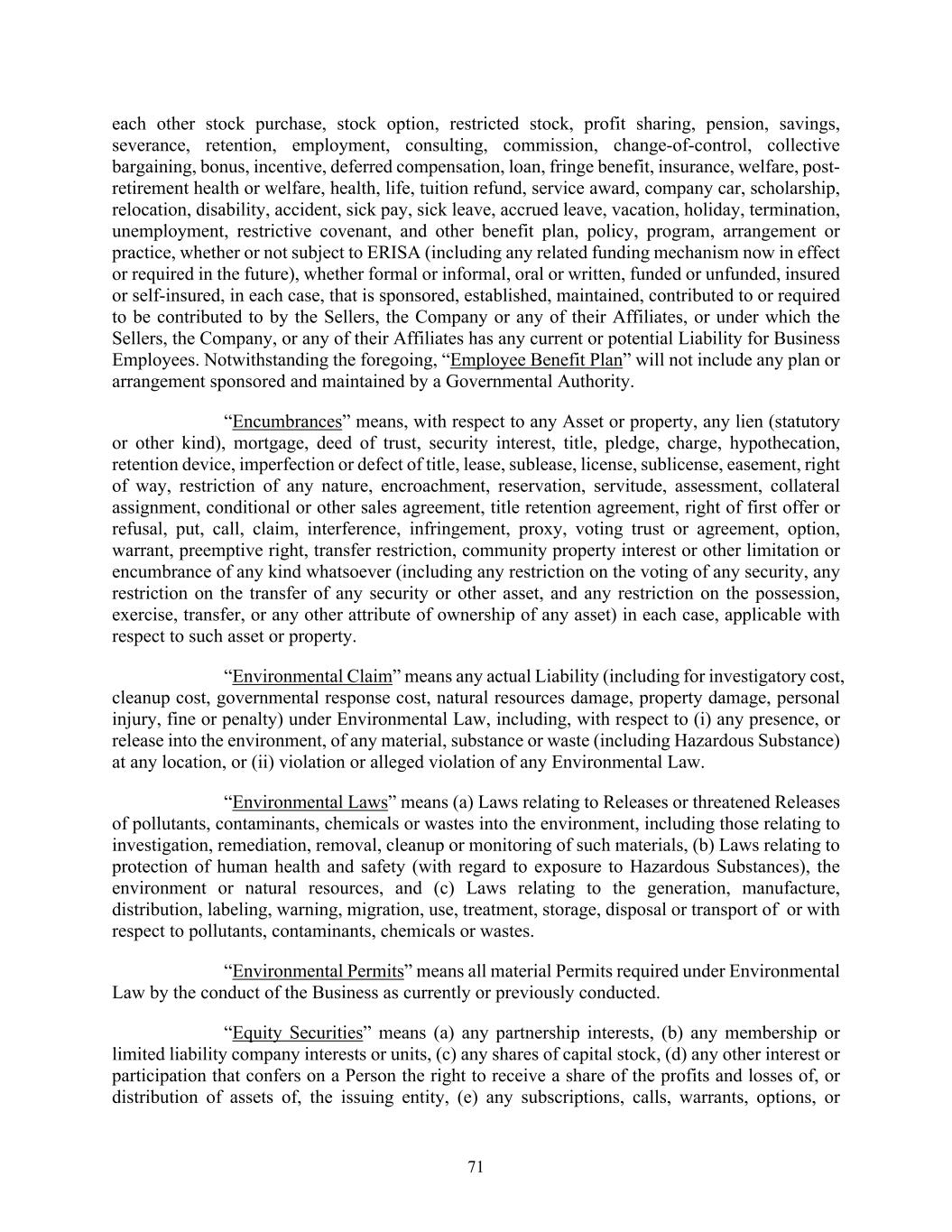 71 each other stock purchase, stock option, restricted stock, profit sharing, pension, savings, severance, retention, employment, consulting, commission, change-of-control, collective bargaining, bonus, incentive, deferred compensation, loan, fringe benefit, insurance, welfare, post- retirement health or welfare, health, life, tuition refund, service award, company car, scholarship, relocation, disability, accident, sick pay, sick leave, accrued leave, vacation, holiday, termination, unemployment, restrictive covenant, and other benefit plan, policy, program, arrangement or practice, whether or not subject to ERISA (including any related funding mechanism now in effect or required in the future), whether formal or informal, oral or written, funded or unfunded, insured or self-insured, in each case, that is sponsored, established, maintained, contributed to or required to be contributed to by the Sellers, the Company or any of their Affiliates, or under which the Sellers, the Company, or any of their Affiliates has any current or potential Liability for Business Employees. Notwithstanding the foregoing, “Employee Benefit Plan” will not include any plan or arrangement sponsored and maintained by a Governmental Authority. “Encumbrances” means, with respect to any Asset or property, any lien (statutory or other kind), mortgage, deed of trust, security interest, title, pledge, charge, hypothecation, retention device, imperfection or defect of title, lease, sublease, license, sublicense, easement, right of way, restriction of any nature, encroachment, reservation, servitude, assessment, collateral assignment, conditional or other sales agreement, title retention agreement, right of first offer or refusal, put, call, claim, interference, infringement, proxy, voting trust or agreement, option, warrant, preemptive right, transfer restriction, community property interest or other limitation or encumbrance of any kind whatsoever (including any restriction on the voting of any security, any restriction on the transfer of any security or other asset, and any restriction on the possession, exercise, transfer, or any other attribute of ownership of any asset) in each case, applicable with respect to such asset or property. “Environmental Claim” means any actual Liability (including for investigatory cost, cleanup cost, governmental response cost, natural resources damage, property damage, personal injury, fine or penalty) under Environmental Law, including, with respect to (i) any presence, or release into the environment, of any material, substance or waste (including Hazardous Substance) at any location, or (ii) violation or alleged violation of any Environmental Law. “Environmental Laws” means (a) Laws relating to Releases or threatened Releases of pollutants, contaminants, chemicals or wastes into the environment, including those relating to investigation, remediation, removal, cleanup or monitoring of such materials, (b) Laws relating to protection of human health and safety (with regard to exposure to Hazardous Substances), the environment or natural resources, and (c) Laws relating to the generation, manufacture, distribution, labeling, warning, migration, use, treatment, storage, disposal or transport of or with respect to pollutants, contaminants, chemicals or wastes. “Environmental Permits” means all material Permits required under Environmental Law by the conduct of the Business as currently or previously conducted. “Equity Securities” means (a) any partnership interests, (b) any membership or limited liability company interests or units, (c) any shares of capital stock, (d) any other interest or participation that confers on a Person the right to receive a share of the profits and losses of, or distribution of assets of, the issuing entity, (e) any subscriptions, calls, warrants, options, or