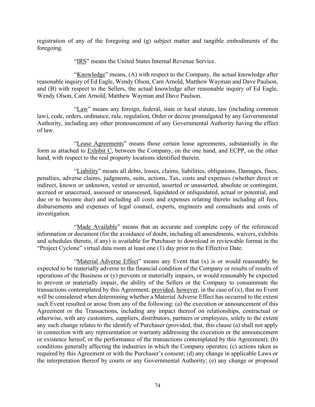 74 registration of any of the foregoing and (g) subject matter and tangible embodiments of the foregoing. “IRS” means the United States Internal Revenue Service. “Knowledge” means, (A) with respect to the Company, the actual knowledge after reasonable inquiry of Ed Eagle, Wendy Olson, Cam Arnold, Matthew Wayman and Dave Paulson, and (B) with respect to the Sellers, the actual knowledge after reasonable inquiry of Ed Eagle, Wendy Olson, Cam Arnold, Matthew Wayman and Dave Paulson. “Law” means any foreign, federal, state or local statute, law (including common law), code, orders, ordinance, rule, regulation, Order or decree promulgated by any Governmental Authority, including any other pronouncement of any Governmental Authority having the effect of law. “Lease Agreements” means those certain lease agreements, substantially in the form as attached to Exhibit C, between the Company, on the one hand, and ECPP, on the other hand, with respect to the real property locations identified therein. “Liability” means all debts, losses, claims, liabilities, obligations, Damages, fines, penalties, adverse claims, judgments, suits, actions, Tax, costs and expenses (whether direct or indirect, known or unknown, vested or unvested, asserted or unasserted, absolute or contingent, accrued or unaccrued, assessed or unassessed, liquidated or unliquidated, actual or potential, and due or to become due) and including all costs and expenses relating thereto including all fees, disbursements and expenses of legal counsel, experts, engineers and consultants and costs of investigation. “Made Available” means that an accurate and complete copy of the referenced information or document (for the avoidance of doubt, including all amendments, waivers, exhibits and schedules thereto, if any) is available for Purchaser to download in reviewable format in the “Project Cyclone” virtual data room at least one (1) day prior to the Effective Date. “Material Adverse Effect” means any Event that (x) is or would reasonably be expected to be materially adverse to the financial condition of the Company or results of results of operations of the Business or (y) prevents or materially impairs, or would reasonably be expected to prevent or materially impair, the ability of the Sellers or the Company to consummate the transactions contemplated by this Agreement; provided, however, in the case of (x), that no Event will be considered when determining whether a Material Adverse Effect has occurred to the extent such Event resulted or arose from any of the following: (a) the execution or announcement of this Agreement or the Transactions, including any impact thereof on relationships, contractual or otherwise, with any customers, suppliers, distributors, partners or employees, solely to the extent any such change relates to the identify of Purchaser (provided, that, this clause (a) shall not apply in connection with any representation or warranty addressing the execution or the announcement or existence hereof, or the performance of the transactions contemplated by this Agreement); (b) conditions generally affecting the industries in which the Company operates; (c) actions taken as required by this Agreement or with the Purchaser’s consent; (d) any change in applicable Laws or the interpretation thereof by courts or any Governmental Authority; (e) any change or proposed