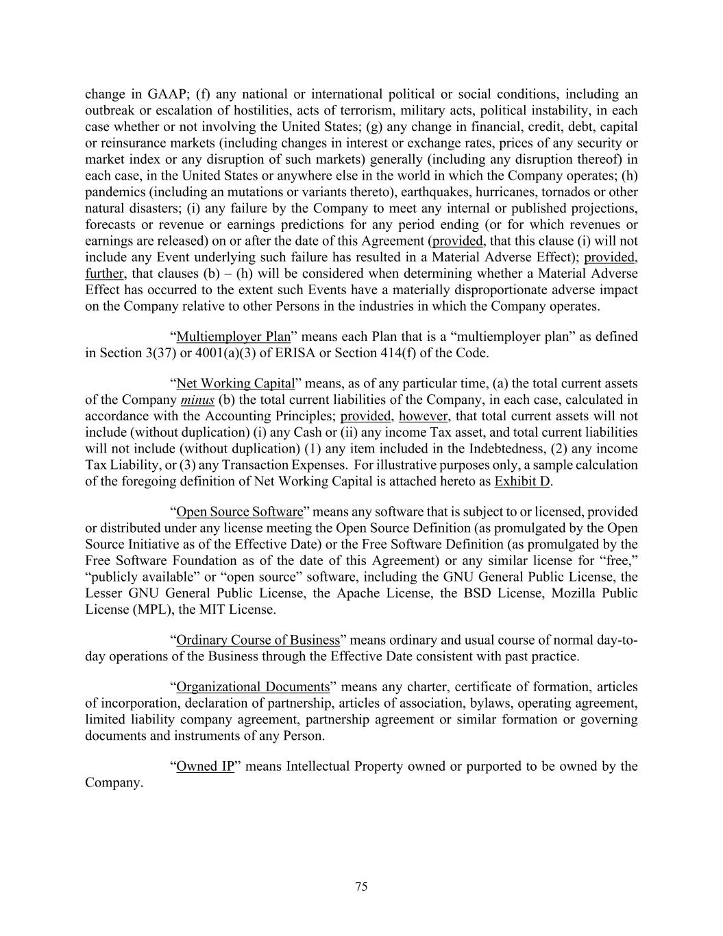 75 change in GAAP; (f) any national or international political or social conditions, including an outbreak or escalation of hostilities, acts of terrorism, military acts, political instability, in each case whether or not involving the United States; (g) any change in financial, credit, debt, capital or reinsurance markets (including changes in interest or exchange rates, prices of any security or market index or any disruption of such markets) generally (including any disruption thereof) in each case, in the United States or anywhere else in the world in which the Company operates; (h) pandemics (including an mutations or variants thereto), earthquakes, hurricanes, tornados or other natural disasters; (i) any failure by the Company to meet any internal or published projections, forecasts or revenue or earnings predictions for any period ending (or for which revenues or earnings are released) on or after the date of this Agreement (provided, that this clause (i) will not include any Event underlying such failure has resulted in a Material Adverse Effect); provided, further, that clauses (b) – (h) will be considered when determining whether a Material Adverse Effect has occurred to the extent such Events have a materially disproportionate adverse impact on the Company relative to other Persons in the industries in which the Company operates. “Multiemployer Plan” means each Plan that is a “multiemployer plan” as defined in Section 3(37) or 4001(a)(3) of ERISA or Section 414(f) of the Code. “Net Working Capital” means, as of any particular time, (a) the total current assets of the Company minus (b) the total current liabilities of the Company, in each case, calculated in accordance with the Accounting Principles; provided, however, that total current assets will not include (without duplication) (i) any Cash or (ii) any income Tax asset, and total current liabilities will not include (without duplication) (1) any item included in the Indebtedness, (2) any income Tax Liability, or (3) any Transaction Expenses. For illustrative purposes only, a sample calculation of the foregoing definition of Net Working Capital is attached hereto as Exhibit D. “Open Source Software” means any software that is subject to or licensed, provided or distributed under any license meeting the Open Source Definition (as promulgated by the Open Source Initiative as of the Effective Date) or the Free Software Definition (as promulgated by the Free Software Foundation as of the date of this Agreement) or any similar license for “free,” “publicly available” or “open source” software, including the GNU General Public License, the Lesser GNU General Public License, the Apache License, the BSD License, Mozilla Public License (MPL), the MIT License. “Ordinary Course of Business” means ordinary and usual course of normal day-to- day operations of the Business through the Effective Date consistent with past practice. “Organizational Documents” means any charter, certificate of formation, articles of incorporation, declaration of partnership, articles of association, bylaws, operating agreement, limited liability company agreement, partnership agreement or similar formation or governing documents and instruments of any Person. “Owned IP” means Intellectual Property owned or purported to be owned by the Company.