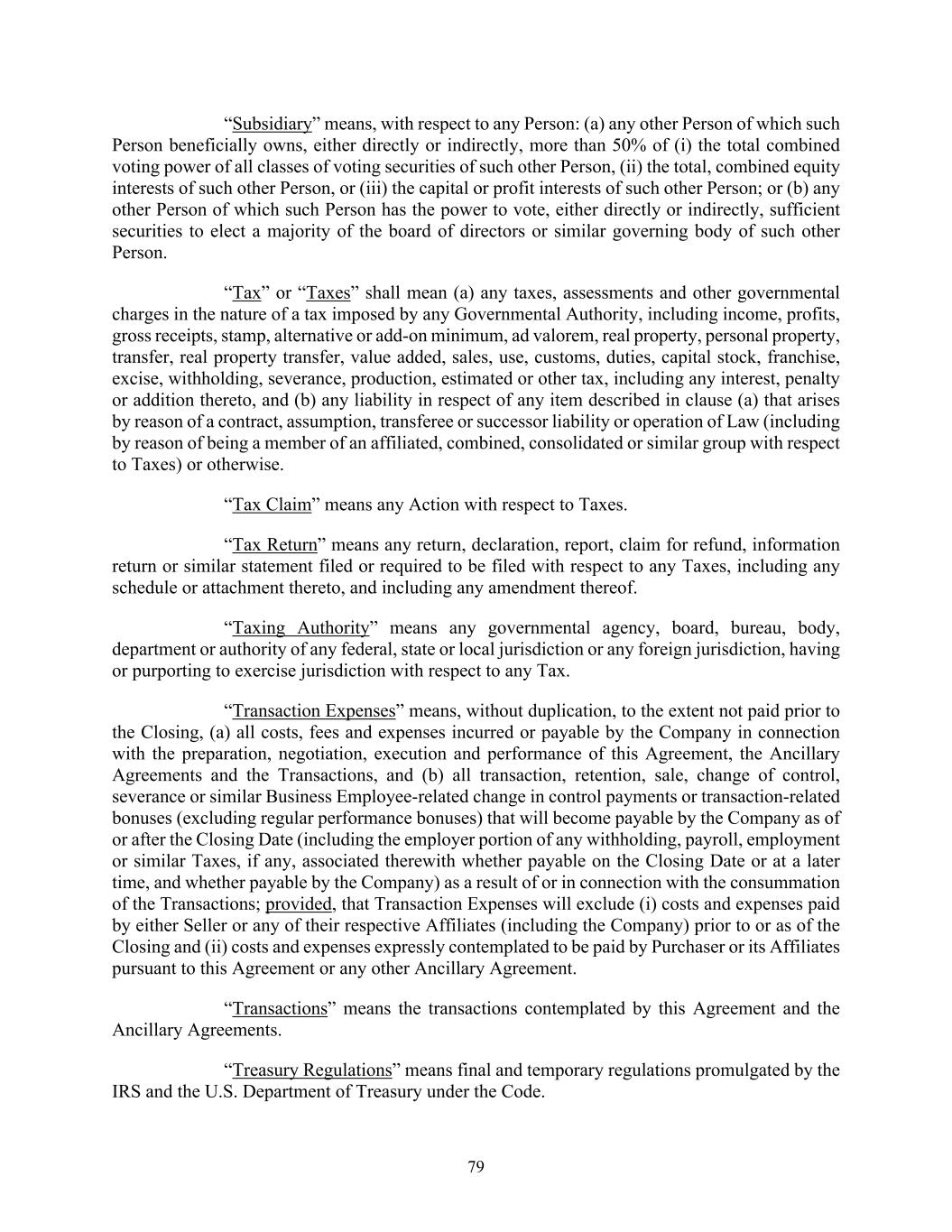 79 “Subsidiary” means, with respect to any Person: (a) any other Person of which such Person beneficially owns, either directly or indirectly, more than 50% of (i) the total combined voting power of all classes of voting securities of such other Person, (ii) the total, combined equity interests of such other Person, or (iii) the capital or profit interests of such other Person; or (b) any other Person of which such Person has the power to vote, either directly or indirectly, sufficient securities to elect a majority of the board of directors or similar governing body of such other Person. “Tax” or “Taxes” shall mean (a) any taxes, assessments and other governmental charges in the nature of a tax imposed by any Governmental Authority, including income, profits, gross receipts, stamp, alternative or add-on minimum, ad valorem, real property, personal property, transfer, real property transfer, value added, sales, use, customs, duties, capital stock, franchise, excise, withholding, severance, production, estimated or other tax, including any interest, penalty or addition thereto, and (b) any liability in respect of any item described in clause (a) that arises by reason of a contract, assumption, transferee or successor liability or operation of Law (including by reason of being a member of an affiliated, combined, consolidated or similar group with respect to Taxes) or otherwise. “Tax Claim” means any Action with respect to Taxes. “Tax Return” means any return, declaration, report, claim for refund, information return or similar statement filed or required to be filed with respect to any Taxes, including any schedule or attachment thereto, and including any amendment thereof. “Taxing Authority” means any governmental agency, board, bureau, body, department or authority of any federal, state or local jurisdiction or any foreign jurisdiction, having or purporting to exercise jurisdiction with respect to any Tax. “Transaction Expenses” means, without duplication, to the extent not paid prior to the Closing, (a) all costs, fees and expenses incurred or payable by the Company in connection with the preparation, negotiation, execution and performance of this Agreement, the Ancillary Agreements and the Transactions, and (b) all transaction, retention, sale, change of control, severance or similar Business Employee-related change in control payments or transaction-related bonuses (excluding regular performance bonuses) that will become payable by the Company as of or after the Closing Date (including the employer portion of any withholding, payroll, employment or similar Taxes, if any, associated therewith whether payable on the Closing Date or at a later time, and whether payable by the Company) as a result of or in connection with the consummation of the Transactions; provided, that Transaction Expenses will exclude (i) costs and expenses paid by either Seller or any of their respective Affiliates (including the Company) prior to or as of the Closing and (ii) costs and expenses expressly contemplated to be paid by Purchaser or its Affiliates pursuant to this Agreement or any other Ancillary Agreement. “Transactions” means the transactions contemplated by this Agreement and the Ancillary Agreements. “Treasury Regulations” means final and temporary regulations promulgated by the IRS and the U.S. Department of Treasury under the Code.