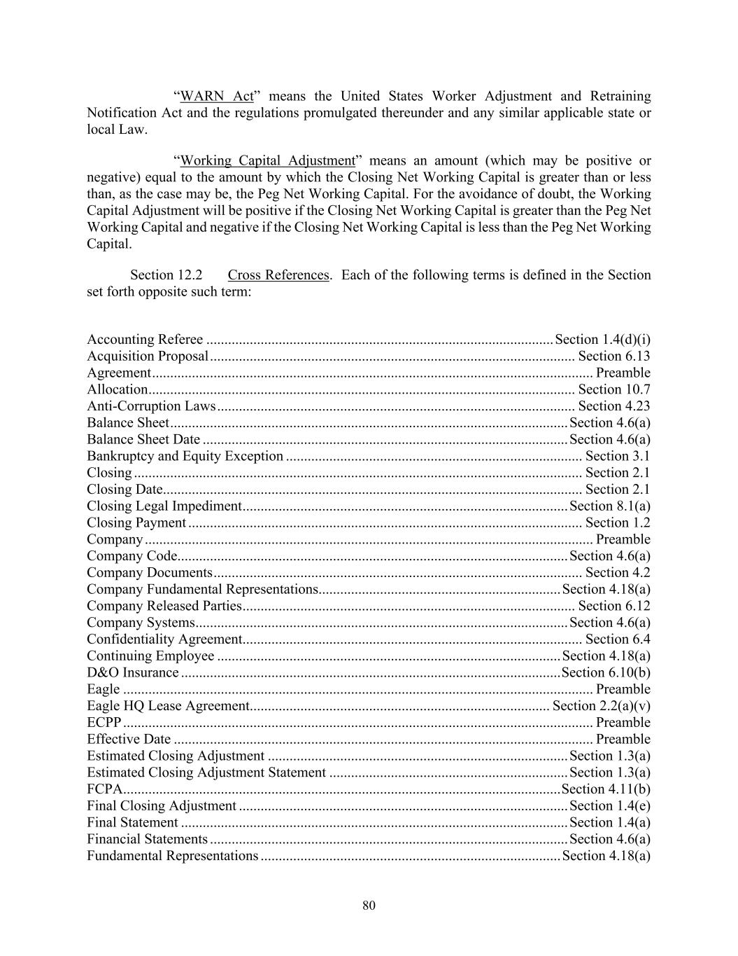 80 “WARN Act” means the United States Worker Adjustment and Retraining Notification Act and the regulations promulgated thereunder and any similar applicable state or local Law. “Working Capital Adjustment” means an amount (which may be positive or negative) equal to the amount by which the Closing Net Working Capital is greater than or less than, as the case may be, the Peg Net Working Capital. For the avoidance of doubt, the Working Capital Adjustment will be positive if the Closing Net Working Capital is greater than the Peg Net Working Capital and negative if the Closing Net Working Capital is less than the Peg Net Working Capital. Section 12.2 Cross References. Each of the following terms is defined in the Section set forth opposite such term: Accounting Referee ................................................................................................ Section 1.4(d)(i) Acquisition Proposal ..................................................................................................... Section 6.13 Agreement .......................................................................................................................... Preamble Allocation ...................................................................................................................... Section 10.7 Anti-Corruption Laws ................................................................................................... Section 4.23 Balance Sheet .............................................................................................................. Section 4.6(a) Balance Sheet Date ..................................................................................................... Section 4.6(a) Bankruptcy and Equity Exception .................................................................................. Section 3.1 Closing ............................................................................................................................ Section 2.1 Closing Date.................................................................................................................... Section 2.1 Closing Legal Impediment .......................................................................................... Section 8.1(a) Closing Payment ............................................................................................................. Section 1.2 Company ............................................................................................................................ Preamble Company Code............................................................................................................ Section 4.6(a) Company Documents ...................................................................................................... Section 4.2 Company Fundamental Representations................................................................... Section 4.18(a) Company Released Parties ............................................................................................ Section 6.12 Company Systems ....................................................................................................... Section 4.6(a) Confidentiality Agreement.............................................................................................. Section 6.4 Continuing Employee ............................................................................................... Section 4.18(a) D&O Insurance ......................................................................................................... Section 6.10(b) Eagle .................................................................................................................................. Preamble Eagle HQ Lease Agreement ................................................................................... Section 2.2(a)(v) ECPP .................................................................................................................................. Preamble Effective Date .................................................................................................................... Preamble Estimated Closing Adjustment ................................................................................... Section 1.3(a) Estimated Closing Adjustment Statement .................................................................. Section 1.3(a) FCPA......................................................................................................................... Section 4.11(b) Final Closing Adjustment ........................................................................................... Section 1.4(e) Final Statement ........................................................................................................... Section 1.4(a) Financial Statements ................................................................................................... Section 4.6(a) Fundamental Representations ................................................................................... Section 4.18(a)